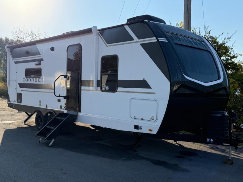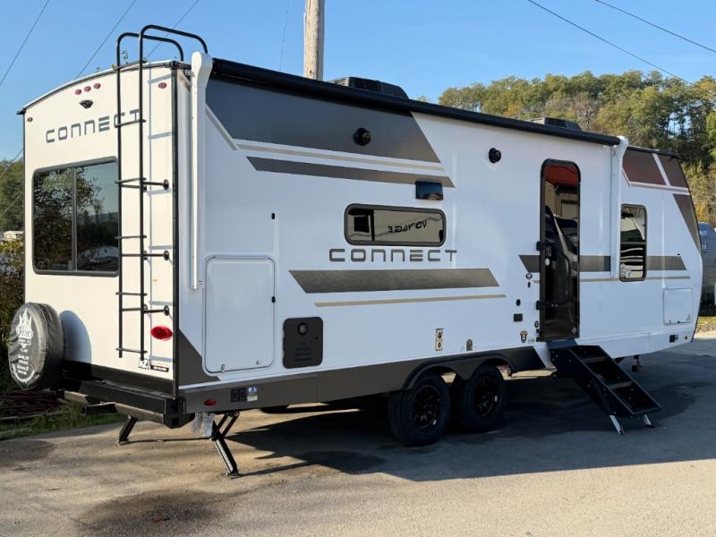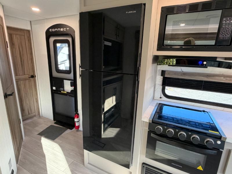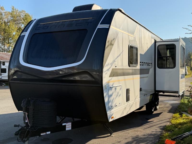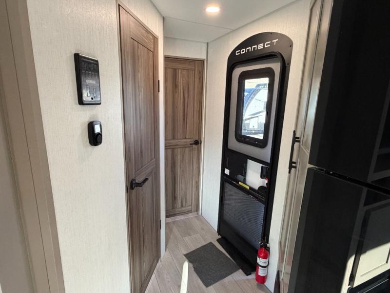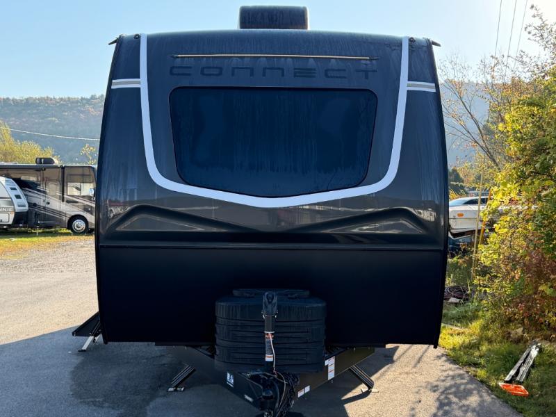 Hitch up this Connect travel trailer and head out for a fabulous weekend away! You will enjoy added space in the living area because of the single slide that holds the booth dinette, and another convenient feature is the dual-entry bathroom that can be accessed from the main hallway or the bedroom. You will be quite surprised to find a king-size bed inside the bedroom, along with dual wardrobes and a TV mount if you want to add a television. A pass-through storage on the exterior allows you to bring along extra gear, and the interior is kept cozy on chilly fall evenings with the 34" fireplace.