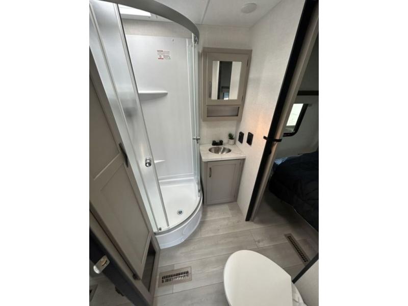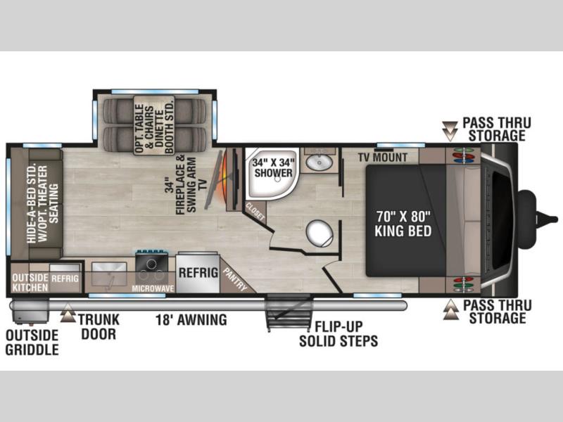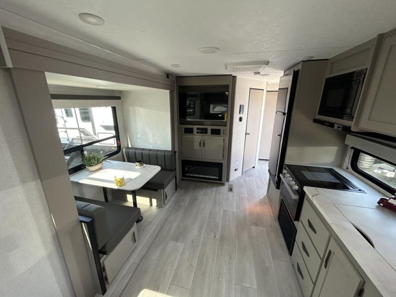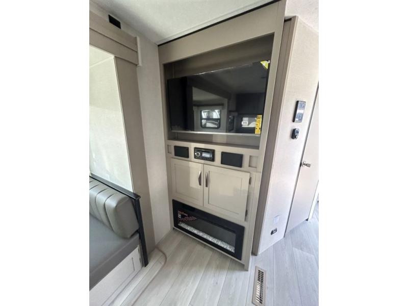 Hitch up this Connect travel trailer and head out for a fabulous weekend away! You will enjoy added space in the living area because of the single slide that holds the booth dinette, and another convenient feature is the dual-entry bathroom that can be accessed from the main hallway or the bedroom. You will be quite surprised to find a king-size bed inside the bedroom, along with dual wardrobes and a TV mount if you want to add a television. A pass-through storage on the exterior allows you to bring along extra gear, and the interior is kept cozy on chilly fall evenings with the 34" fireplace.