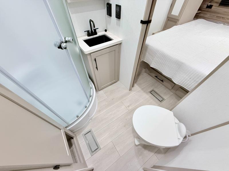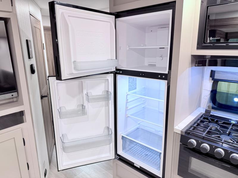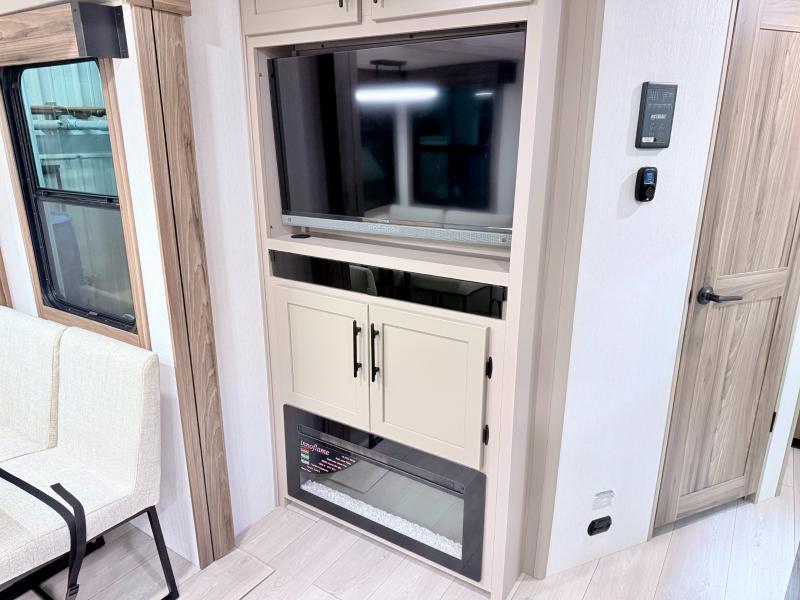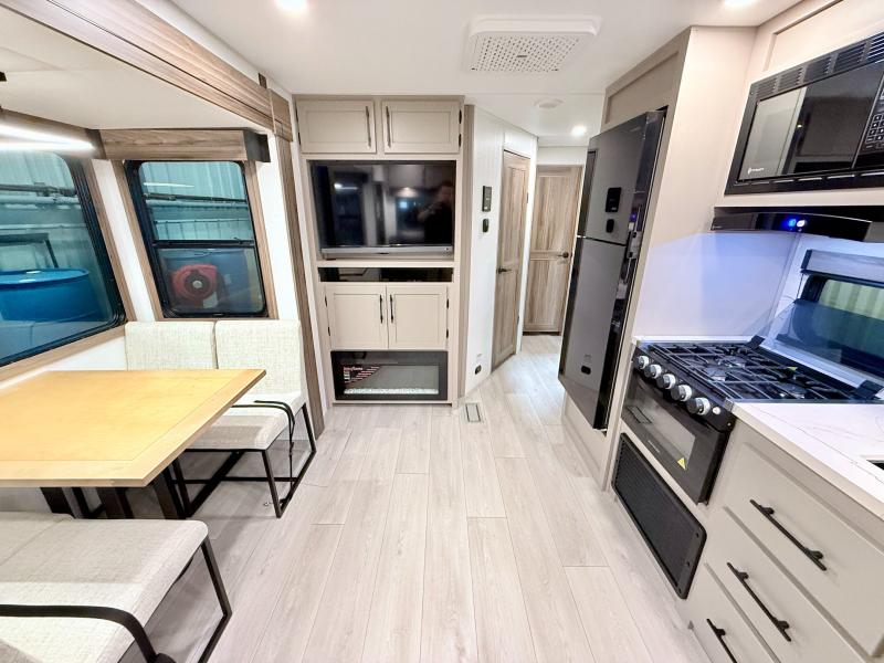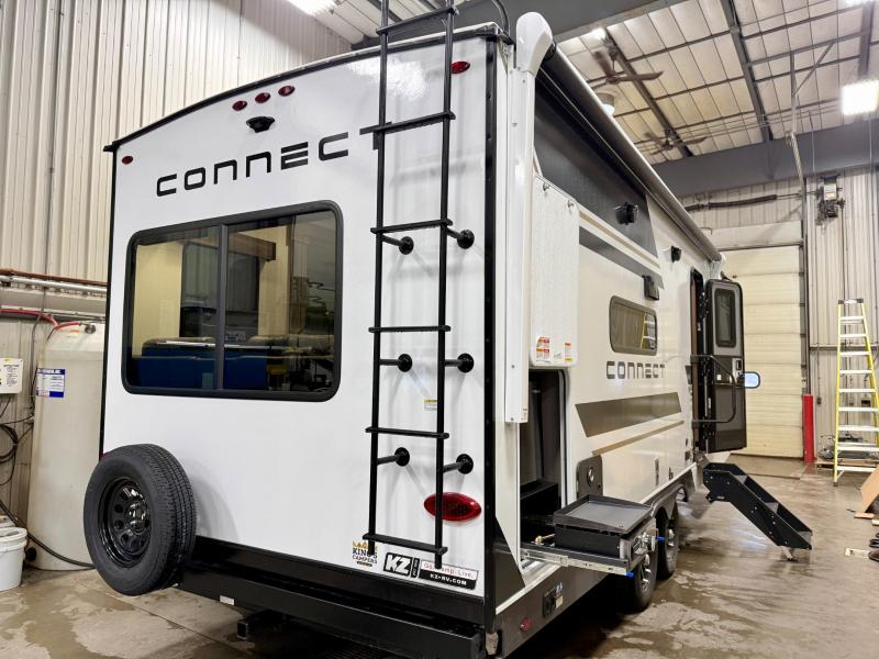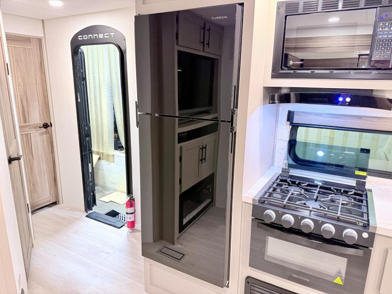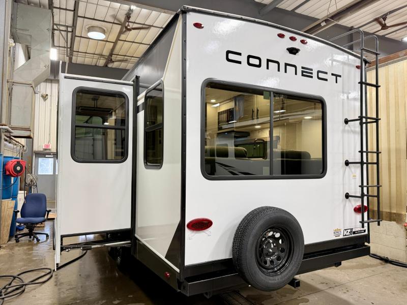 Hitch up this Connect travel trailer and head out for a fabulous weekend away! You will enjoy added space in the living area because of the single slide that holds the booth dinette, and another convenient feature is the dual-entry bathroom that can be accessed from the main hallway or the bedroom. You will be quite surprised to find a king-size bed inside the bedroom, along with dual wardrobes and a TV mount if you want to add a television. A pass-through storage on the exterior allows you to bring along extra gear, and the interior is kept cozy on chilly fall evenings with the 34" fireplace.