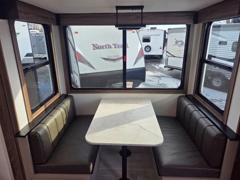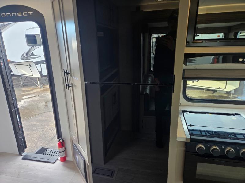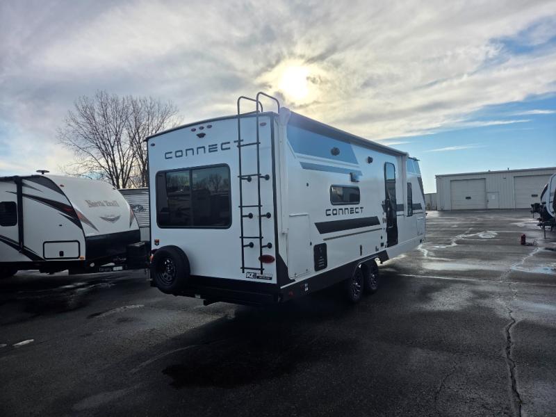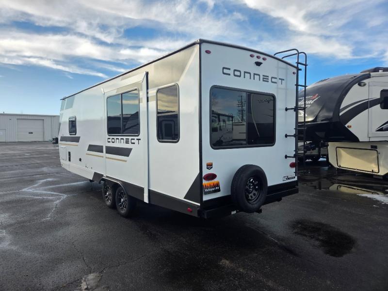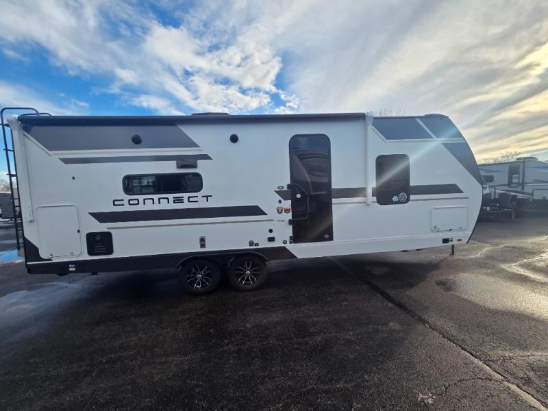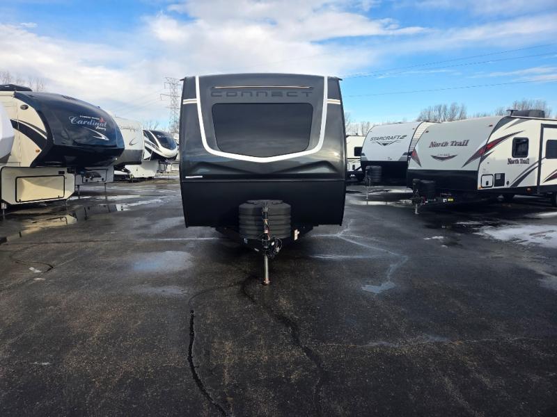 Hitch up this Connect travel trailer and head out for a fabulous weekend away! You will enjoy added space in the living area because of the single slide that holds the booth dinette, and another convenient feature is the dual-entry bathroom that can be accessed from the main hallway or the bedroom. You will be quite surprised to find a king-size bed inside the bedroom, along with dual wardrobes and a TV mount if you want to add a television. A pass-through storage on the exterior allows you to bring along extra gear, and the interior is kept cozy on chilly fall evenings with the 34" fireplace.