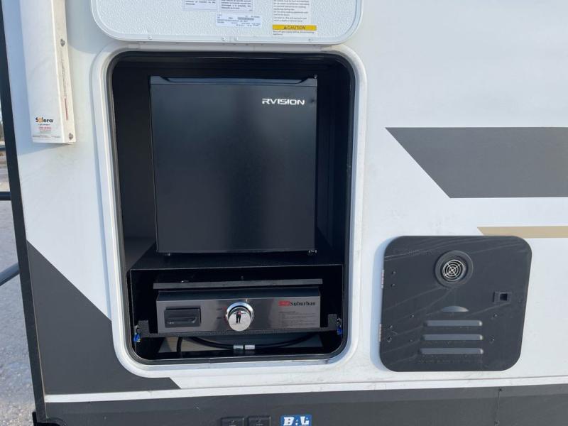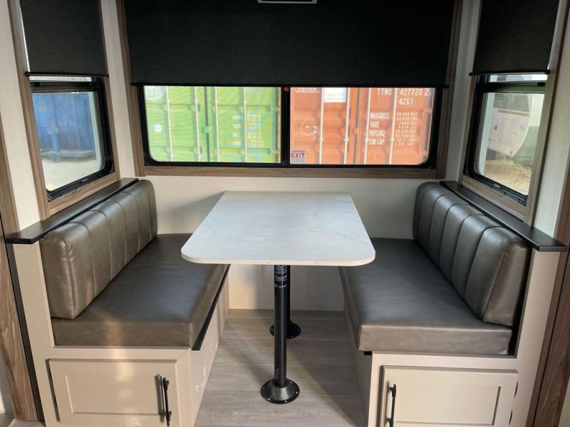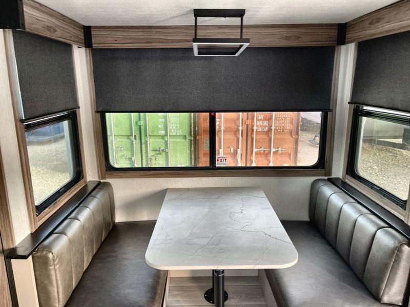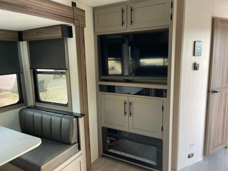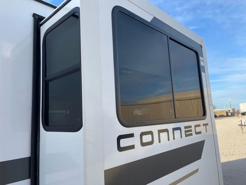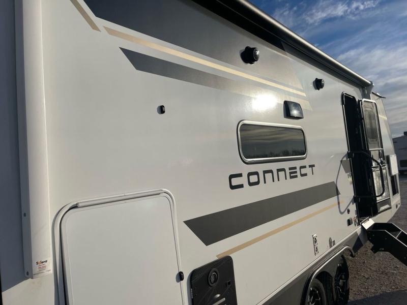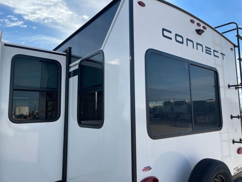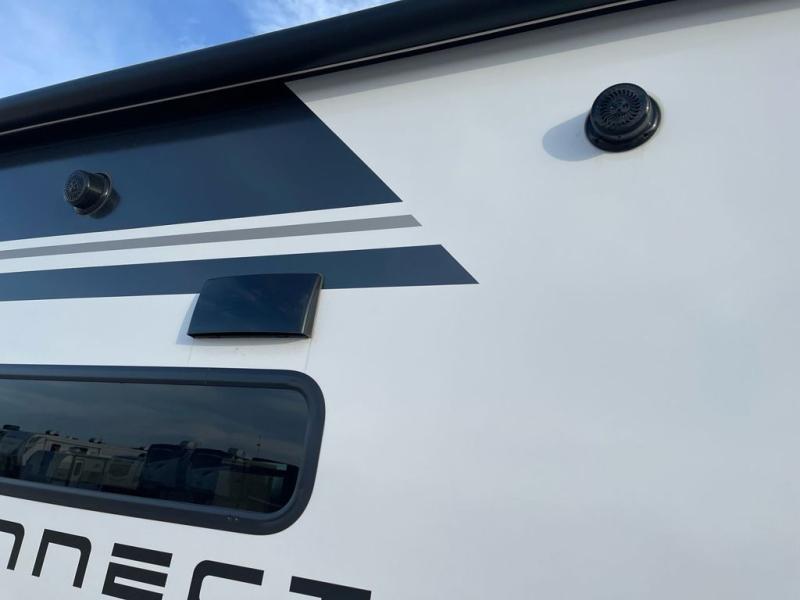 Hitch up this Connect travel trailer and head out for a fabulous weekend away! You will enjoy added space in the living area because of the single slide that holds the booth dinette, and another convenient feature is the dual-entry bathroom that can be accessed from the main hallway or the bedroom. You will be quite surprised to find a king-size bed inside the bedroom, along with dual wardrobes and a TV mount if you want to add a television. A pass-through storage on the exterior allows you to bring along extra gear, and the interior is kept cozy on chilly fall evenings with the 34" fireplace.