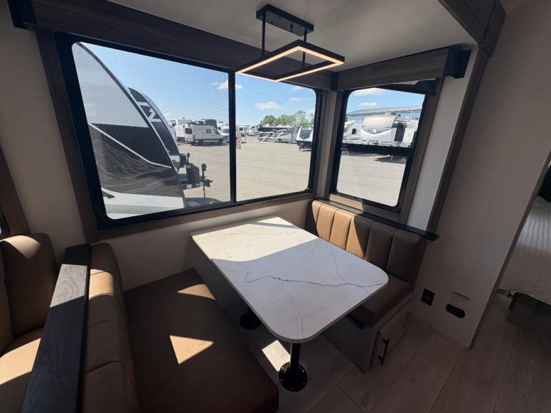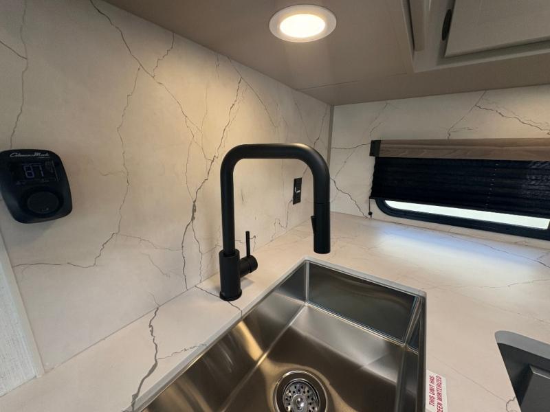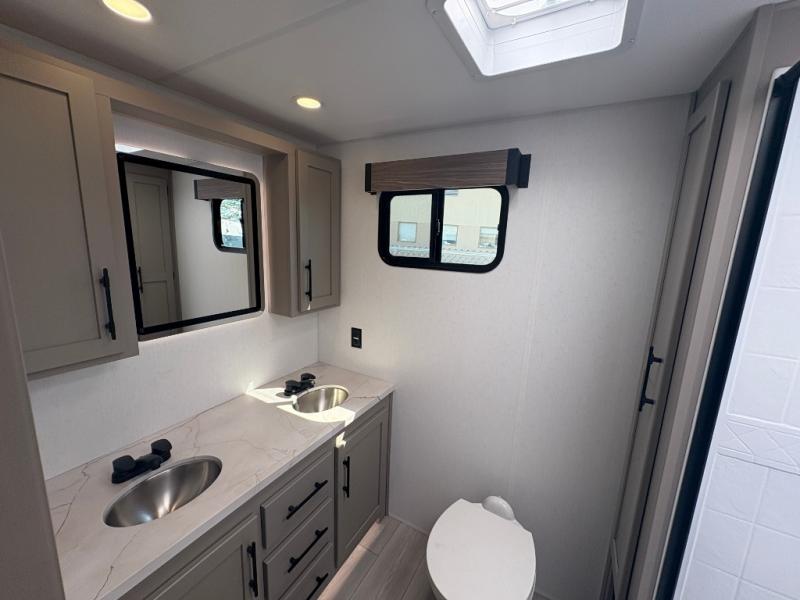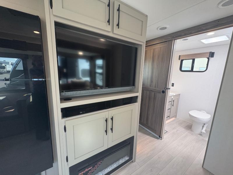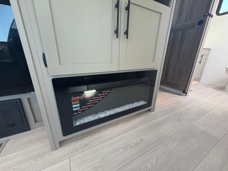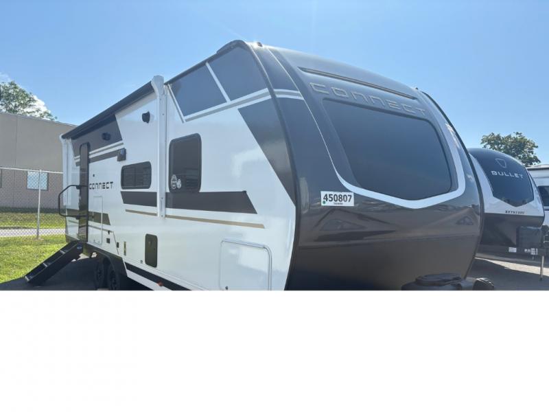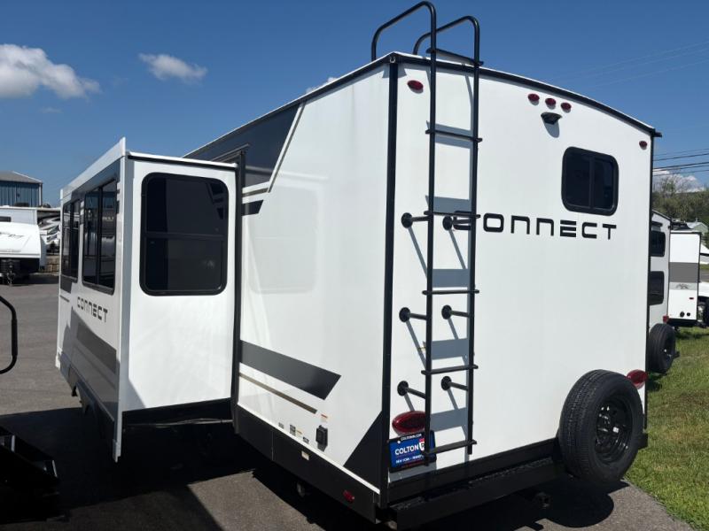 Your needs will be met and your desires will be fulfilled with this Connect travel trailer! Probably the thing you miss most when you camp is your comfortable bed back at home, and that's exactly why this trailer comes with a Serta Comfort foam king mattress in the private bedroom. The other thing you are prone to miss is your bathroom, and the full rear bathroom on this trailer is an excellent replacement with its 30" x 36" shower, skylight, linen closet, MaxxAir vent, porcelain foot-flush toilet, and dual sink vanity. Sit back on the hide-a-bed sofa and enjoy a night of relaxation in front of the LED TV and 34" fireplace. You can even grab a couple of drinks from the 10 cu. ft. 12V refrigerator, snacks from the walk-in pantry with coat hooks, or you can make it a fun evening by playing a game together at the booth dinette.