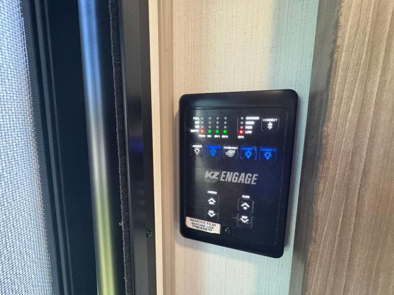 The KZ Connect travel trailer comes with an RV Airflow System which optimizes the airflow for your air conditioner by increasing the airflow by an average of 40%. This improves performance, speeds up cooling times, and reduces noise in your trailer. Some of the other helpful features found on the Connect are the heated, insulated, and enclosed underbelly, the exterior docking station, the fiberglass front cap with front windshield, the 82" interior ceiling height, and the protective front diamond plate. There are some useful technological features, like the two LED motion-sensor lights, the HDMI and USB charge, and the multi-media entertainment system with a DVD player. The KZ Engage is powered by OneControl, and it monitors battery levels and controls slide rooms, the leveling system, the awning, inside/outside lighting, and the TPMS prep.