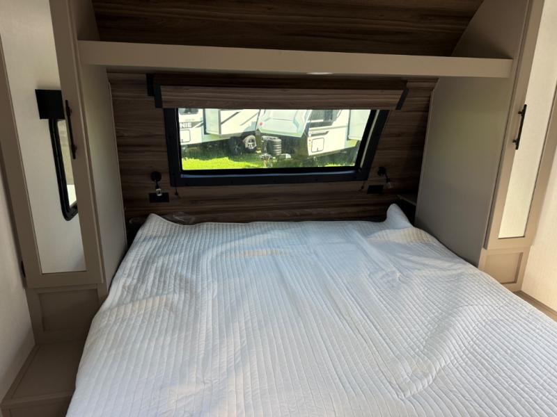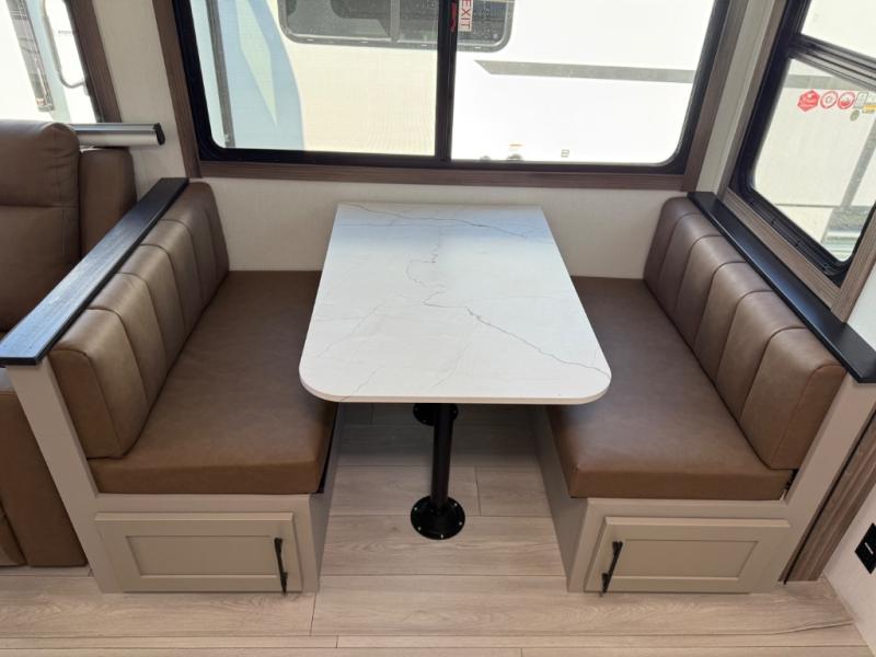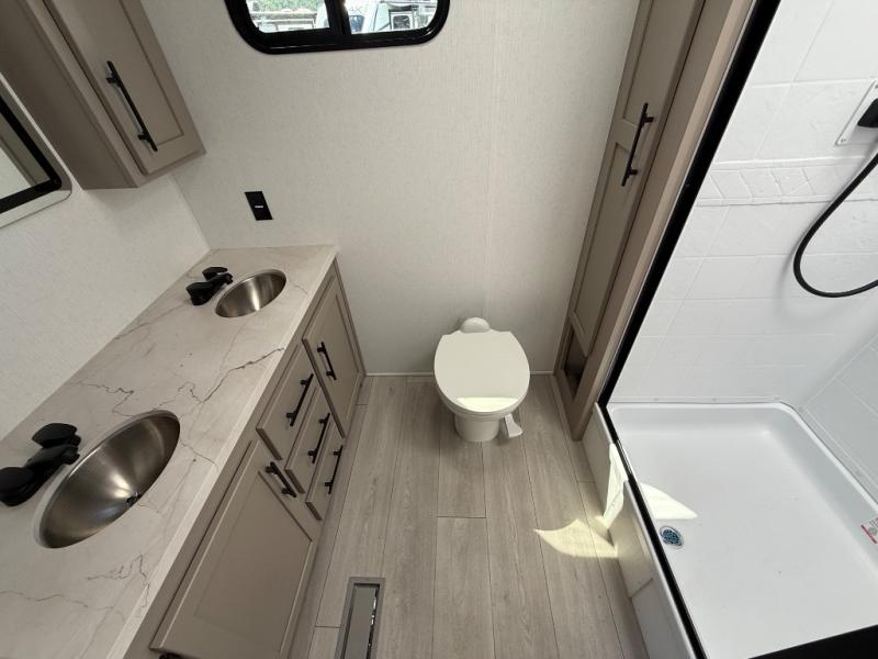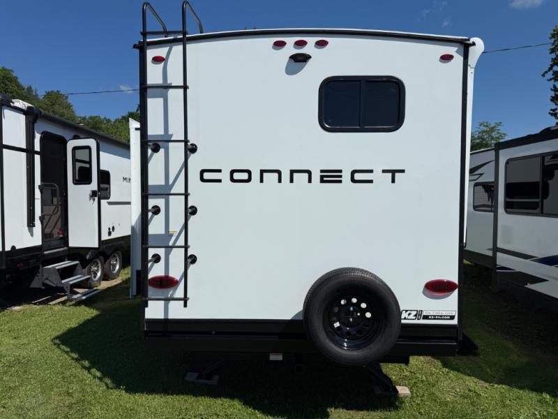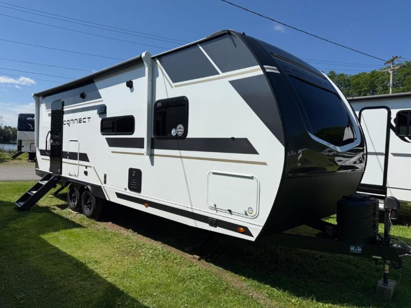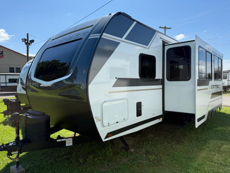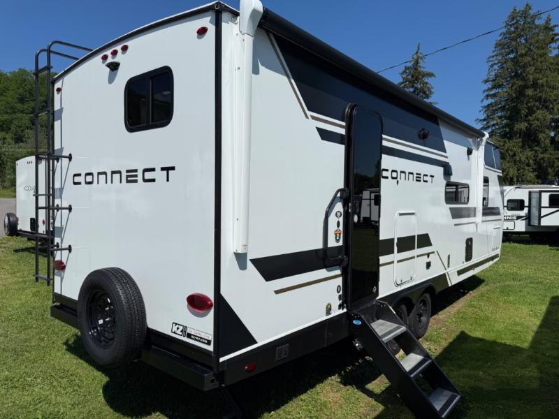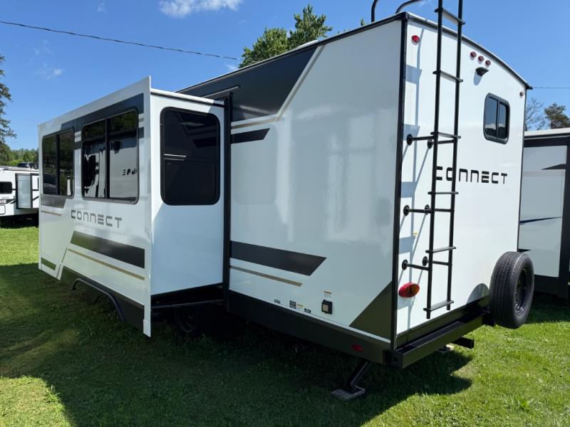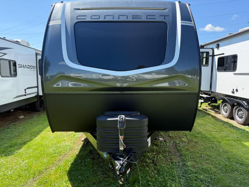 Your needs will be met and your desires will be fulfilled with this Connect travel trailer! Probably the thing you miss most when you camp is your comfortable bed back at home, and that's exactly why this trailer comes with a Serta Comfort foam king mattress in the private bedroom. The other thing you are prone to miss is your bathroom, and the full rear bathroom on this trailer is an excellent replacement with its 30" x 36" shower, skylight, linen closet, MaxxAir vent, porcelain foot-flush toilet, and dual sink vanity. Sit back on the hide-a-bed sofa and enjoy a night of relaxation in front of the LED TV and 34" fireplace. You can even grab a couple of drinks from the 10 cu. ft. 12V refrigerator, snacks from the walk-in pantry with coat hooks, or you can make it a fun evening by playing a game together at the booth dinette.