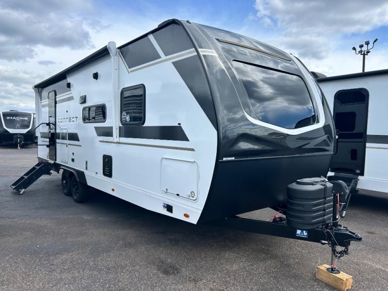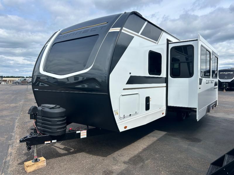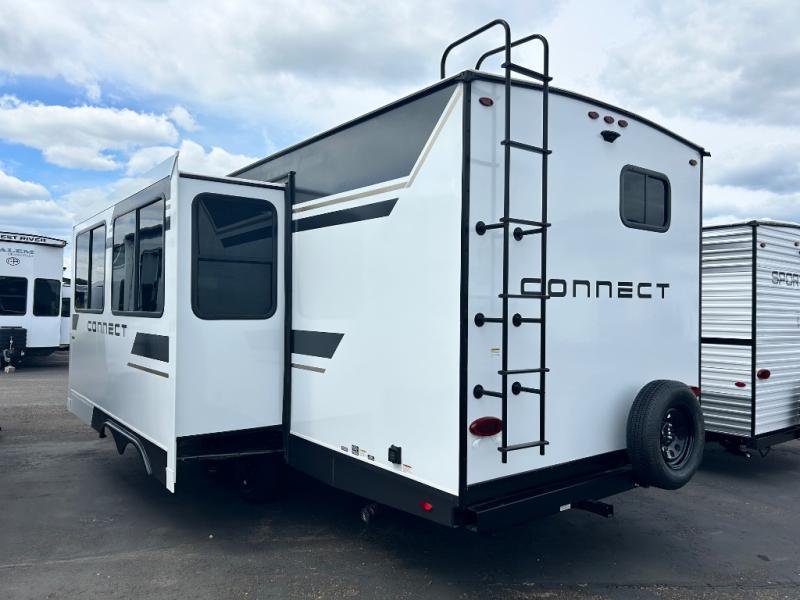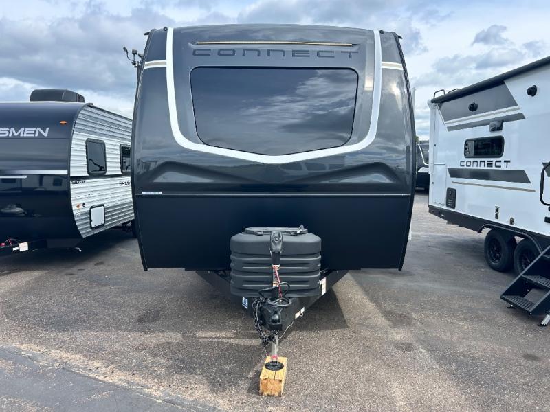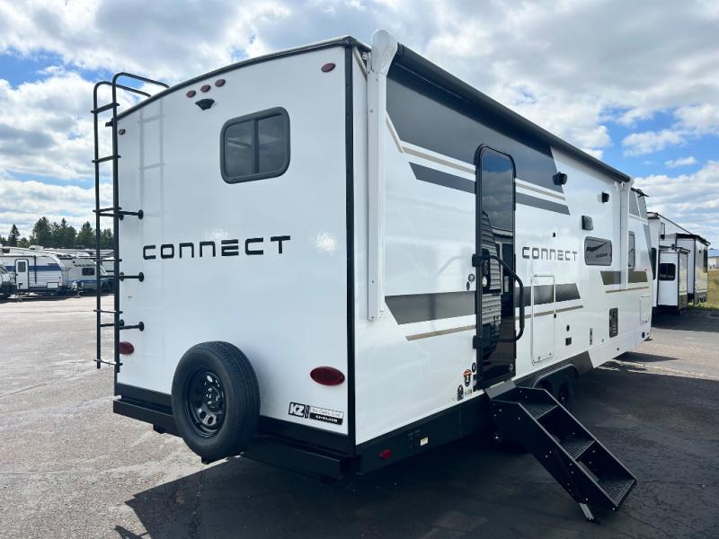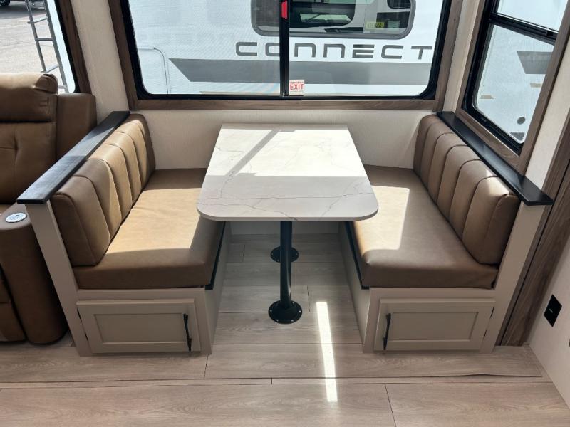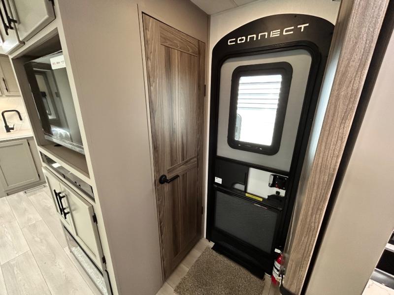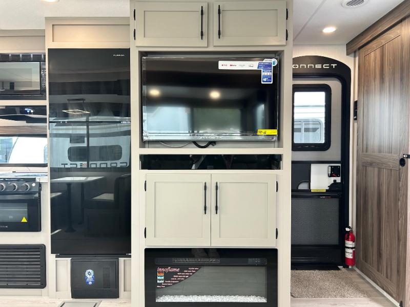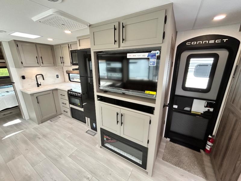 Your needs will be met and your desires will be fulfilled with this Connect travel trailer! Probably the thing you miss most when you camp is your comfortable bed back at home, and that's exactly why this trailer comes with a Serta Comfort foam king mattress in the private bedroom. The other thing you are prone to miss is your bathroom, and the full rear bathroom on this trailer is an excellent replacement with its 30" x 36" shower, skylight, linen closet, MaxxAir vent, porcelain foot-flush toilet, and dual sink vanity. Sit back on the hide-a-bed sofa and enjoy a night of relaxation in front of the LED TV and 34" fireplace. You can even grab a couple of drinks from the 10 cu. ft. 12V refrigerator, snacks from the walk-in pantry with coat hooks, or you can make it a fun evening by playing a game together at the booth dinette.