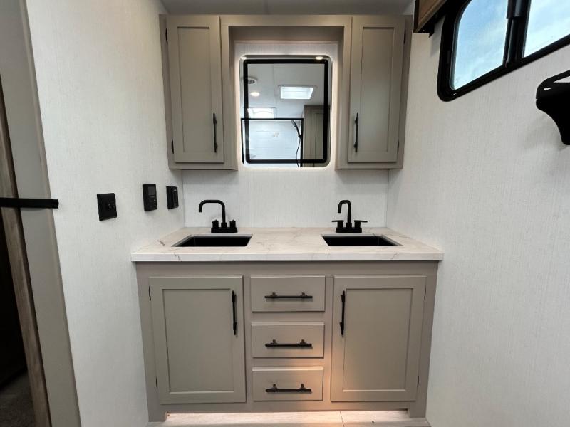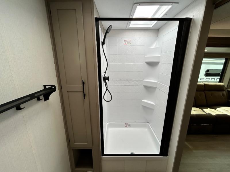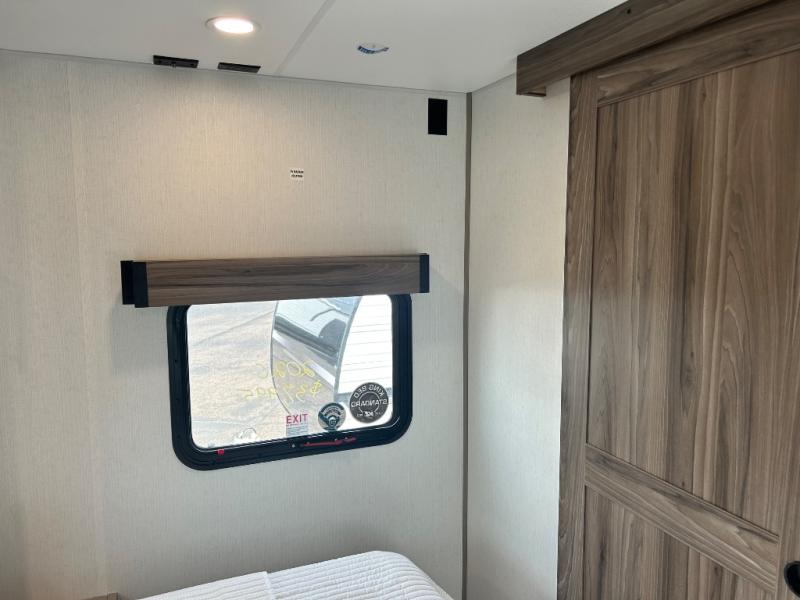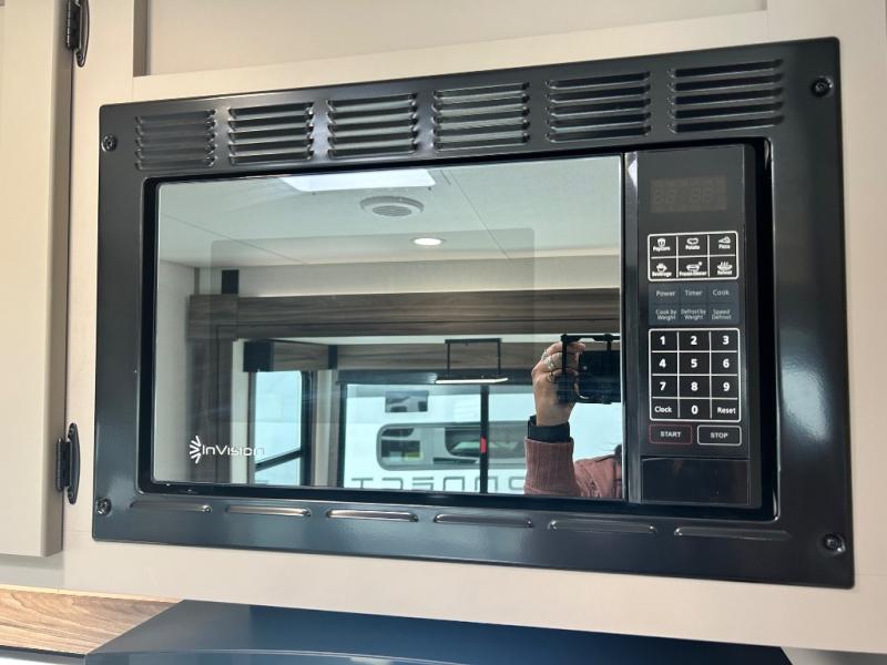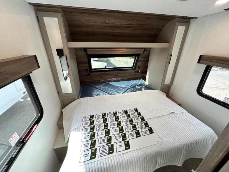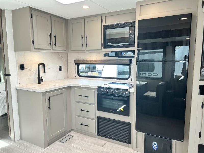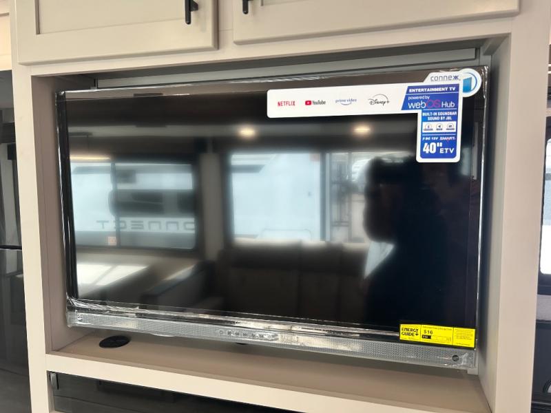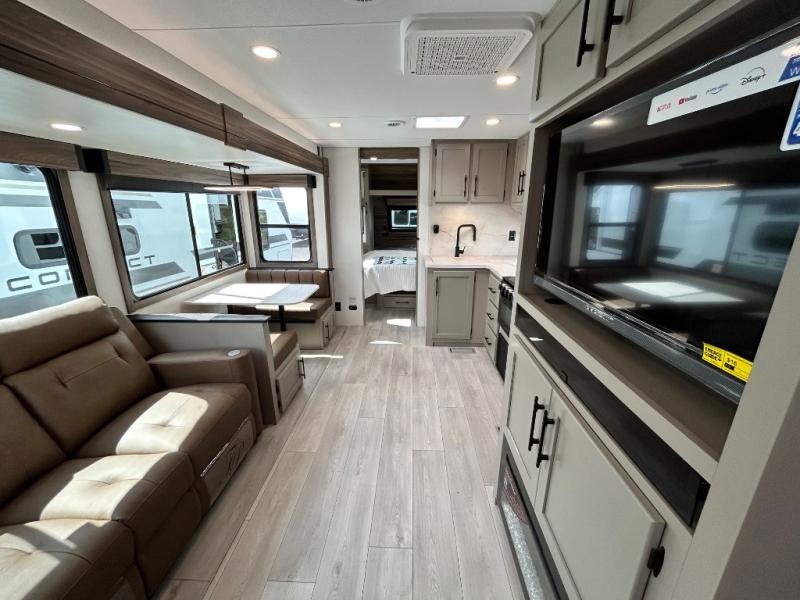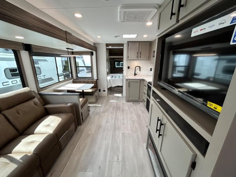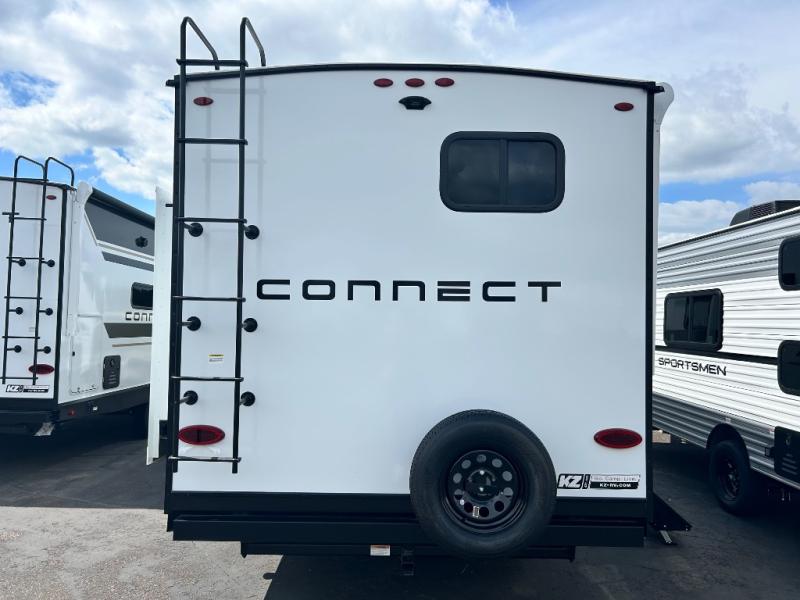 Your needs will be met and your desires will be fulfilled with this Connect travel trailer! Probably the thing you miss most when you camp is your comfortable bed back at home, and that's exactly why this trailer comes with a Serta Comfort foam king mattress in the private bedroom. The other thing you are prone to miss is your bathroom, and the full rear bathroom on this trailer is an excellent replacement with its 30" x 36" shower, skylight, linen closet, MaxxAir vent, porcelain foot-flush toilet, and dual sink vanity. Sit back on the hide-a-bed sofa and enjoy a night of relaxation in front of the LED TV and 34" fireplace. You can even grab a couple of drinks from the 10 cu. ft. 12V refrigerator, snacks from the walk-in pantry with coat hooks, or you can make it a fun evening by playing a game together at the booth dinette.