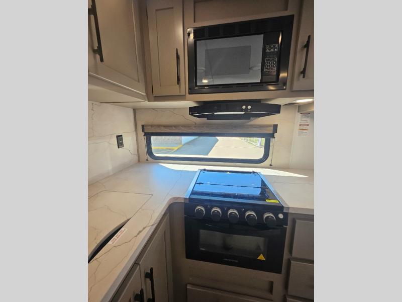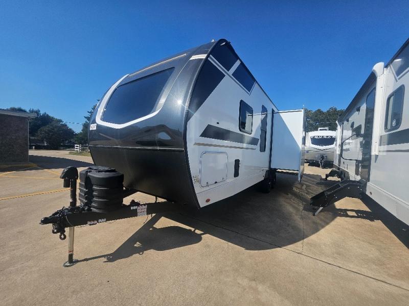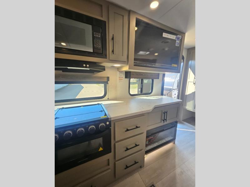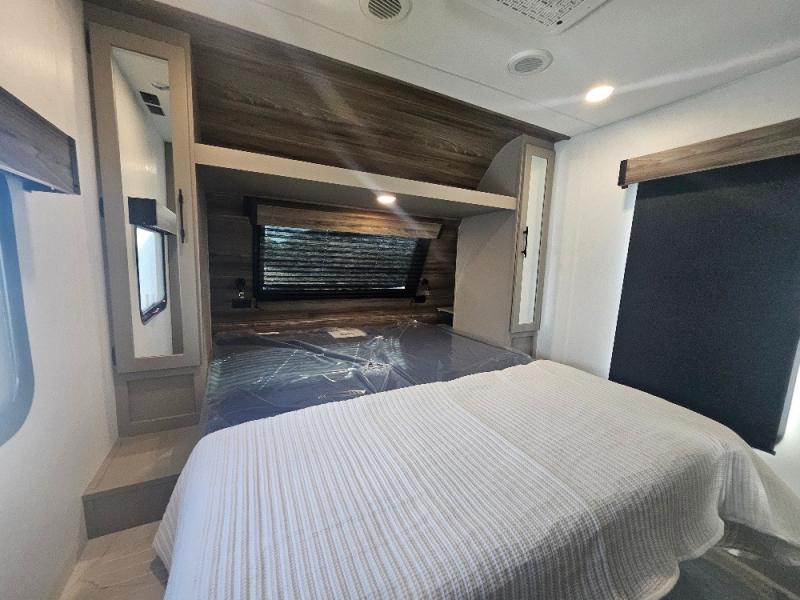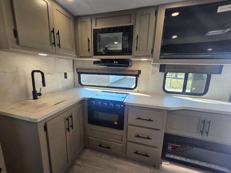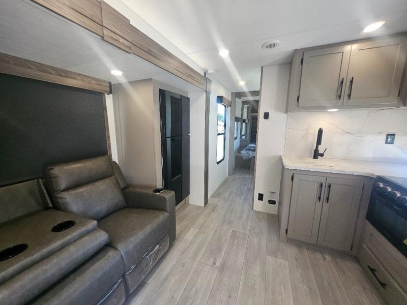 This is the perfect couple's travel trailer! You will enjoy the added space in the living area because of the slide that holds the theater seating with USB charging ports to charge your phone while you recharge relaxing! Another convenient feature is the swing arm TV to adjust better to view your favorite show. You will be quite surprised to find a king-size bed in the front bedroom, along with dual closets with clothes rods to keep your things organized. A pass-through storage on the exterior allows you to bring along extra gear, and the interior is kept cozy on chilly fall evenings with the 34" fireplace. Enjoy some quality time even outdoors when traveling under the 20' awning with LED lights.