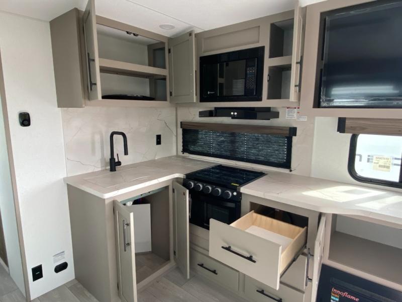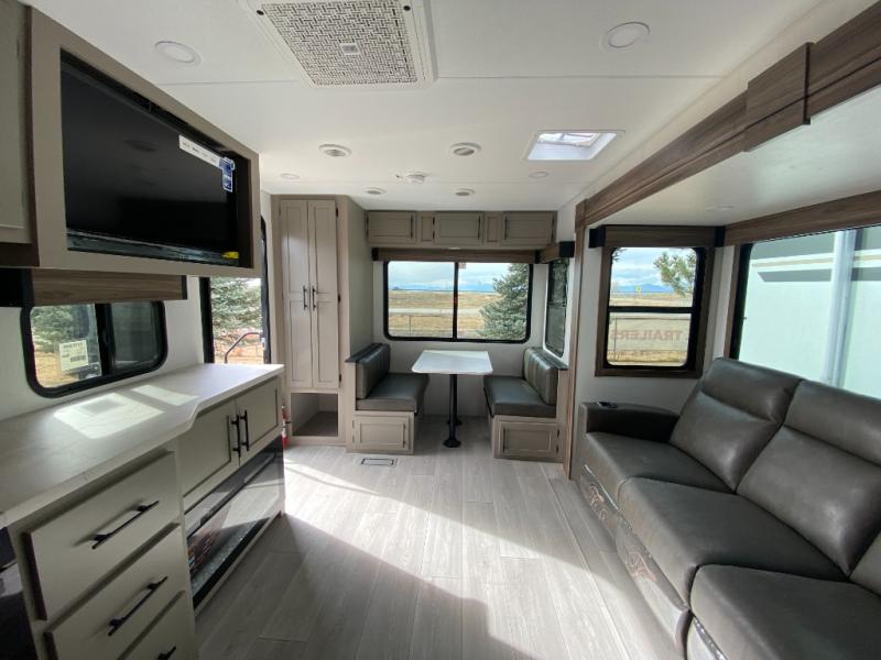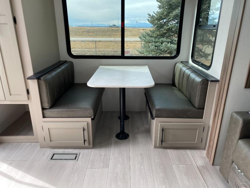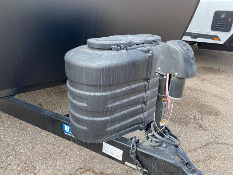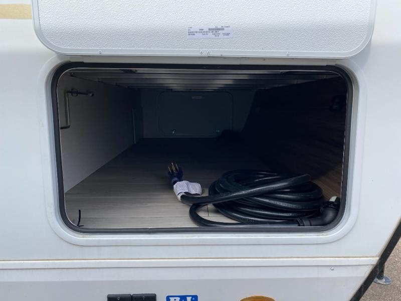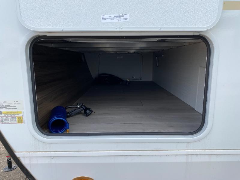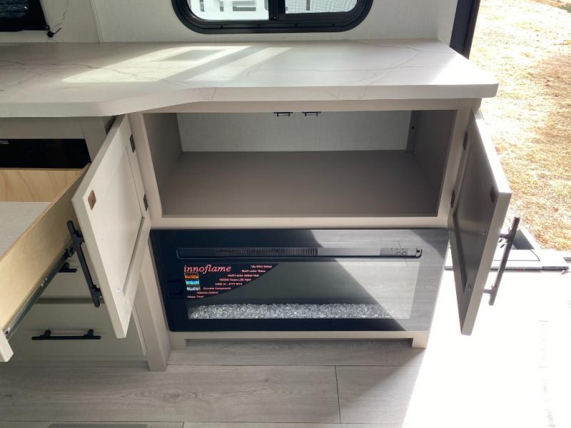 This is the perfect couple's travel trailer! You will enjoy the added space in the living area because of the slide that holds the theater seating with USB charging ports to charge your phone while you recharge relaxing! Another convenient feature is the swing arm TV to adjust better to view your favorite show. You will be quite surprised to find a king-size bed in the front bedroom, along with dual closets with clothes rods to keep your things organized. A pass-through storage on the exterior allows you to bring along extra gear, and the interior is kept cozy on chilly fall evenings with the 34" fireplace. Enjoy some quality time even outdoors when traveling under the 20' awning with LED lights.