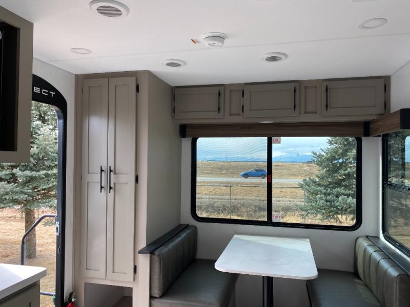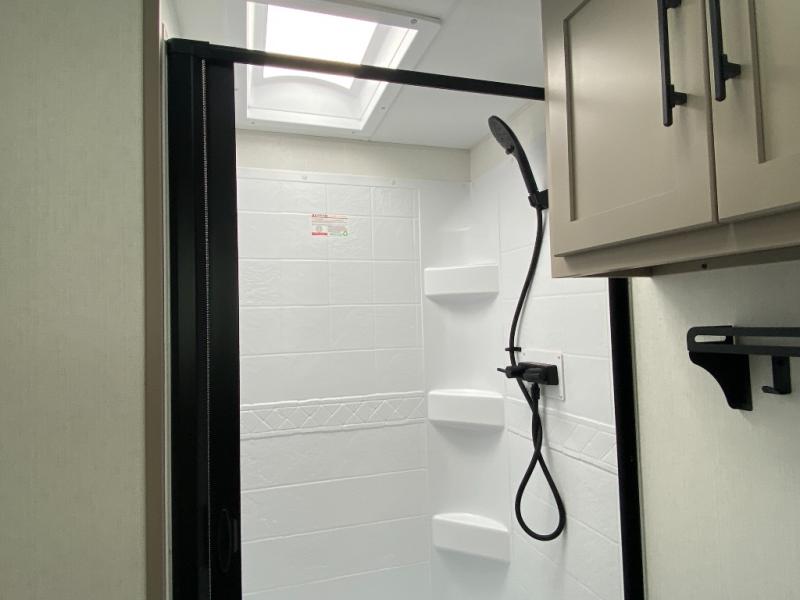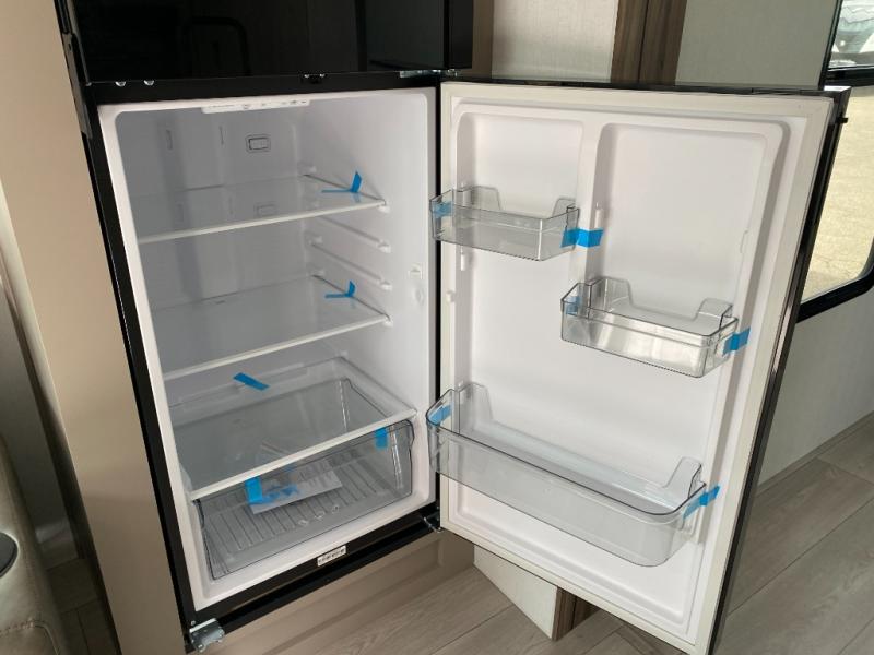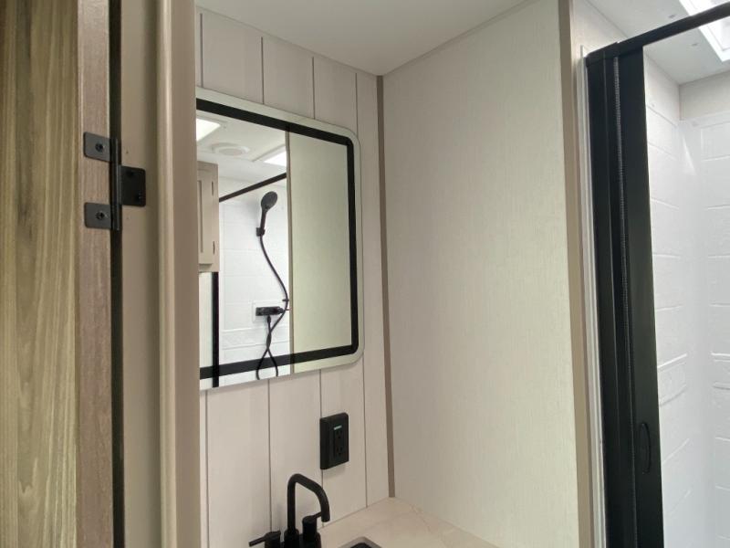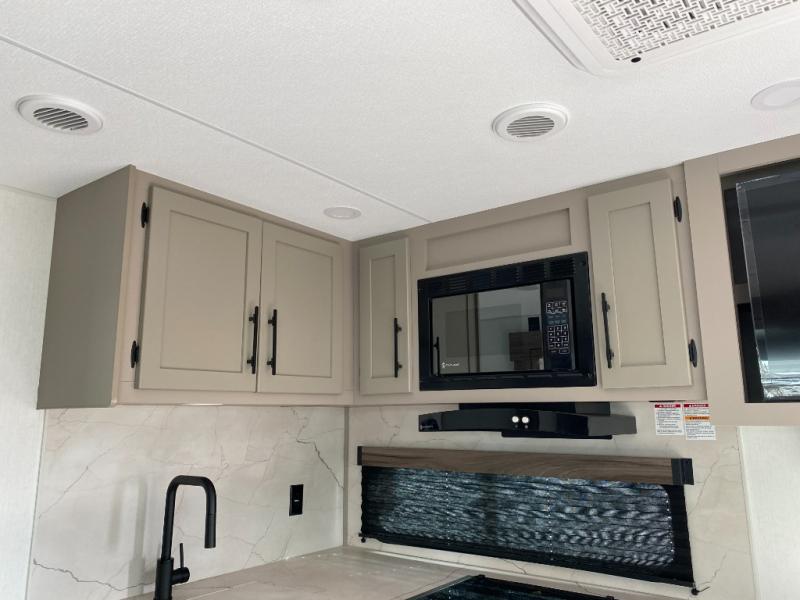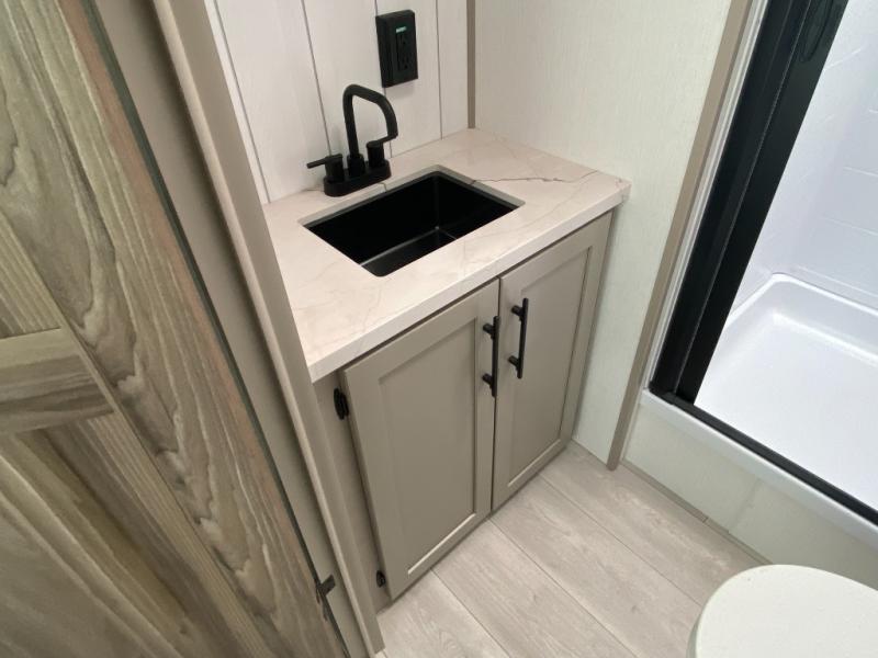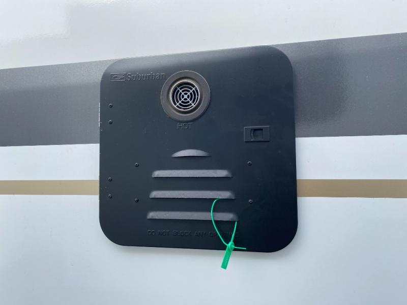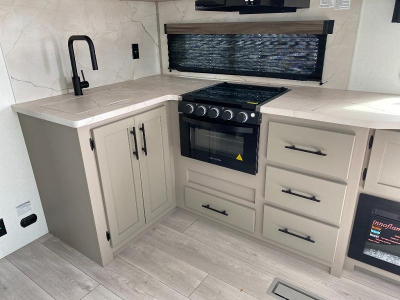 This is the perfect couple's travel trailer! You will enjoy the added space in the living area because of the slide that holds the theater seating with USB charging ports to charge your phone while you recharge relaxing! Another convenient feature is the swing arm TV to adjust better to view your favorite show. You will be quite surprised to find a king-size bed in the front bedroom, along with dual closets with clothes rods to keep your things organized. A pass-through storage on the exterior allows you to bring along extra gear, and the interior is kept cozy on chilly fall evenings with the 34" fireplace. Enjoy some quality time even outdoors when traveling under the 20' awning with LED lights.