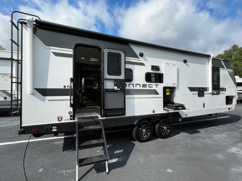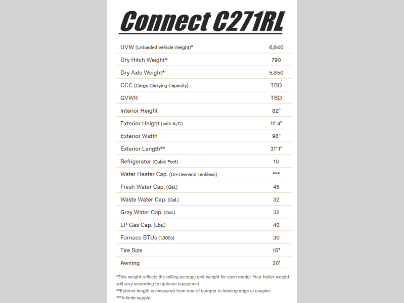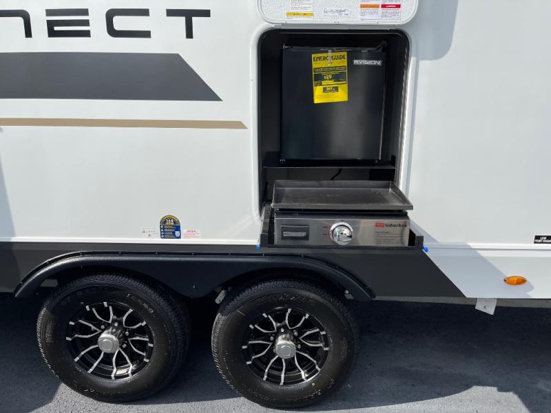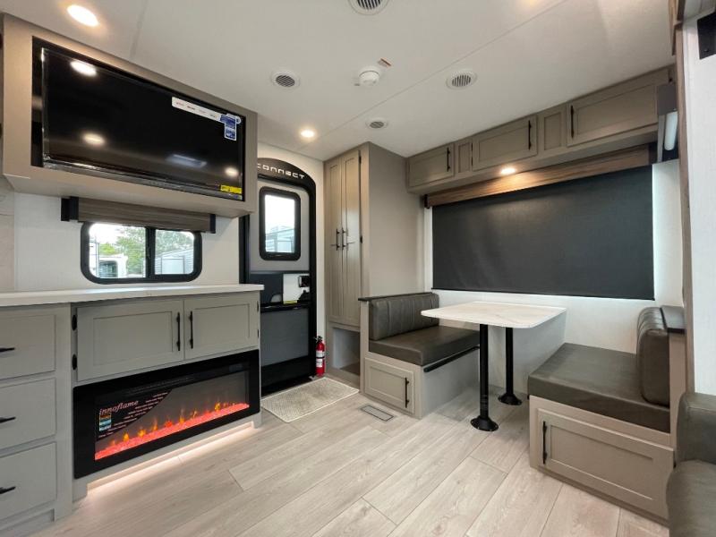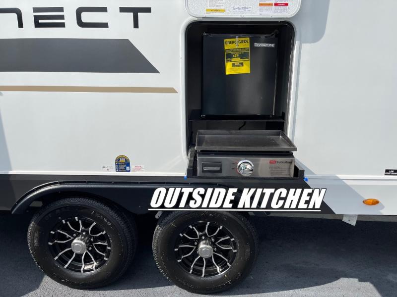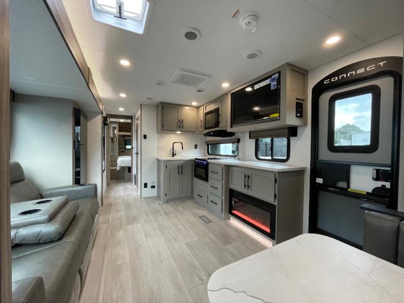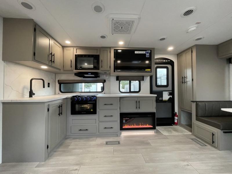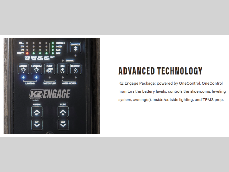The KZ Connect travel trailer comes with an RV Airflow System which optimizes the airflow for your air conditioner. This improves performance, speeds up cooling times, and reduces noise in your trailer. Some of the other helpful features found on the Connect are the heated, insulated, and enclosed underbelly, the exterior docking station, the fiberglass front cap with front windshield, the 82" interior ceiling height, and the protective front diamond plate. There are some useful technological features, like the two LED motion-sensor lights, the HDMI and USB charger. The KZ Engage is powered by OneControl, and it monitors battery levels and controls slide rooms, the leveling system, the awning, inside/outside lighting, and the TPMS prep.