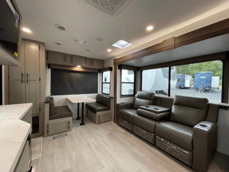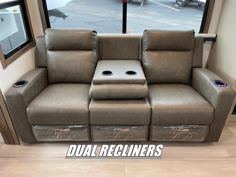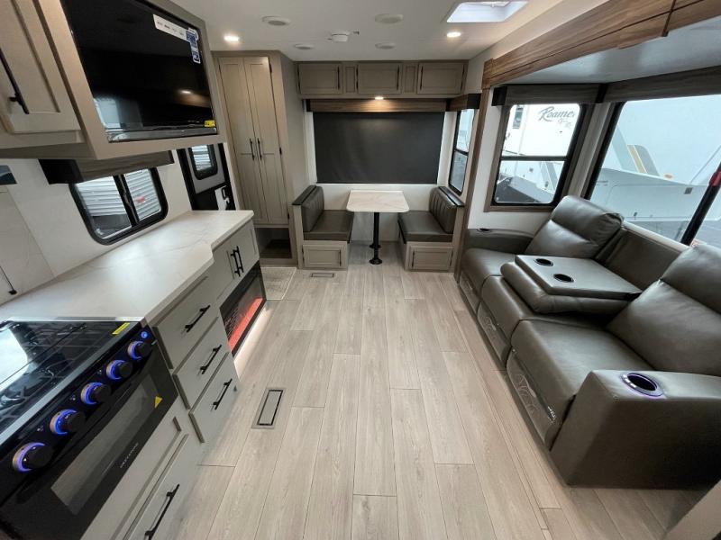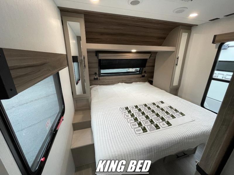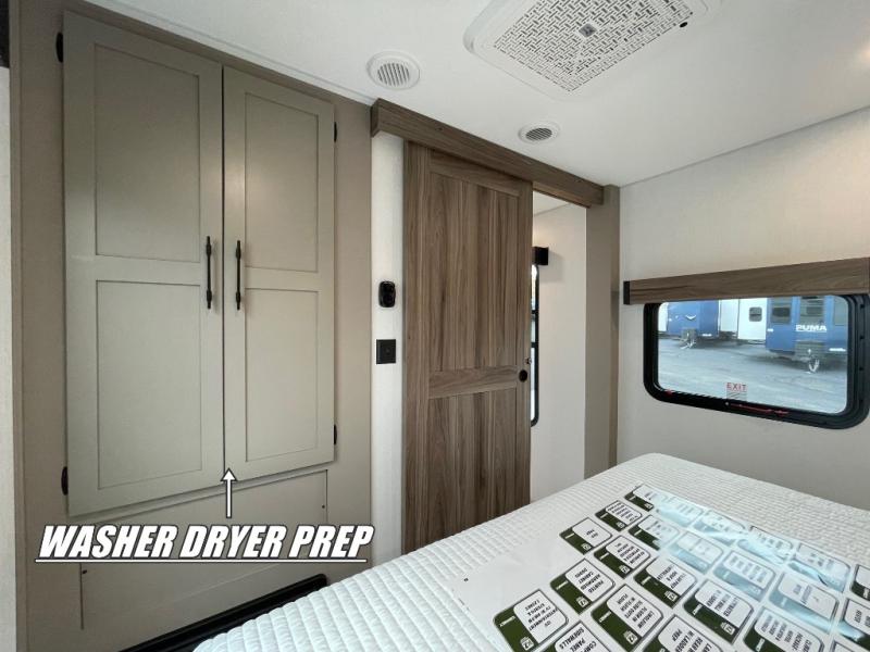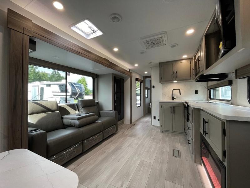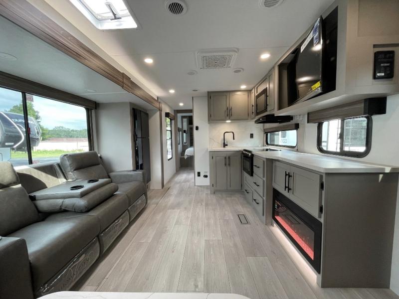This is the perfect couple's travel trailer! You will enjoy the added space in the living area because of the slide that holds the theater seating with USB charging ports to charge your phone while you recharge relaxing! Another convenient feature is the swing arm TV to adjust better to view your favorite show. You will be quite surprised to find a king-size bed in the front bedroom, along with dual closets with clothes rods to keep your things organized. A pass-through storage on the exterior allows you to bring along extra gear, and the interior is kept cozy on chilly fall evenings with the 34" fireplace. Enjoy some quality time even outdoors when traveling under the 20' awning with LED lights.