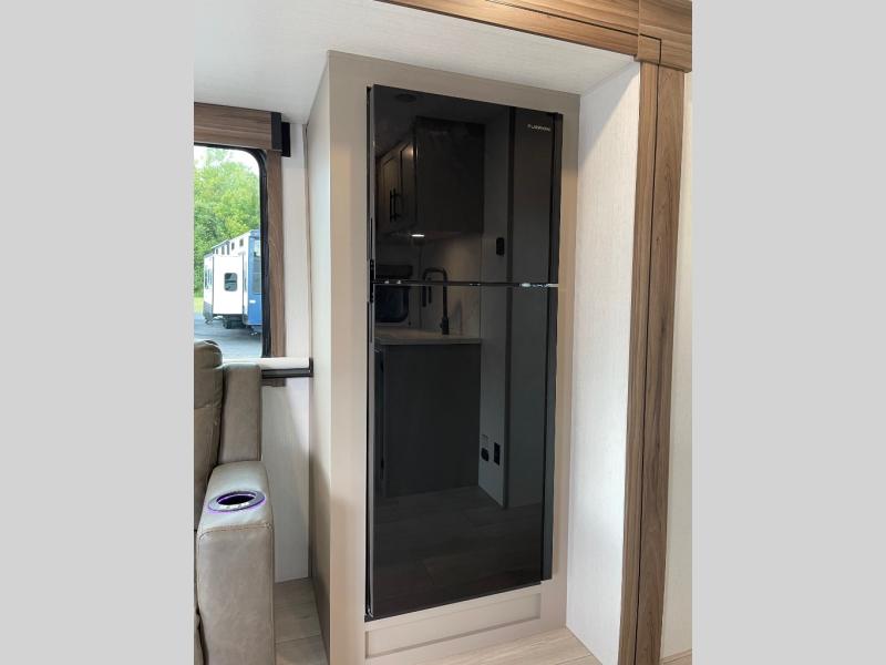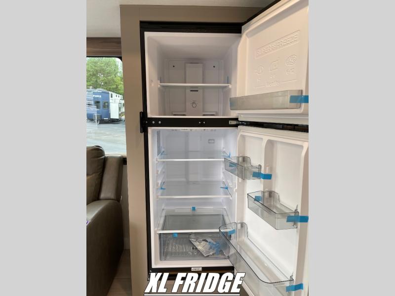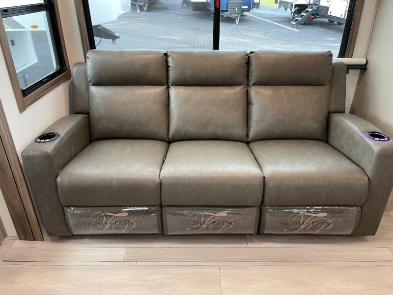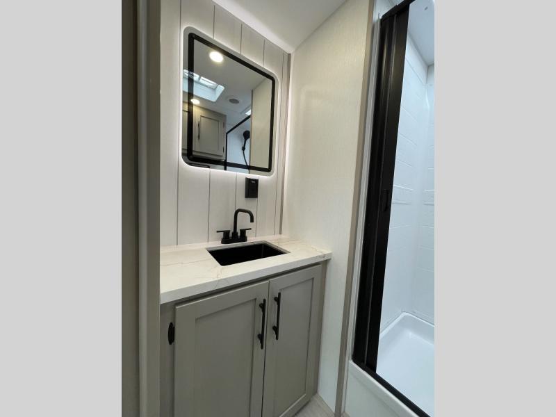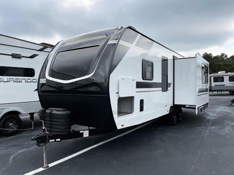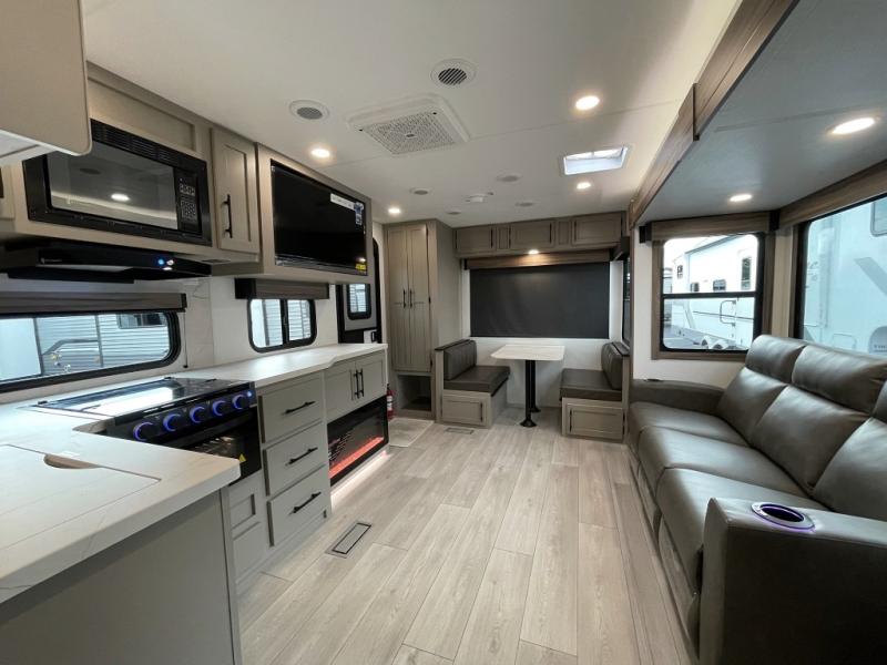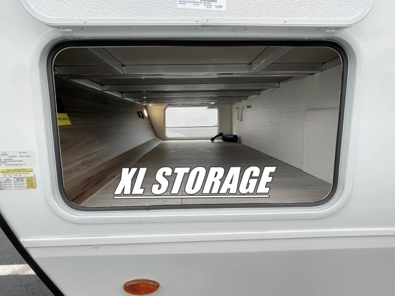 This is the perfect couple's travel trailer! You will enjoy the added space in the living area because of the slide that holds the theater seating with USB charging ports to charge your phone while you recharge relaxing! Another convenient feature is the swing arm TV to adjust better to view your favorite show. You will be quite surprised to find a king-size bed in the front bedroom, along with dual closets with clothes rods to keep your things organized. A pass-through storage on the exterior allows you to bring along extra gear, and the interior is kept cozy on chilly fall evenings with the 34" fireplace. Enjoy some quality time even outdoors when traveling under the 20' awning with LED lights.