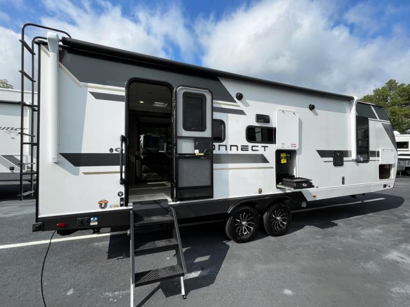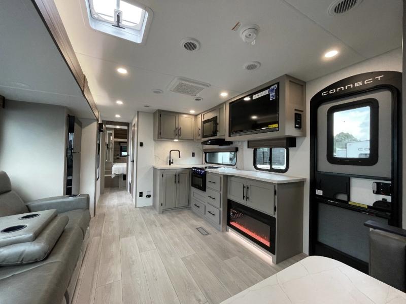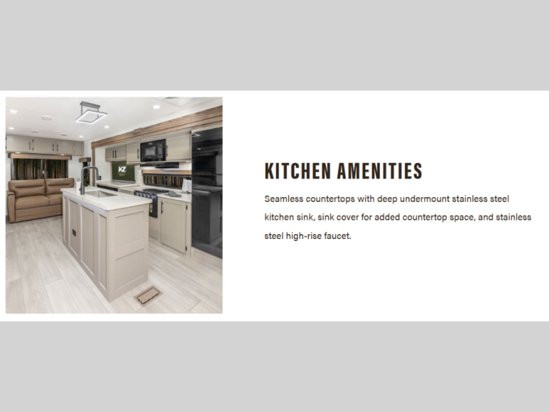 The KZ Connect travel trailer comes with an RV Airflow System which optimizes the airflow for your air conditioner. This improves performance, speeds up cooling times, and reduces noise in your trailer. Some of the other helpful features found on the Connect are the heated, insulated, and enclosed underbelly, the exterior docking station, the fiberglass front cap with front windshield, the 82" interior ceiling height, and the protective front diamond plate. There are some useful technological features, like the two LED motion-sensor lights, the HDMI and USB charger. The KZ Engage is powered by OneControl, and it monitors battery levels and controls slide rooms, the leveling system, the awning, inside/outside lighting, and the TPMS prep.