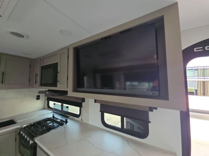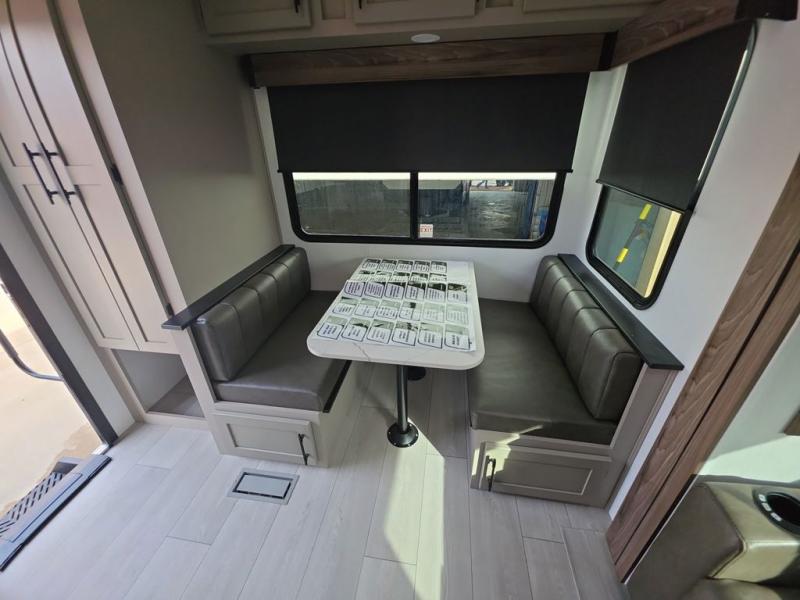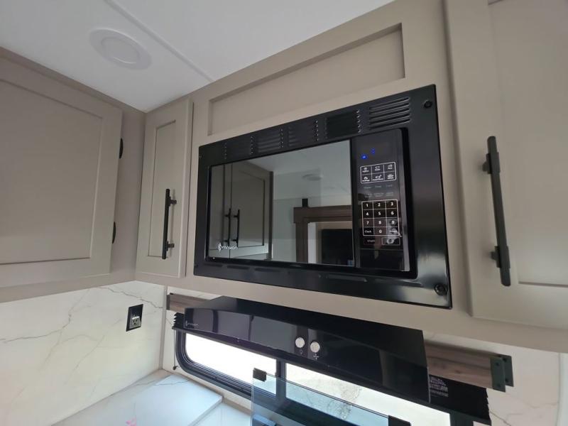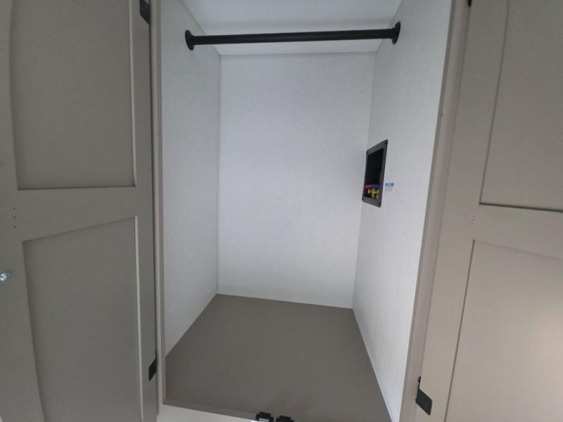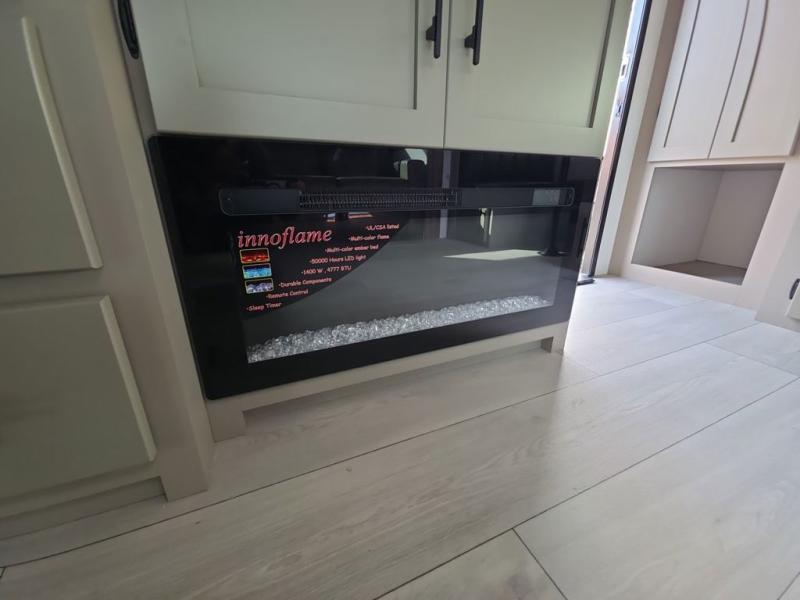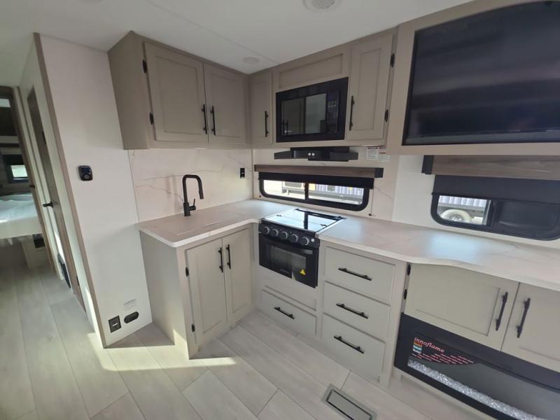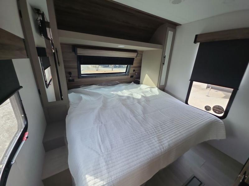 This is the perfect couple's travel trailer! You will enjoy the added space in the living area because of the slide that holds the theater seating with USB charging ports to charge your phone while you recharge relaxing! Another convenient feature is the swing arm TV to adjust better to view your favorite show. You will be quite surprised to find a king-size bed in the front bedroom, along with dual closets with clothes rods to keep your things organized. A pass-through storage on the exterior allows you to bring along extra gear, and the interior is kept cozy on chilly fall evenings with the 34" fireplace. Enjoy some quality time even outdoors when traveling under the 20' awning with LED lights.