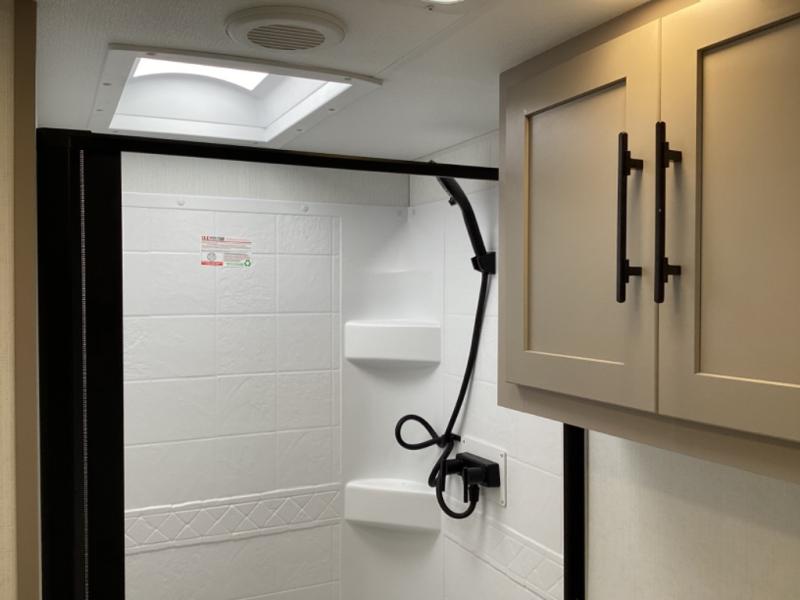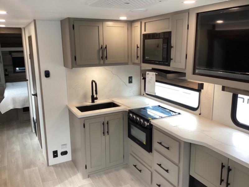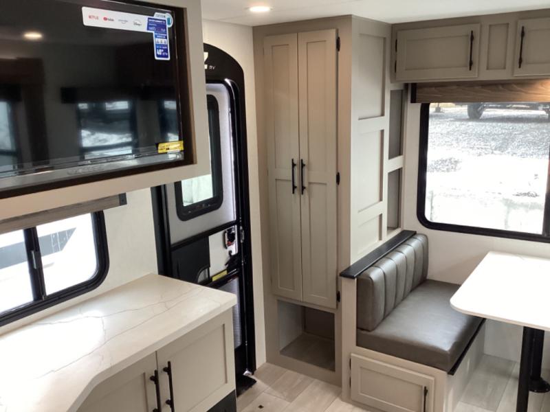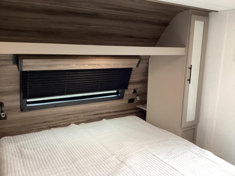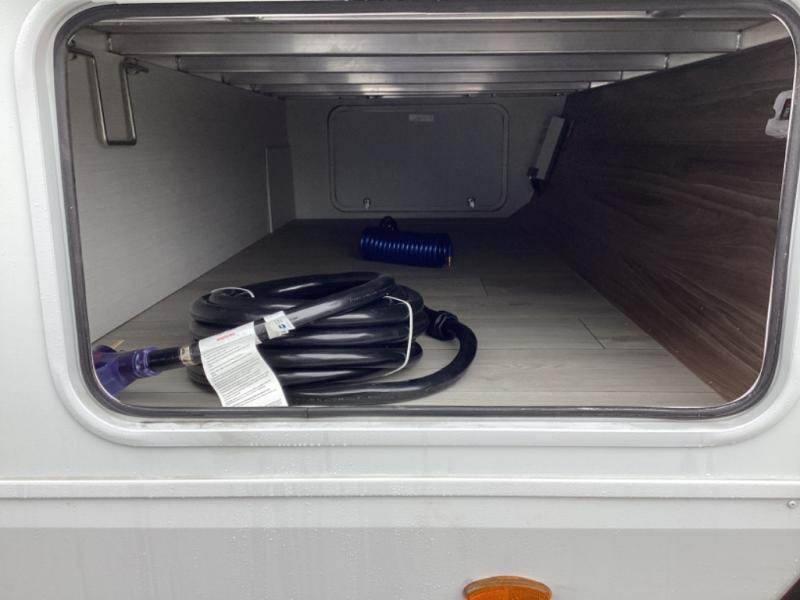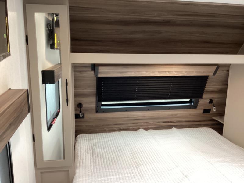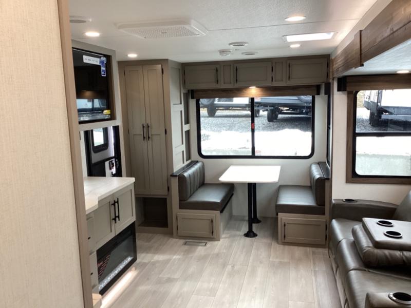 This is the perfect couple's travel trailer! You will enjoy the added space in the living area because of the slide that holds the theater seating with USB charging ports to charge your phone while you recharge relaxing! Another convenient feature is the swing arm TV to adjust better to view your favorite show. You will be quite surprised to find a king-size bed in the front bedroom, along with dual closets with clothes rods to keep your things organized. A pass-through storage on the exterior allows you to bring along extra gear, and the interior is kept cozy on chilly fall evenings with the 34" fireplace. Enjoy some quality time even outdoors when traveling under the 20' awning with LED lights.
