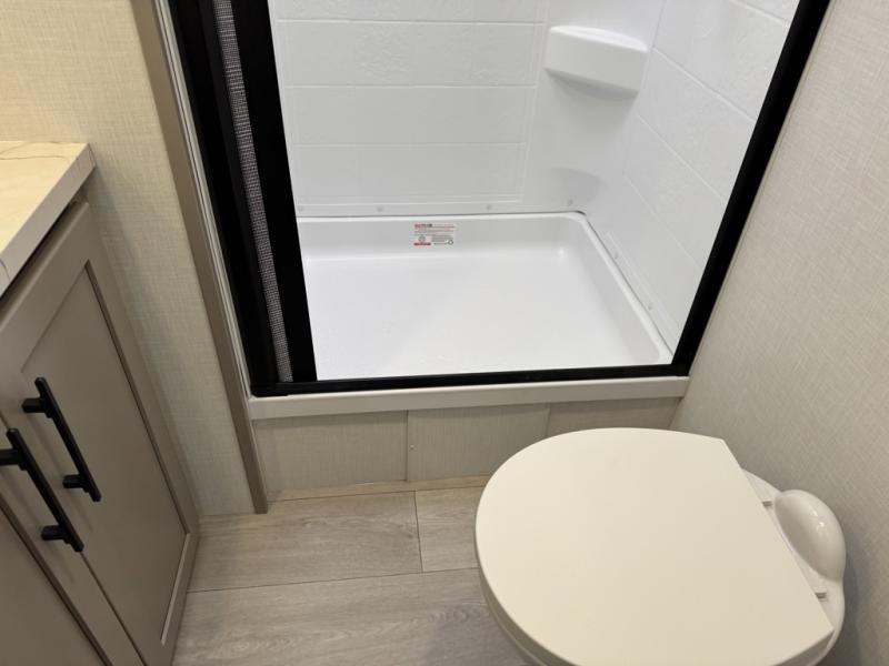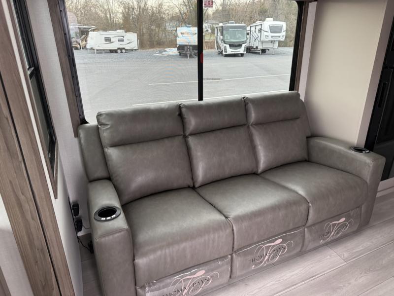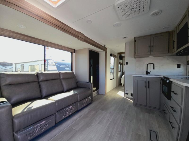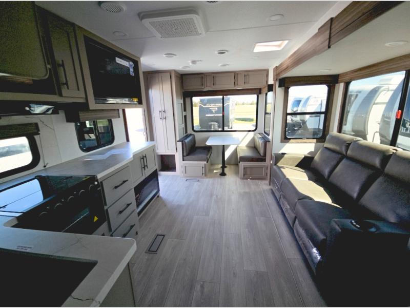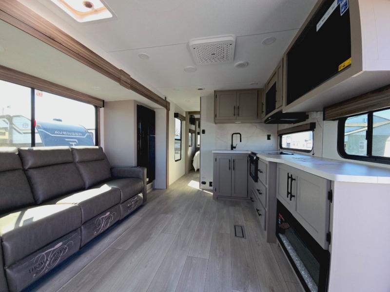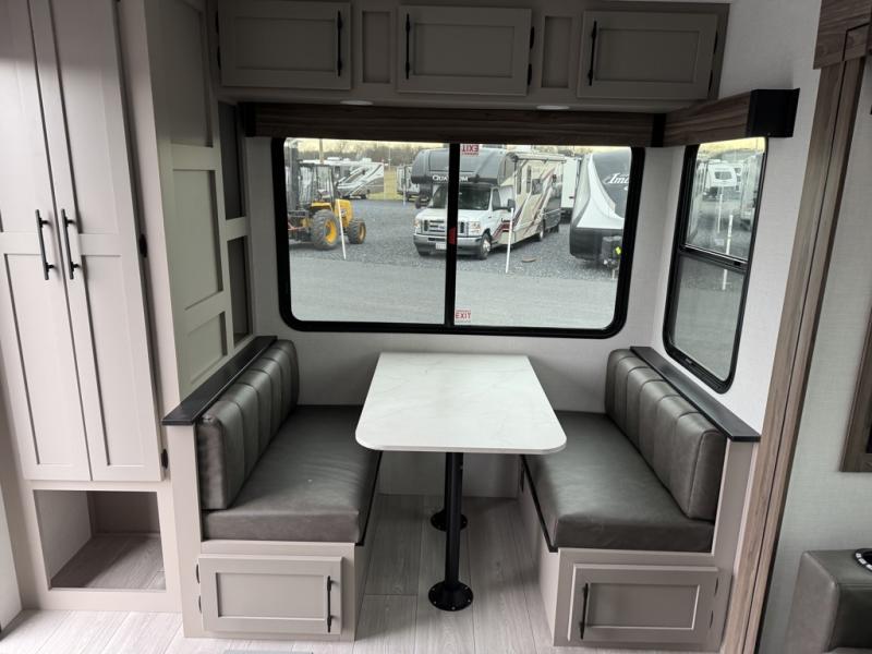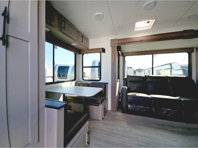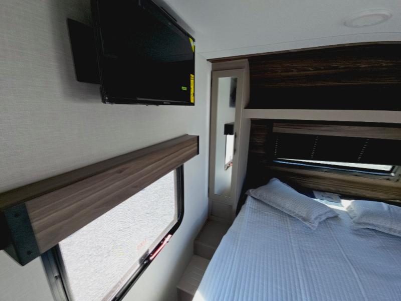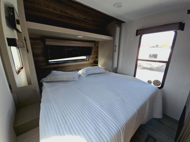 This is the perfect couple's travel trailer! You will enjoy the added space in the living area because of the slide that holds the theater seating with USB charging ports to charge your phone while you recharge relaxing! Another convenient feature is the swing arm TV to adjust better to view your favorite show. You will be quite surprised to find a king-size bed in the front bedroom, along with dual closets with clothes rods to keep your things organized. A pass-through storage on the exterior allows you to bring along extra gear, and the interior is kept cozy on chilly fall evenings with the 34" fireplace. Enjoy some quality time even outdoors when traveling under the 20' awning with LED lights.