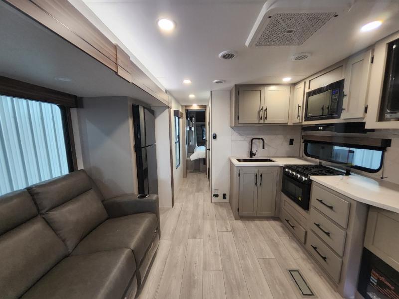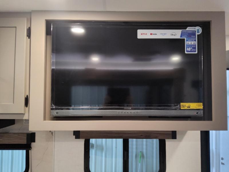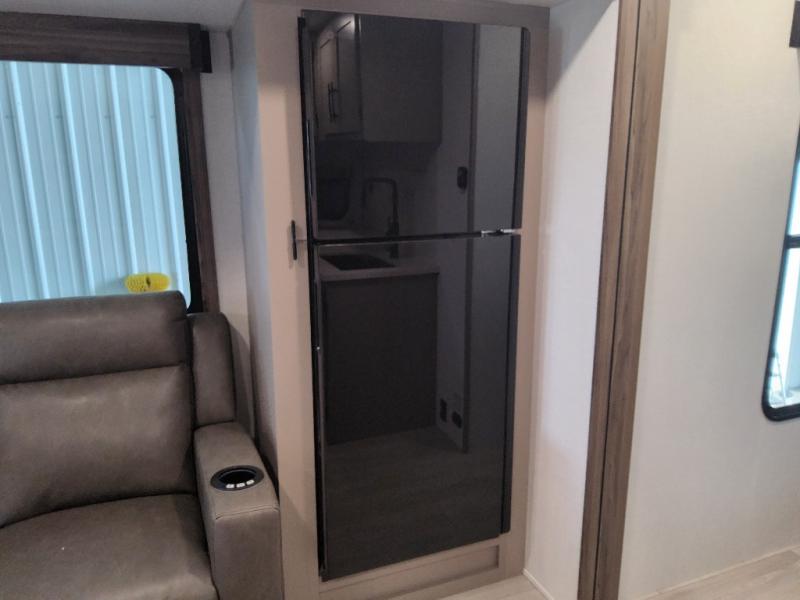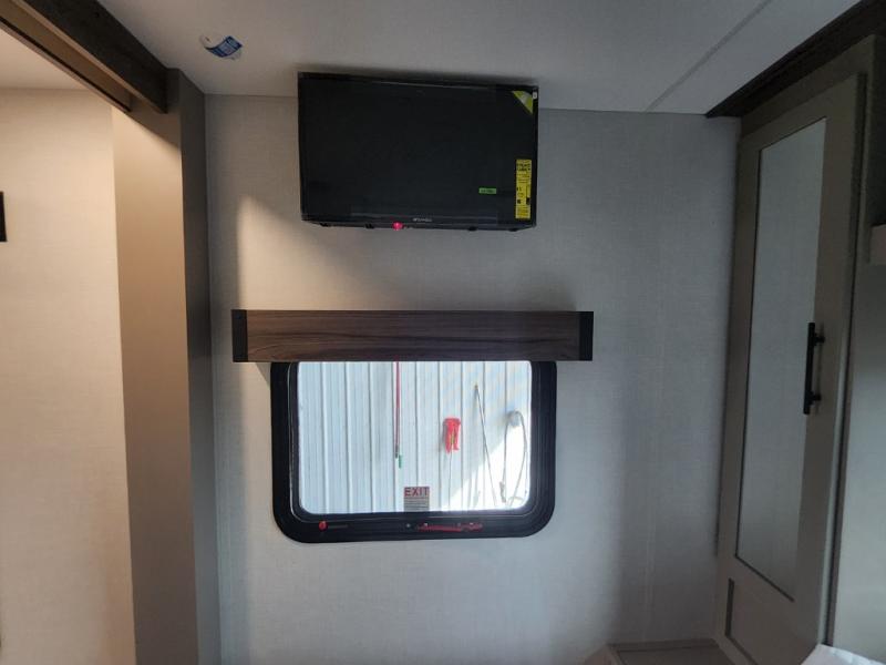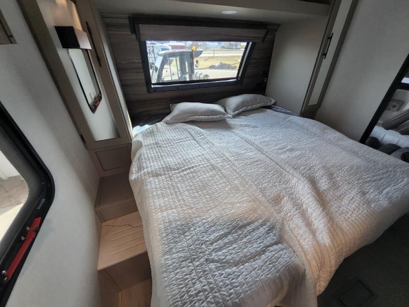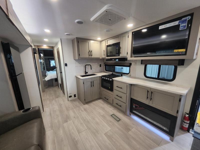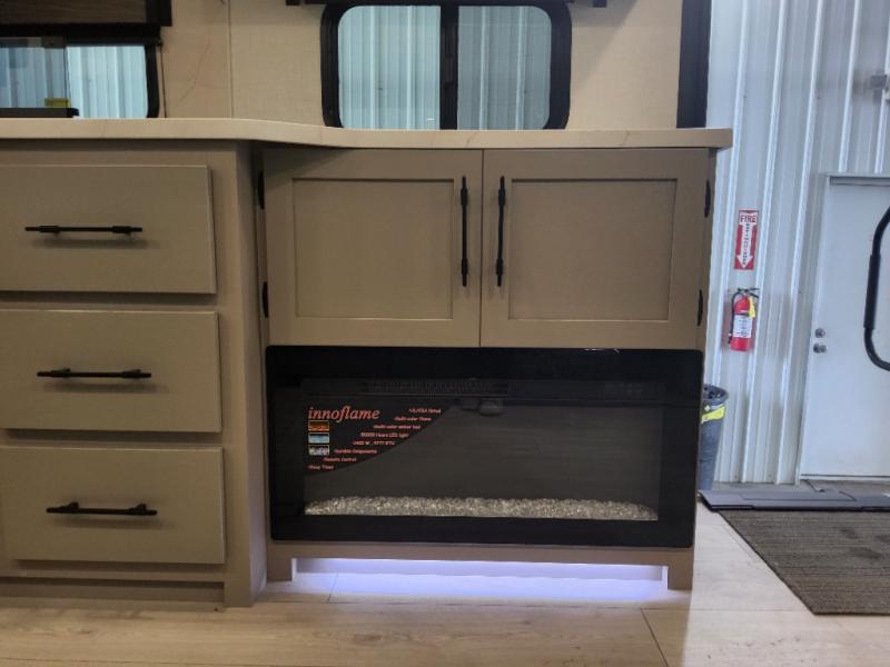 This is the perfect couple's travel trailer! You will enjoy the added space in the living area because of the slide that holds the theater seating with USB charging ports to charge your phone while you recharge relaxing! Another convenient feature is the swing arm TV to adjust better to view your favorite show. You will be quite surprised to find a king-size bed in the front bedroom, along with dual closets with clothes rods to keep your things organized. A pass-through storage on the exterior allows you to bring along extra gear, and the interior is kept cozy on chilly fall evenings with the 34" fireplace. Enjoy some quality time even outdoors when traveling under the 20' awning with LED lights.