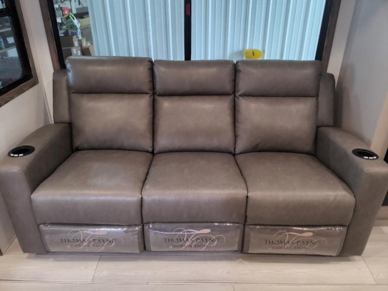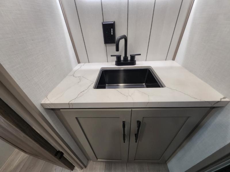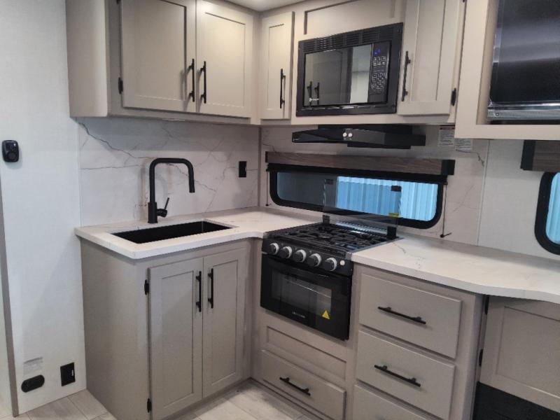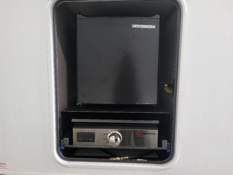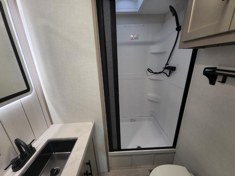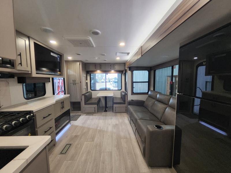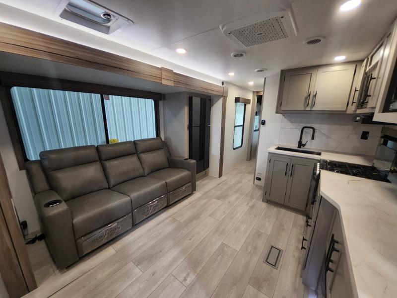 This is the perfect couple's travel trailer! You will enjoy the added space in the living area because of the slide that holds the theater seating with USB charging ports to charge your phone while you recharge relaxing! Another convenient feature is the swing arm TV to adjust better to view your favorite show. You will be quite surprised to find a king-size bed in the front bedroom, along with dual closets with clothes rods to keep your things organized. A pass-through storage on the exterior allows you to bring along extra gear, and the interior is kept cozy on chilly fall evenings with the 34" fireplace. Enjoy some quality time even outdoors when traveling under the 20' awning with LED lights.