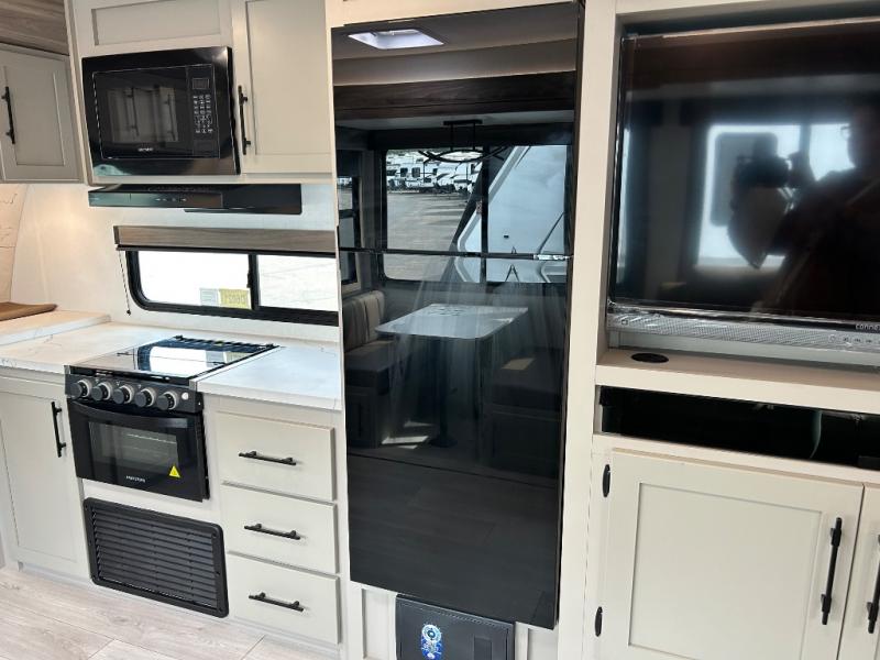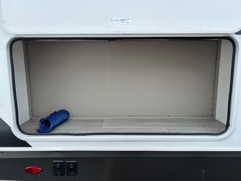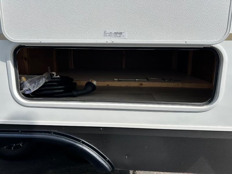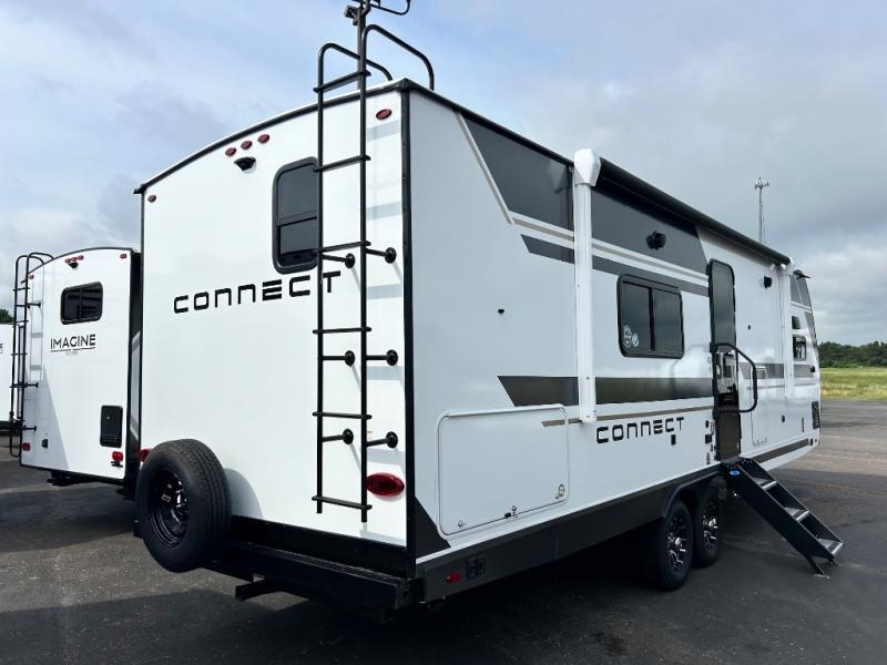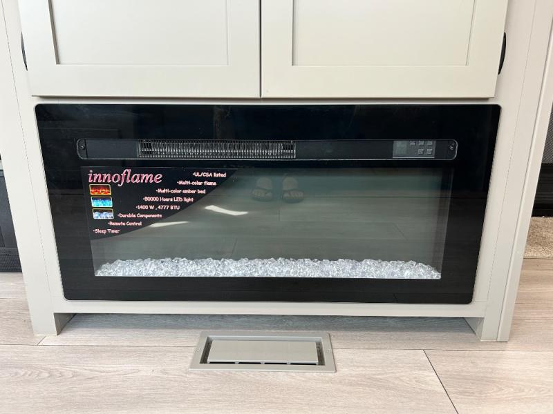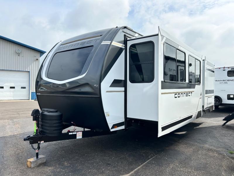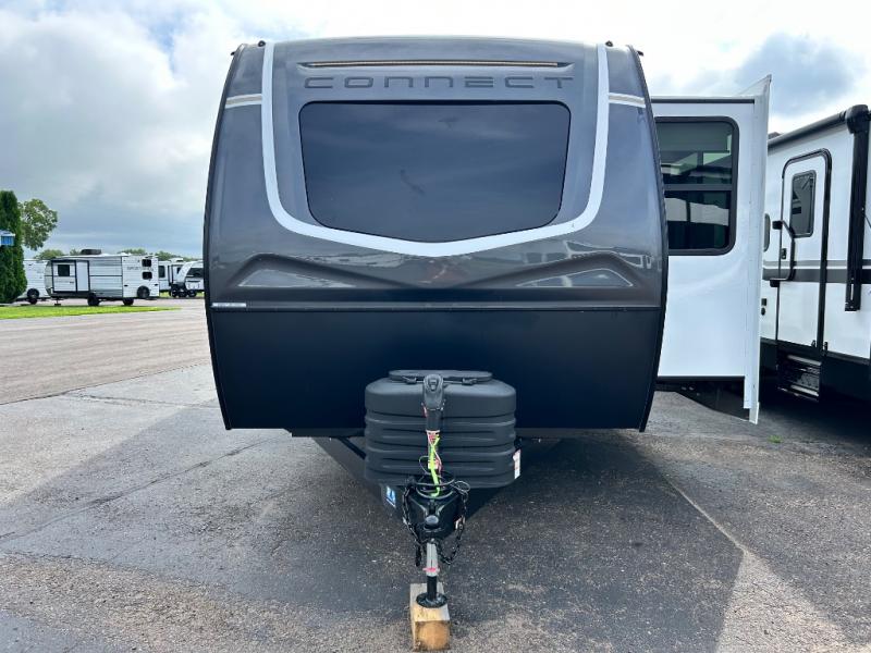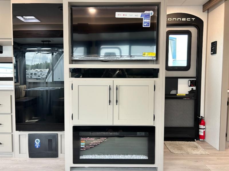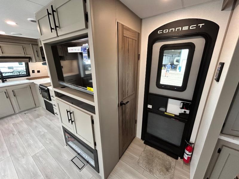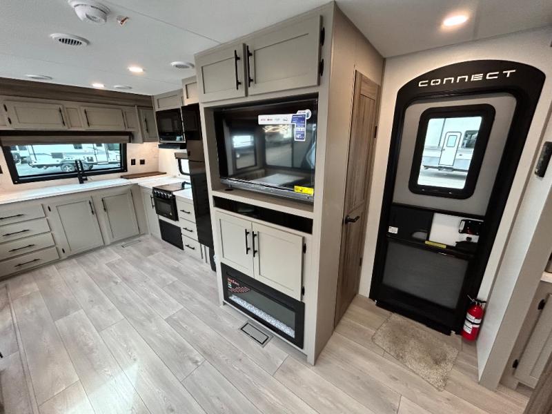 You can use this Connect travel trailer whenever you want to get away! You will remain comfortable each night sleeping in the master suite with a spacious full rear bath where you can freshen up each day. There is also a wardrobe with washer and dryer prep, plenty of counter space, and a wardrobe with outside storage for hiking gear. The front kitchen has ample countertop space for lots of extra space to chop veggies and prep meals, and the large slide in the main living area holds the booth dinette and hide-a-bed sofa. These pieces of furniture rest across from the 34" fireplace for a cozy evening with a cup of coffee, and there is a hidden pantry where you can grab snacks.