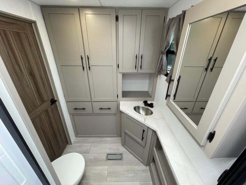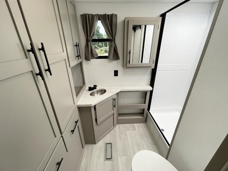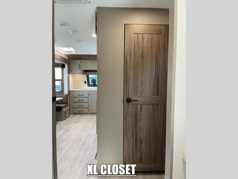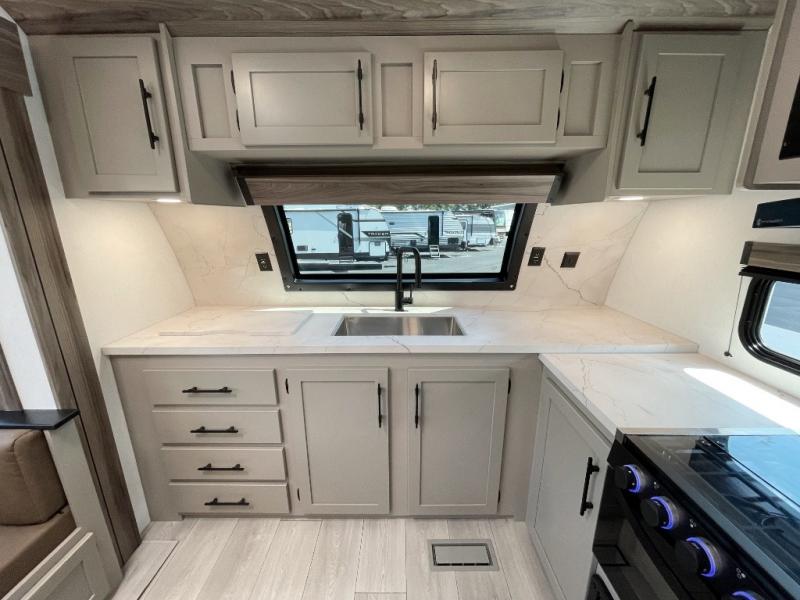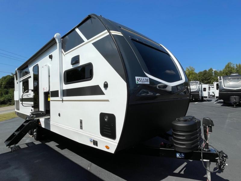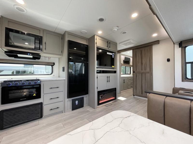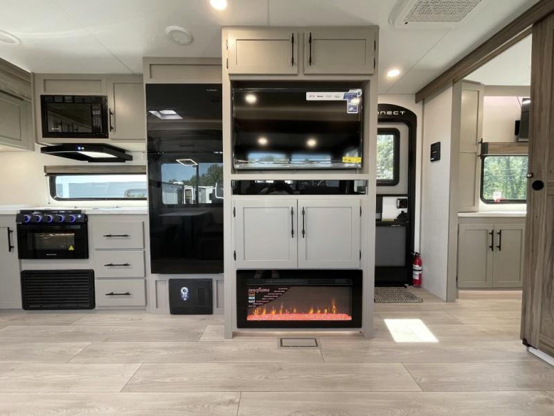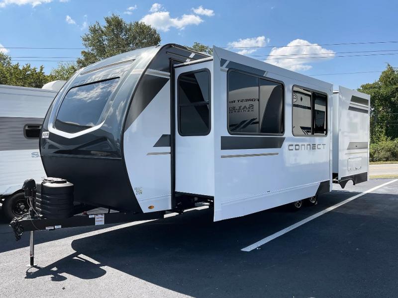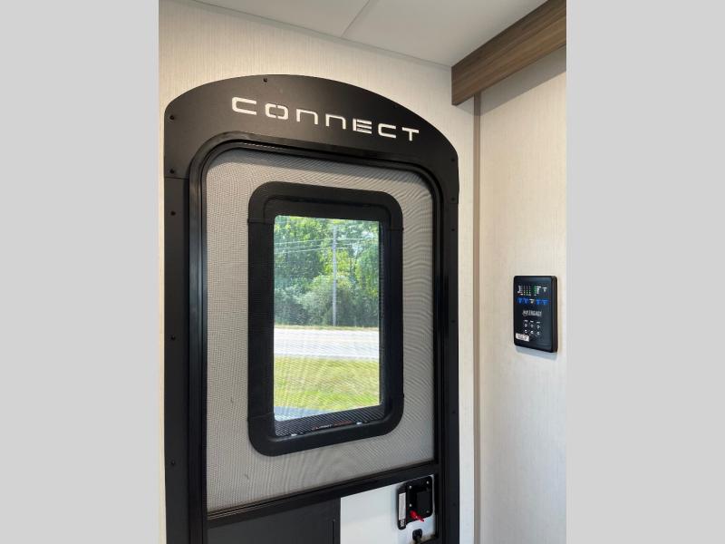 You can use this Connect travel trailer whenever you want to get away! You will remain comfortable each night sleeping in the master suite with a spacious full rear bath where you can freshen up each day. There is also a wardrobe with washer and dryer prep, plenty of counter space, and a wardrobe with outside storage for hiking gear. The front kitchen has ample countertop space for lots of extra space to chop veggies and prep meals, and the large slide in the main living area holds the booth dinette and hide-a-bed sofa. These pieces of furniture rest across from the 34" fireplace for a cozy evening with a cup of coffee, and there is a hidden pantry where you can grab snacks.