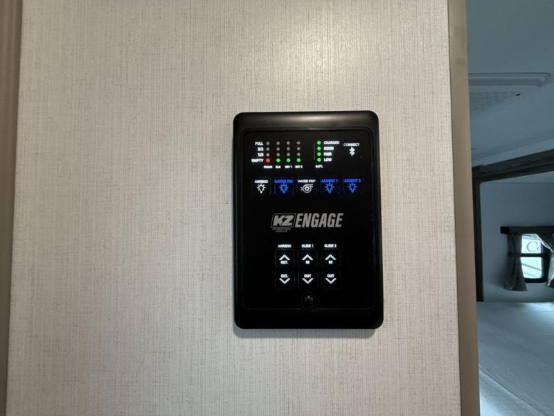 The KZ Connect travel trailer comes with an RV Airflow System which optimizes the airflow for your air conditioner. This improves performance, speeds up cooling times, and reduces noise in your trailer. Some of the other helpful features found on the Connect are the heated, insulated, and enclosed underbelly, the exterior docking station, the fiberglass front cap with front windshield, the 82" interior ceiling height, and the protective front diamond plate. There are some useful technological features, like the two LED motion-sensor lights, the HDMI and USB charger. The KZ Engage is powered by OneControl, and it monitors battery levels and controls slide rooms, the leveling system, the awning, inside/outside lighting, and the TPMS prep.