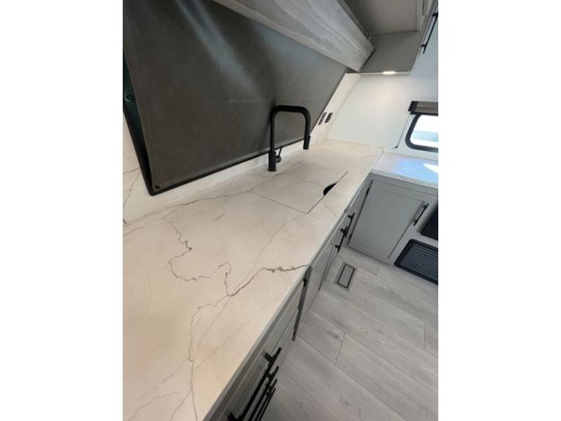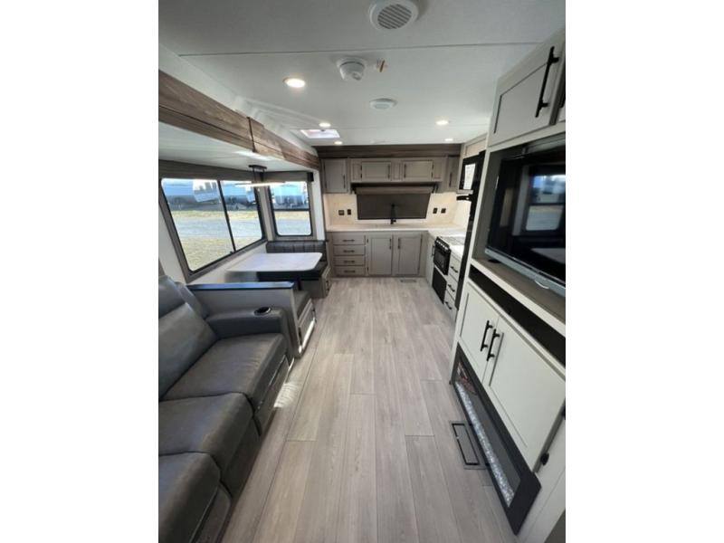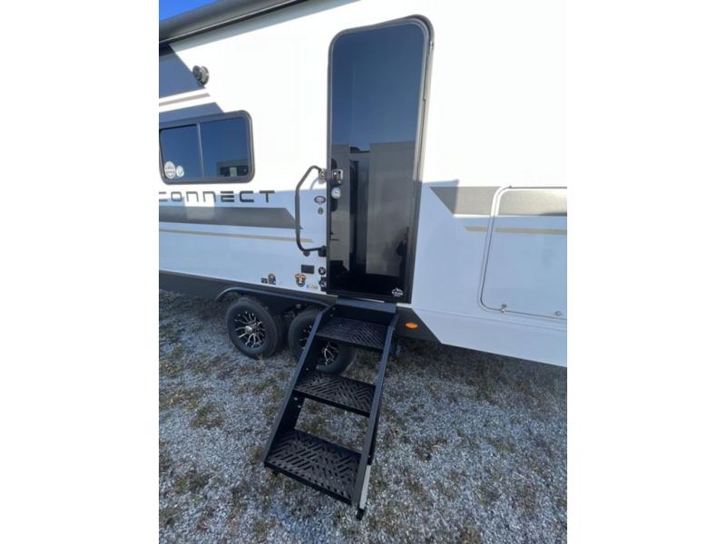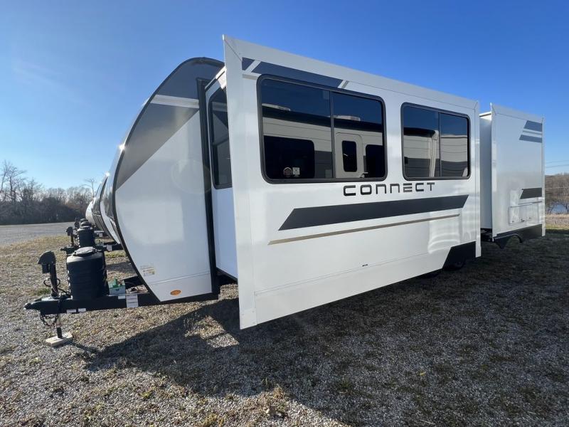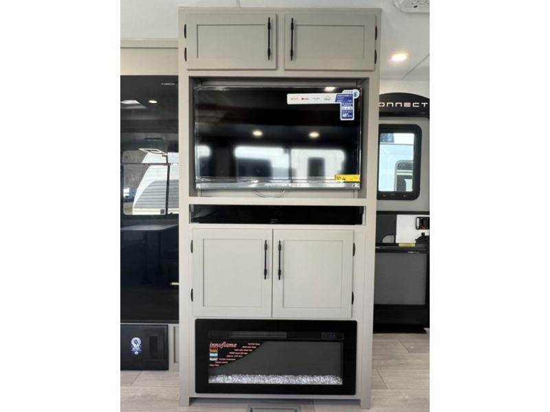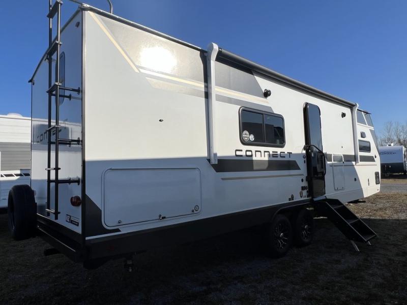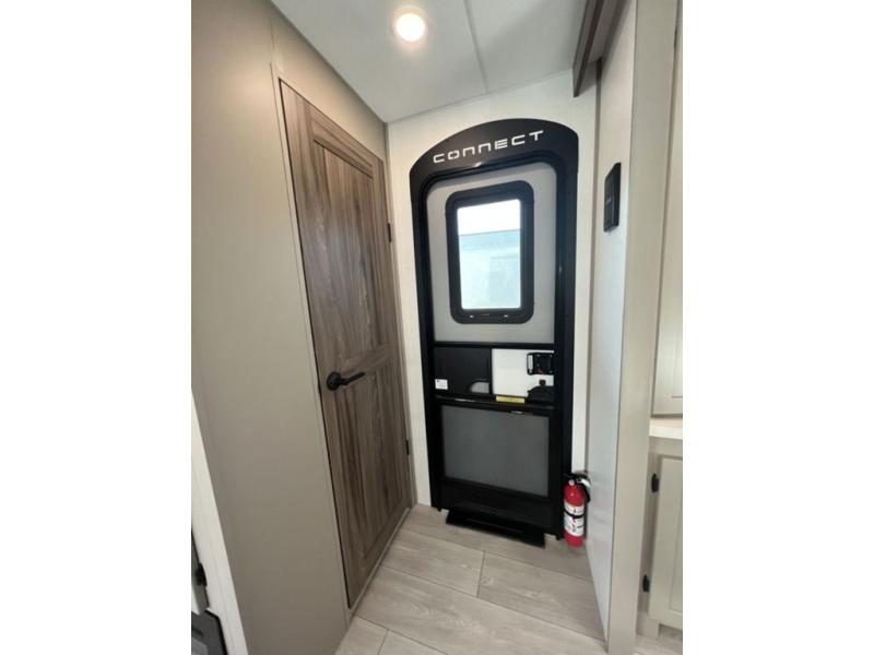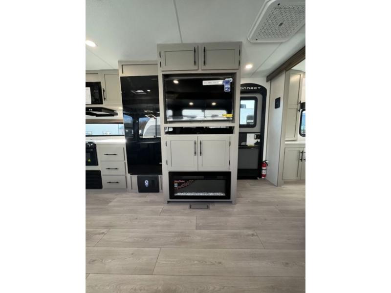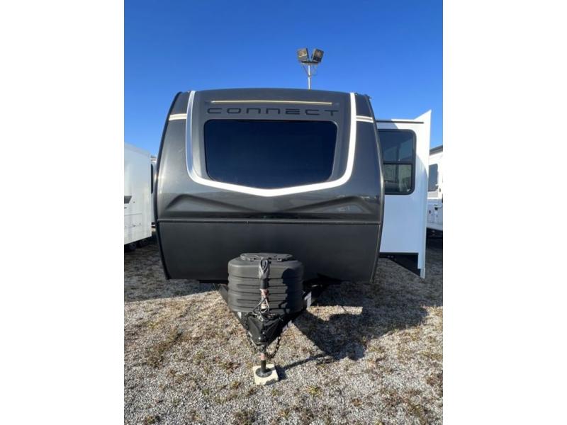 You can use this Connect travel trailer whenever you want to get away! You will remain comfortable each night sleeping in the master suite with a spacious full rear bath where you can freshen up each day. There is also a wardrobe with washer and dryer prep, plenty of counter space, and a wardrobe with outside storage for hiking gear. The front kitchen has ample countertop space for lots of extra space to chop veggies and prep meals, and the large slide in the main living area holds the booth dinette and hide-a-bed sofa. These pieces of furniture rest across from the 34" fireplace for a cozy evening with a cup of coffee, and there is a hidden pantry where you can grab snacks.