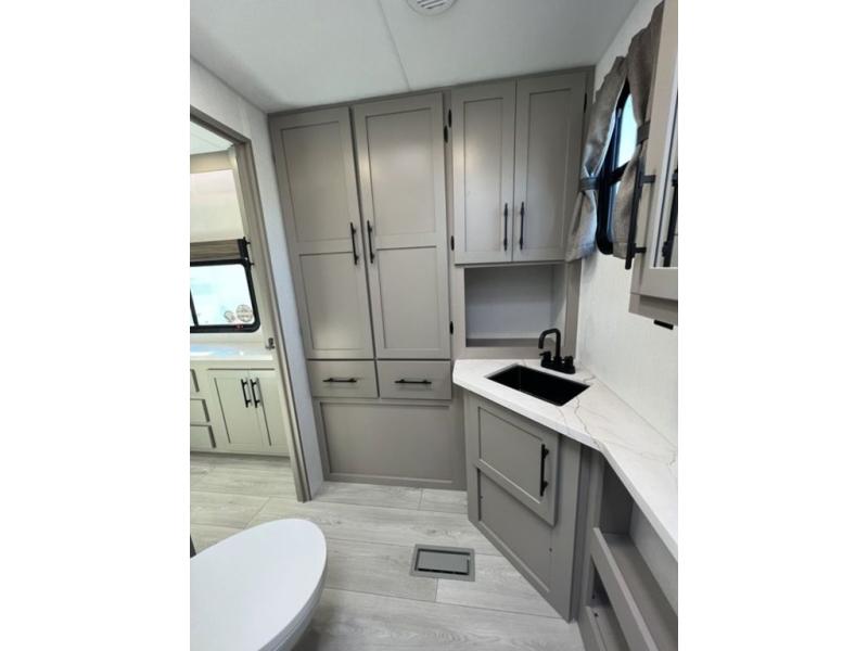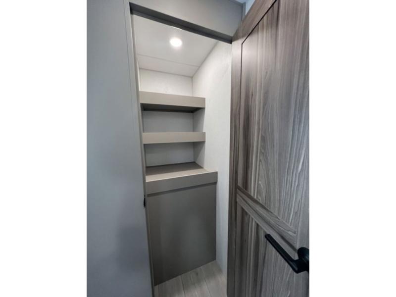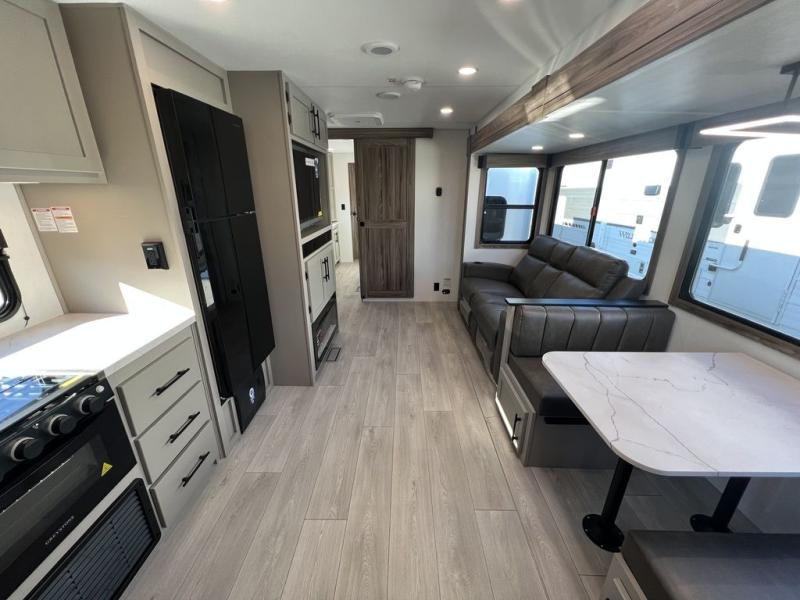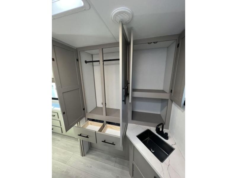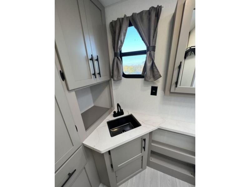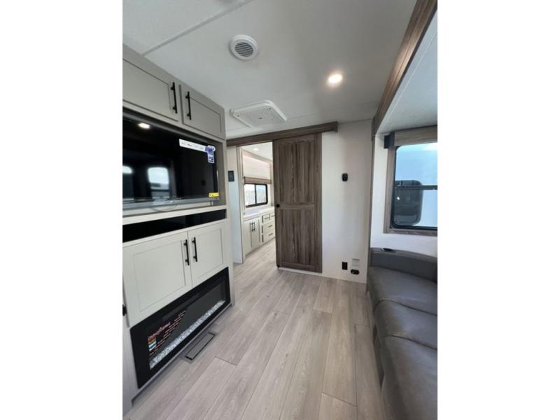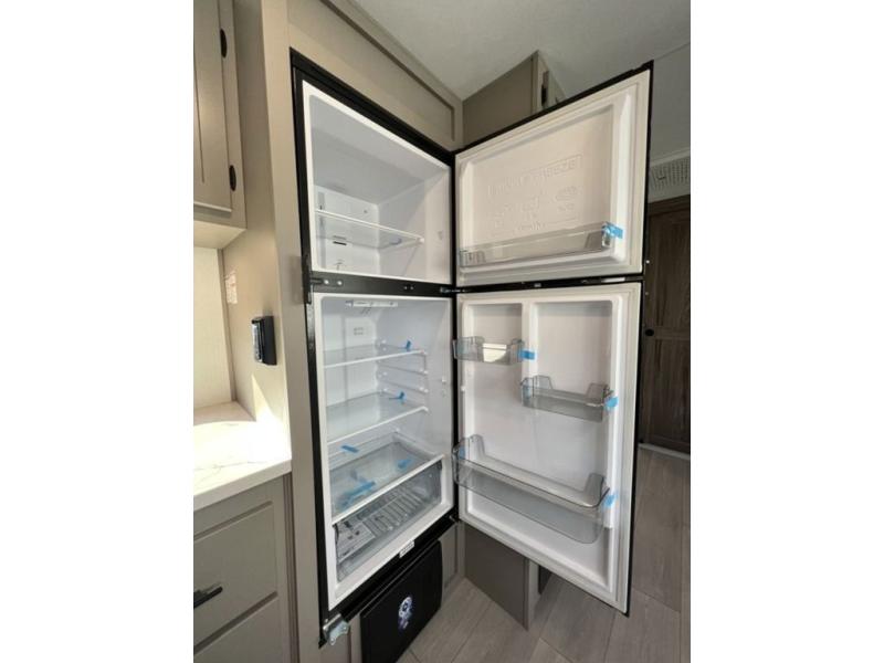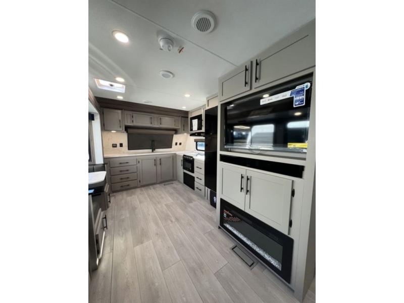 You can use this Connect travel trailer whenever you want to get away! You will remain comfortable each night sleeping in the master suite with a spacious full rear bath where you can freshen up each day. There is also a wardrobe with washer and dryer prep, plenty of counter space, and a wardrobe with outside storage for hiking gear. The front kitchen has ample countertop space for lots of extra space to chop veggies and prep meals, and the large slide in the main living area holds the booth dinette and hide-a-bed sofa. These pieces of furniture rest across from the 34" fireplace for a cozy evening with a cup of coffee, and there is a hidden pantry where you can grab snacks.