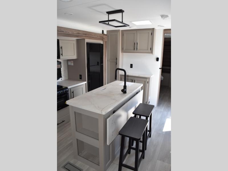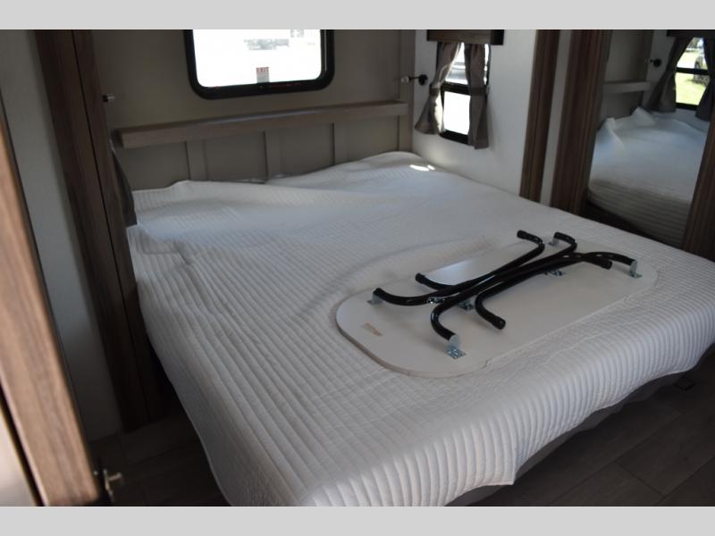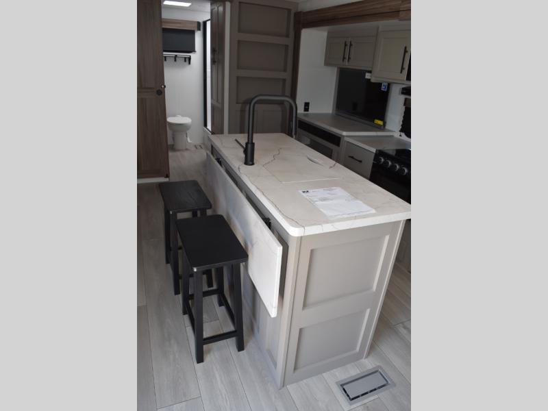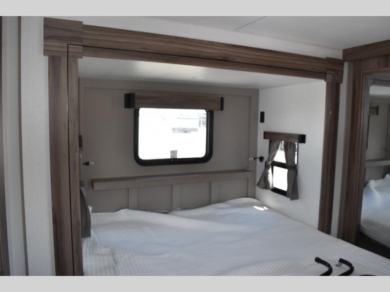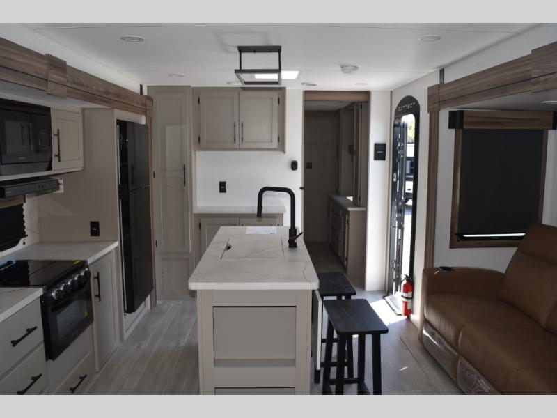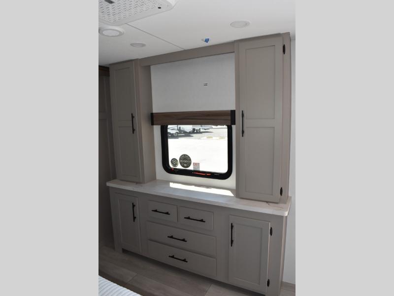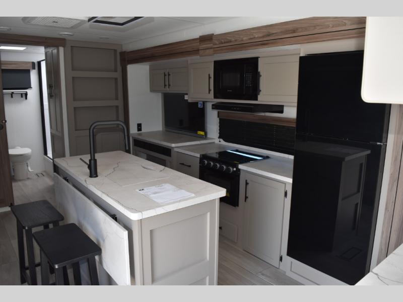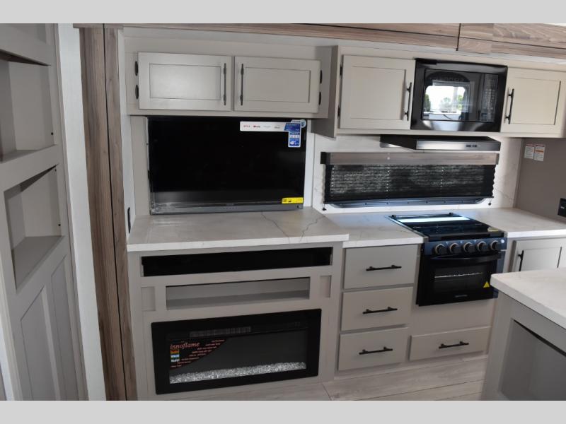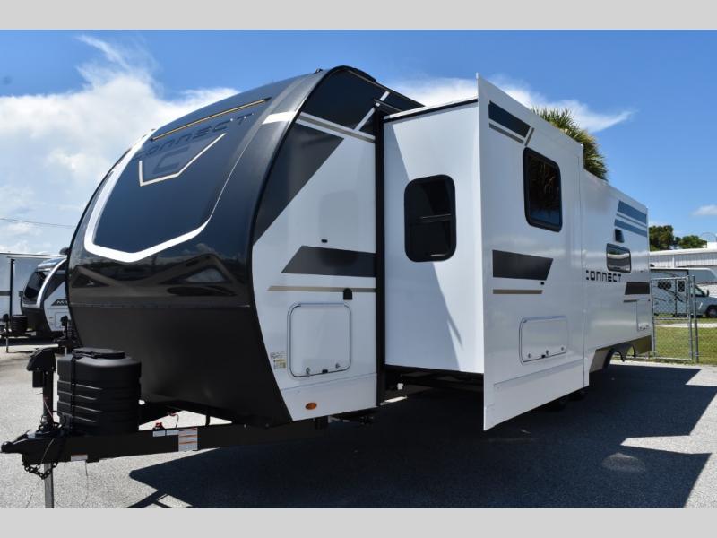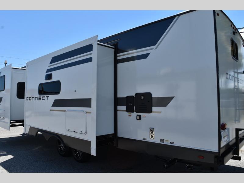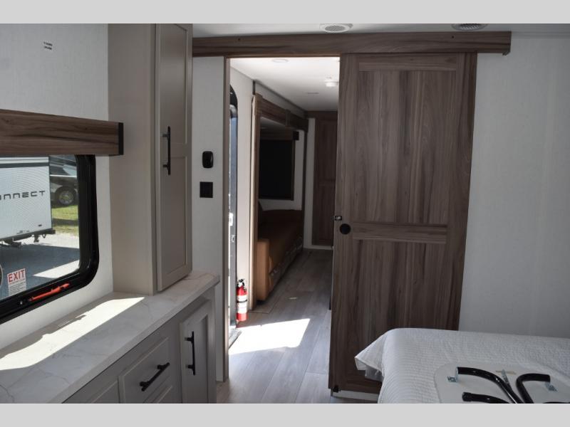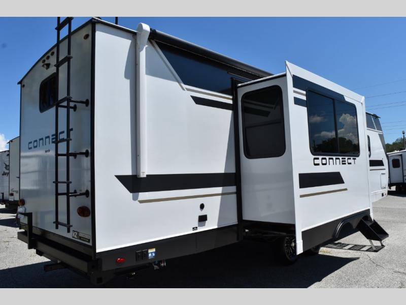 The perfect couple's trailer is found in this Connect! After you wake up each morning on the king bed slide, you can use the walk-in closet to get ready for the day. There is also a dresser here and a TV mount if you want the option to watch movies in bed. A three burner range and microwave oven in the full kitchen will let you make breakfast before heading out for the day, and the theater seating will provide a place to relax once you get back. The entertainment center with a fireplace will make this room feel more like home, and the kitchen island includes ample counter space with its flip-up top. The full rear bath includes dual bath sinks so you both can get ready at the same time, and the wardrobe with washer and dryer prep gives you the option to add these appliances.