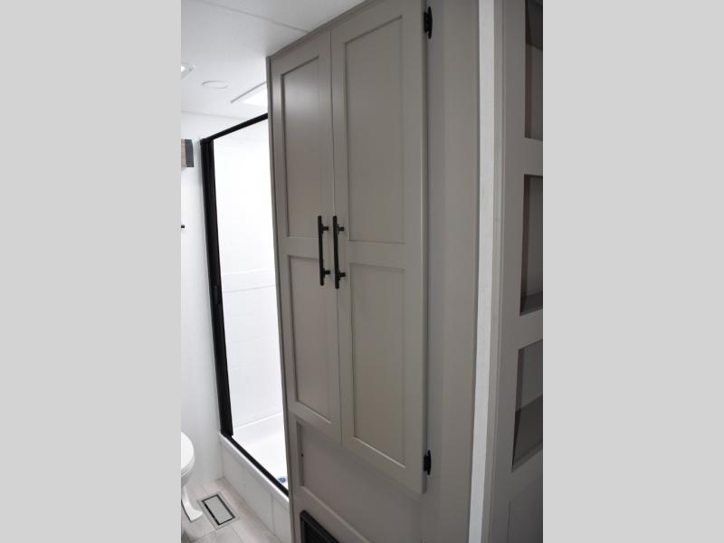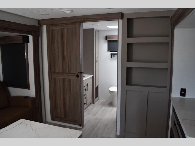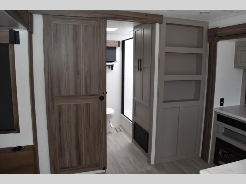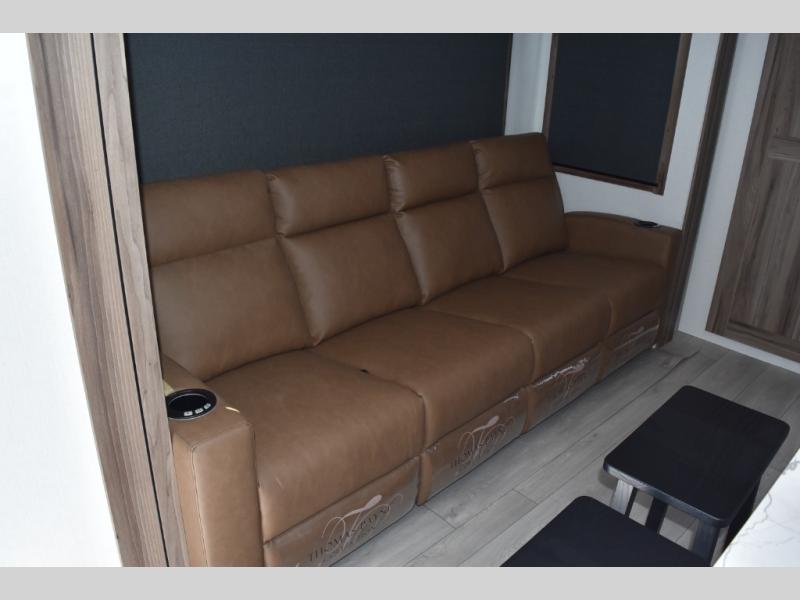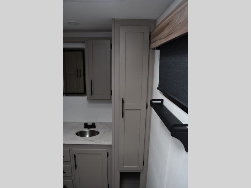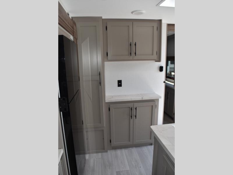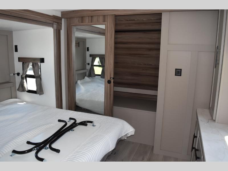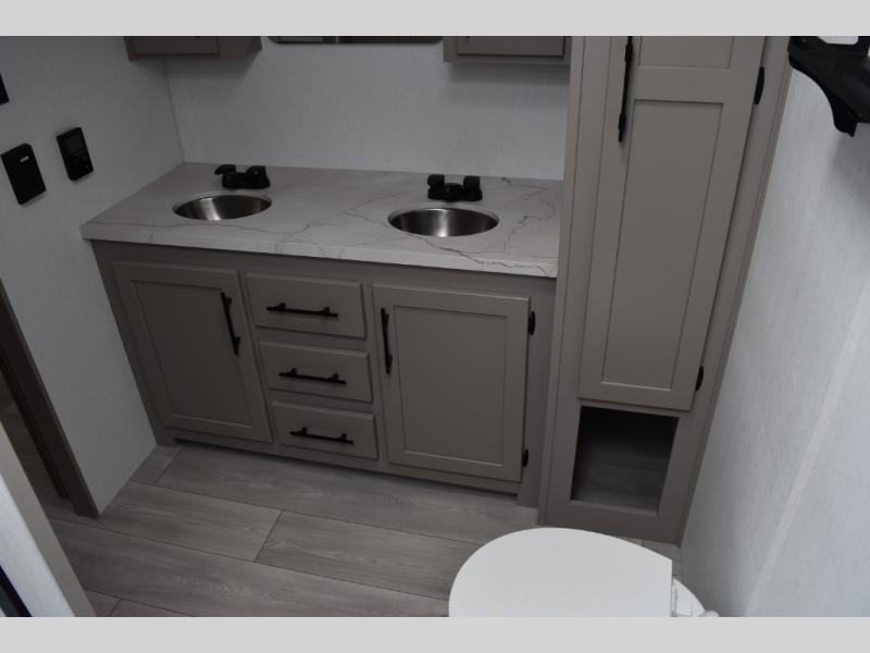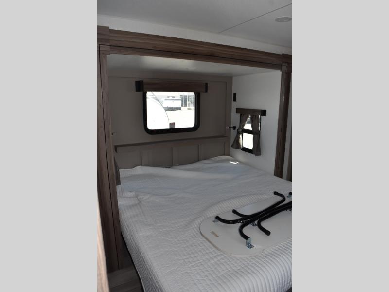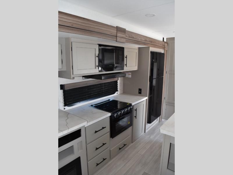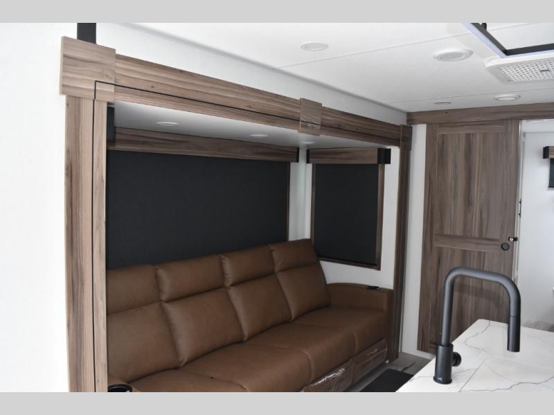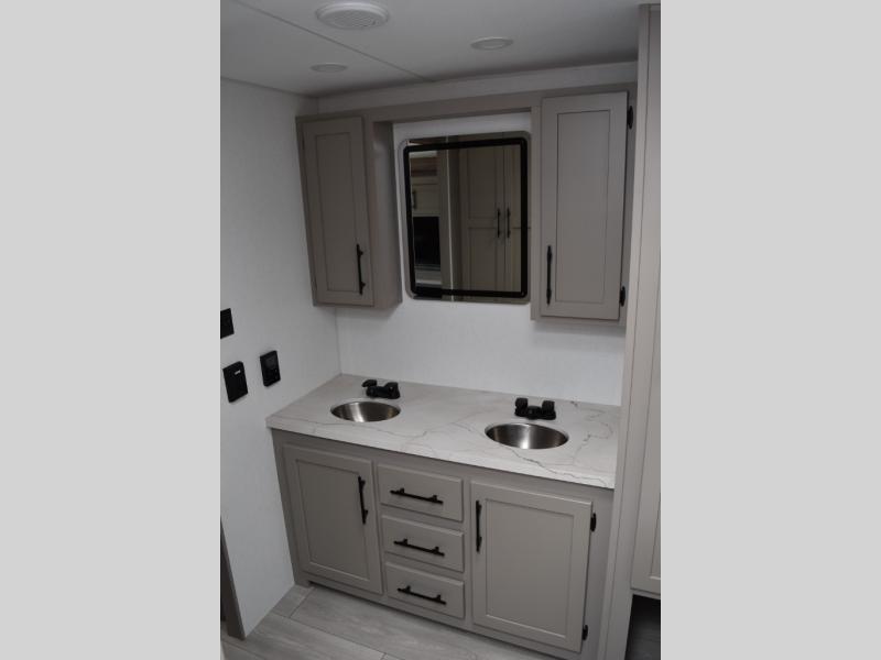 The perfect couple's trailer is found in this Connect! After you wake up each morning on the king bed slide, you can use the walk-in closet to get ready for the day. There is also a dresser here and a TV mount if you want the option to watch movies in bed. A three burner range and microwave oven in the full kitchen will let you make breakfast before heading out for the day, and the theater seating will provide a place to relax once you get back. The entertainment center with a fireplace will make this room feel more like home, and the kitchen island includes ample counter space with its flip-up top. The full rear bath includes dual bath sinks so you both can get ready at the same time, and the wardrobe with washer and dryer prep gives you the option to add these appliances.