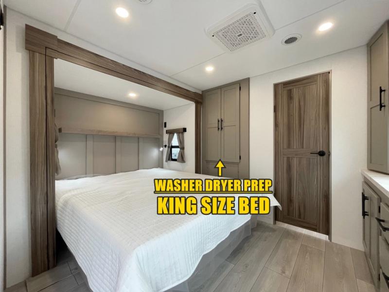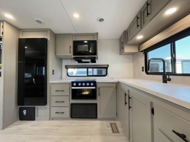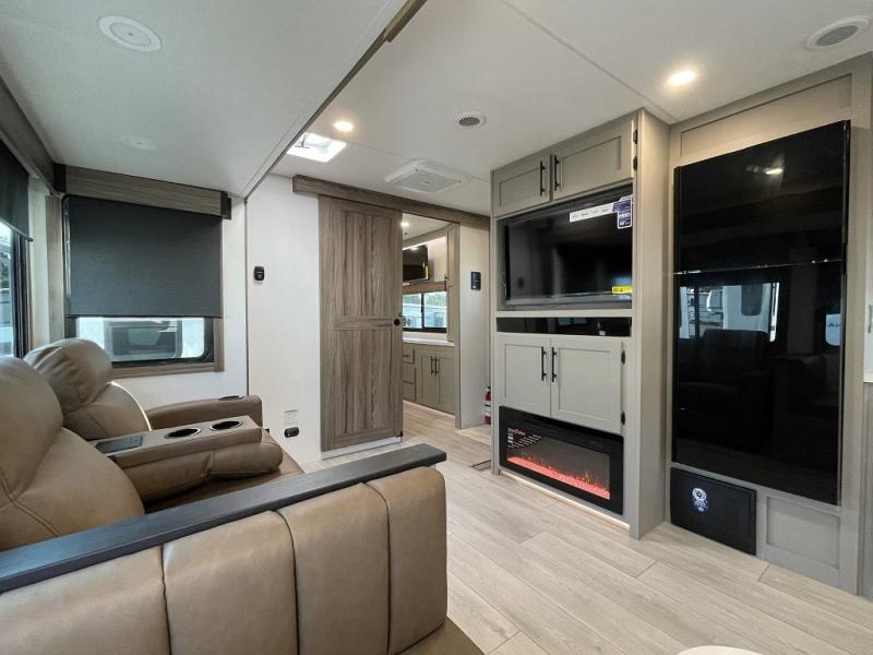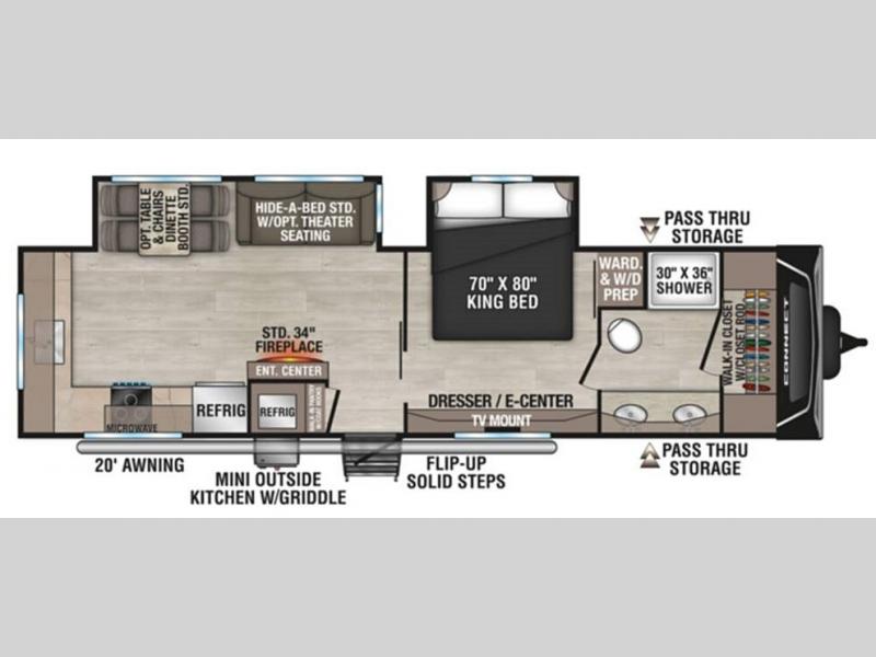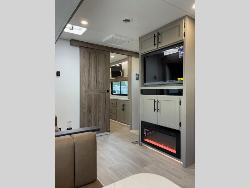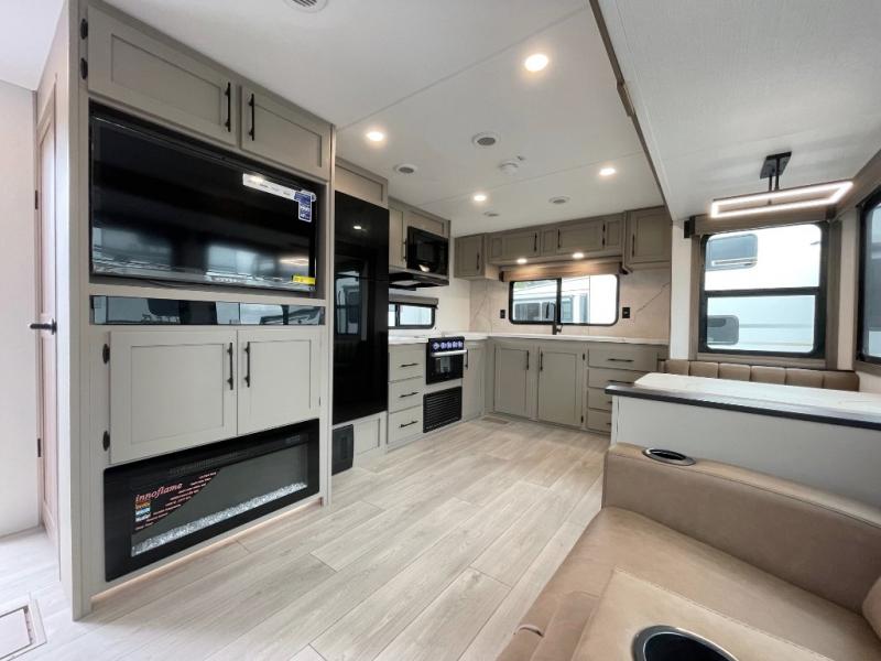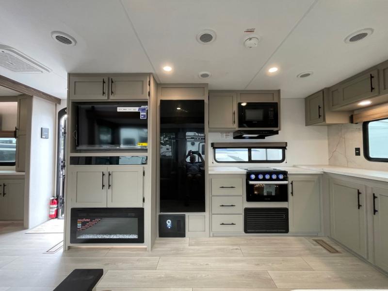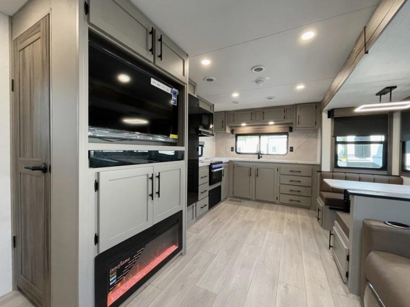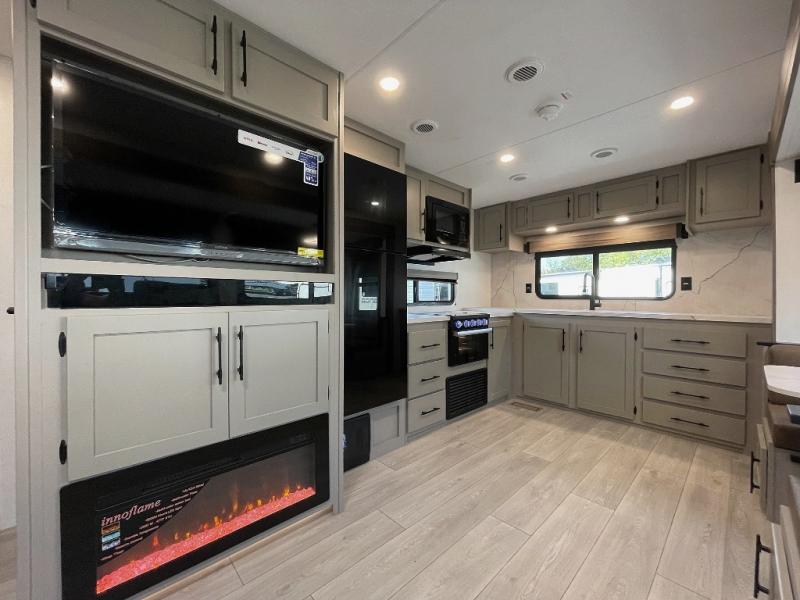 Pack your bags and head to the lake in this cozy travel trailer for five. Once you unload your gear from the pass-through storage, prepare a quick lunch on the mini outside kitchen with a griddle and relax under the patio awning. If the weather is raining on your parade, just head indoors to cook on the three burner cooktop, and you'll find ample counter space in this rear kitchen to set out drinks and sides. Your crew can relax on the hide-a-bed sofa and booth dinette within the large slide out, and there is an LED TV and a 34" fireplace for a more at-home atmosphere. One of your favorite features of this trailer will probably be the master suite with a king bed slide out, a dresser and an entertainment center, plus easy access to the front full bath. Here, you'll find dual bath sinks, a spacious shower, plus a walk-in closet with a closet rod to keep your outfits wrinkle free. There is even a wardrobe in the bedroom with washer and dryer prep so you can keep all those clothes fresh and clean!