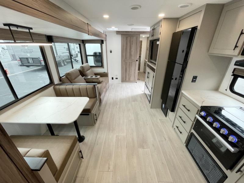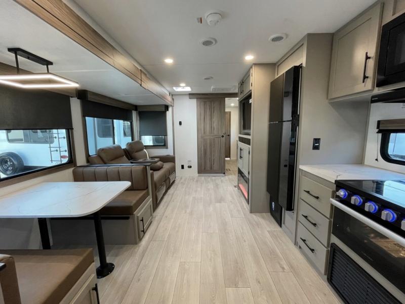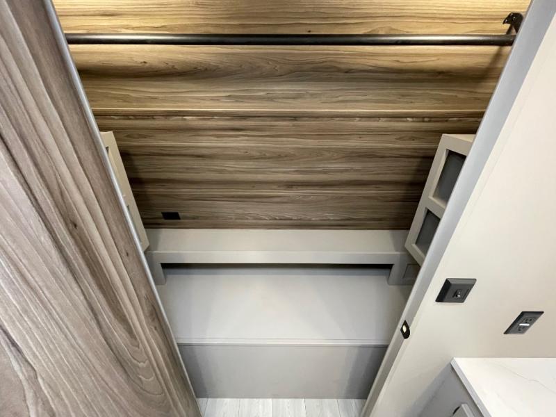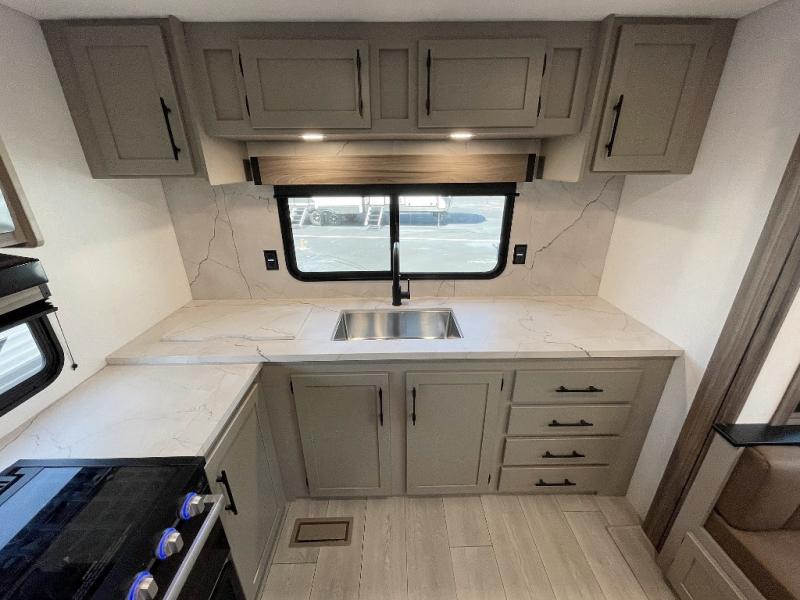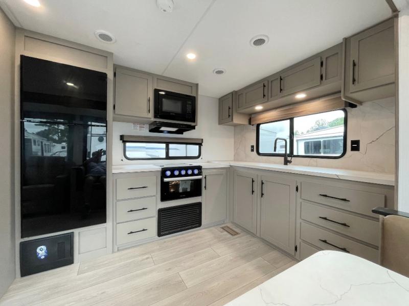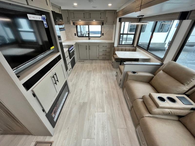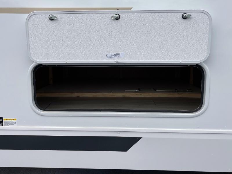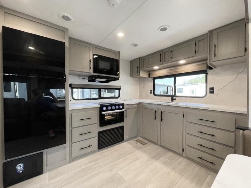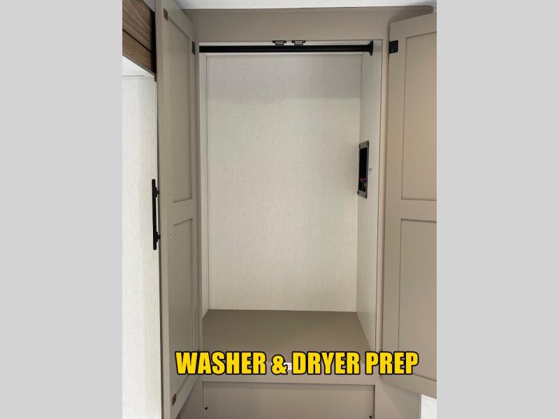 Pack your bags and head to the lake in this cozy travel trailer for five. Once you unload your gear from the pass-through storage, prepare a quick lunch on the mini outside kitchen with a griddle and relax under the patio awning. If the weather is raining on your parade, just head indoors to cook on the three burner cooktop, and you'll find ample counter space in this rear kitchen to set out drinks and sides. Your crew can relax on the hide-a-bed sofa and booth dinette within the large slide out, and there is an LED TV and a 34" fireplace for a more at-home atmosphere. One of your favorite features of this trailer will probably be the master suite with a king bed slide out, a dresser and an entertainment center, plus easy access to the front full bath. Here, you'll find dual bath sinks, a spacious shower, plus a walk-in closet with a closet rod to keep your outfits wrinkle free. There is even a wardrobe in the bedroom with washer and dryer prep so you can keep all those clothes fresh and clean!