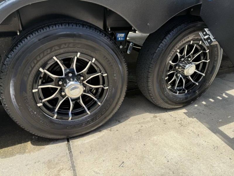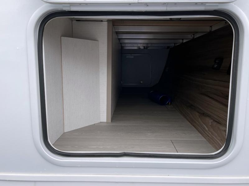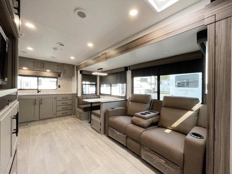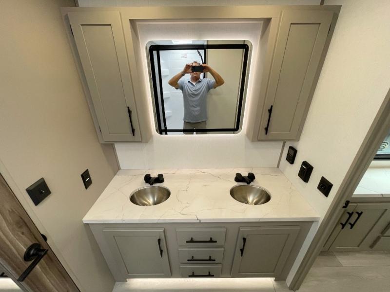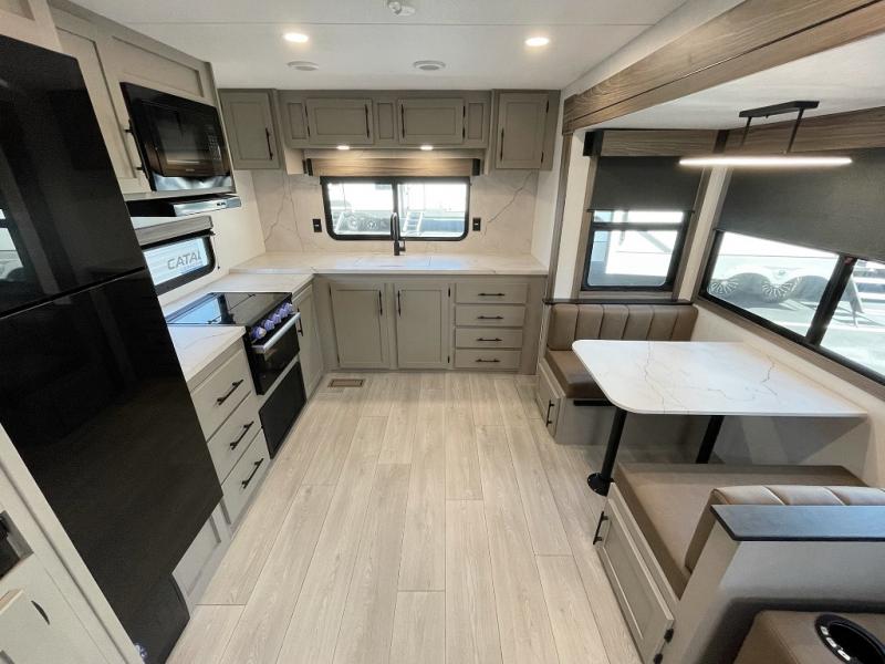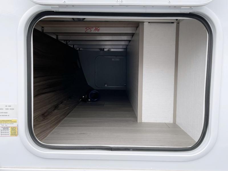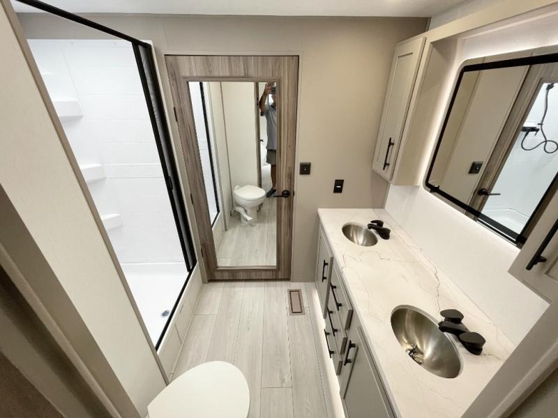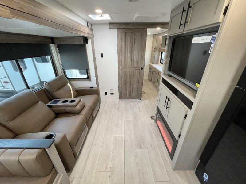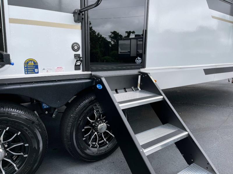 Pack your bags and head to the lake in this cozy travel trailer for five. Once you unload your gear from the pass-through storage, prepare a quick lunch on the mini outside kitchen with a griddle and relax under the patio awning. If the weather is raining on your parade, just head indoors to cook on the three burner cooktop, and you'll find ample counter space in this rear kitchen to set out drinks and sides. Your crew can relax on the hide-a-bed sofa and booth dinette within the large slide out, and there is an LED TV and a 34" fireplace for a more at-home atmosphere. One of your favorite features of this trailer will probably be the master suite with a king bed slide out, a dresser and an entertainment center, plus easy access to the front full bath. Here, you'll find dual bath sinks, a spacious shower, plus a walk-in closet with a closet rod to keep your outfits wrinkle free. There is even a wardrobe in the bedroom with washer and dryer prep so you can keep all those clothes fresh and clean!