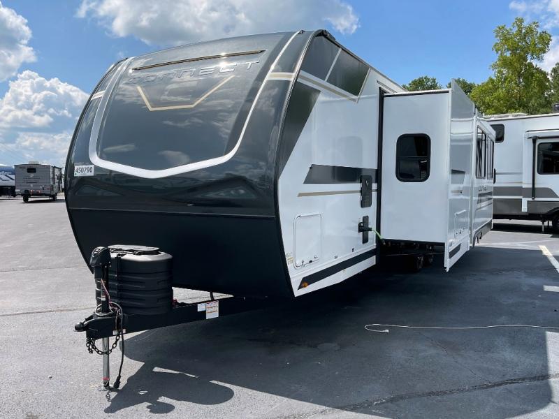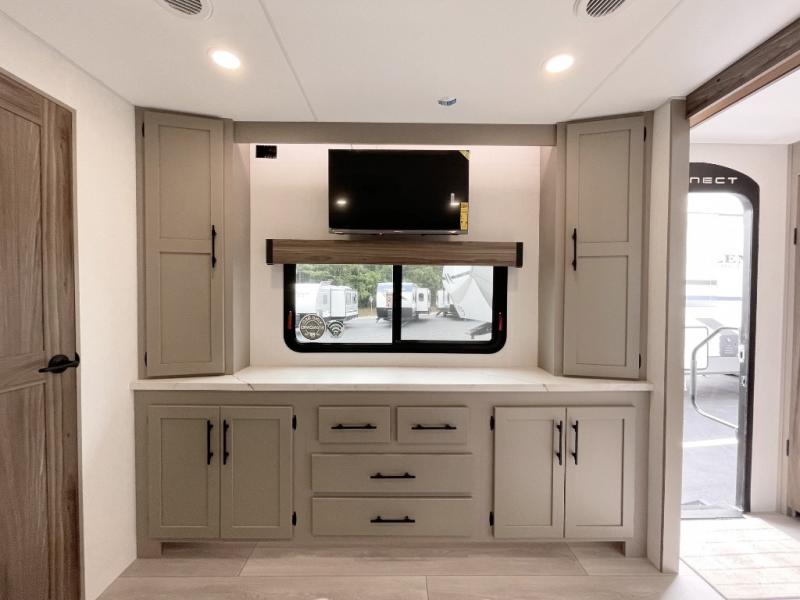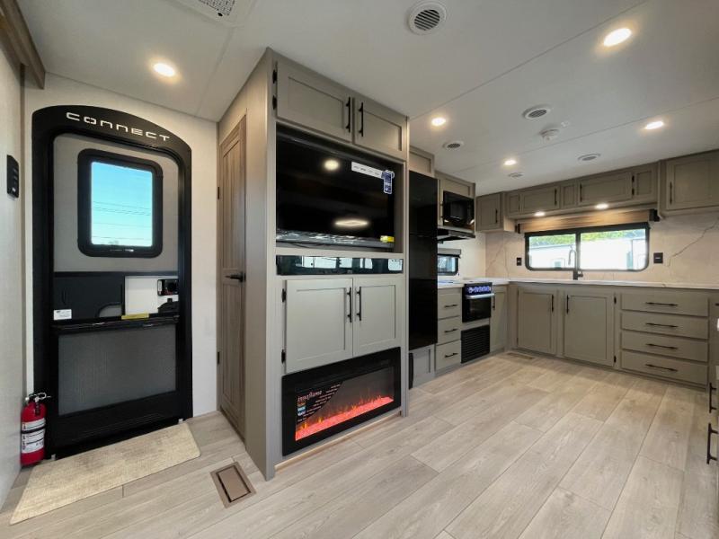 The KZ Connect travel trailer comes with an RV Airflow System which optimizes the airflow for your air conditioner by increasing the airflow by an average of 40%. This improves performance, speeds up cooling times, and reduces noise in your trailer. Some of the other helpful features found on the Connect are the heated, insulated, and enclosed underbelly, the exterior docking station, the fiberglass front cap with front windshield, the 82" interior ceiling height, and the protective front diamond plate. There are some useful technological features, like the two LED motion-sensor lights, the HDMI and USB charge, and the multi-media entertainment system with a DVD player. The KZ Engage is powered by OneControl, and it monitors battery levels and controls slide rooms, the leveling system, the awning, inside/outside lighting, and the TPMS prep.