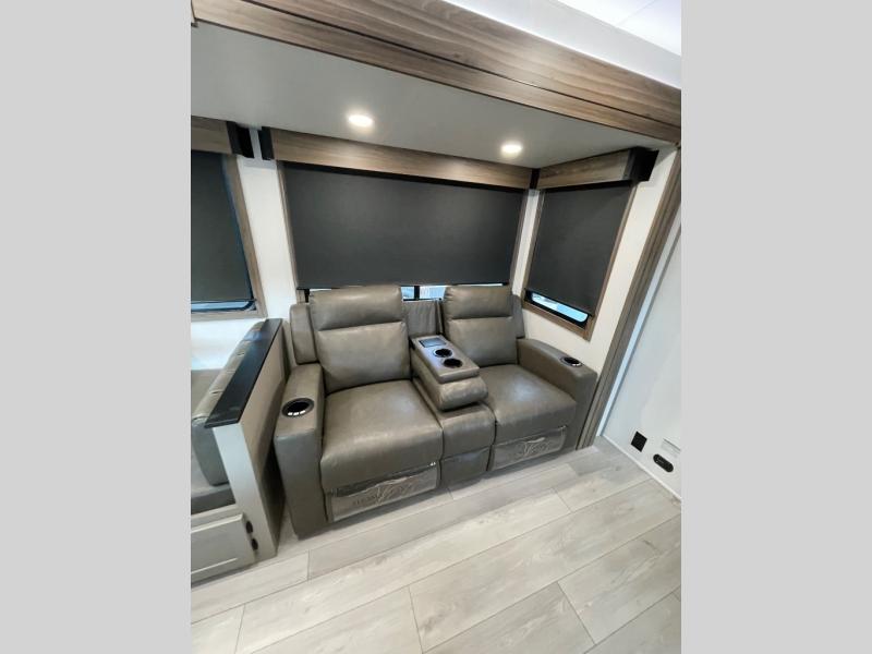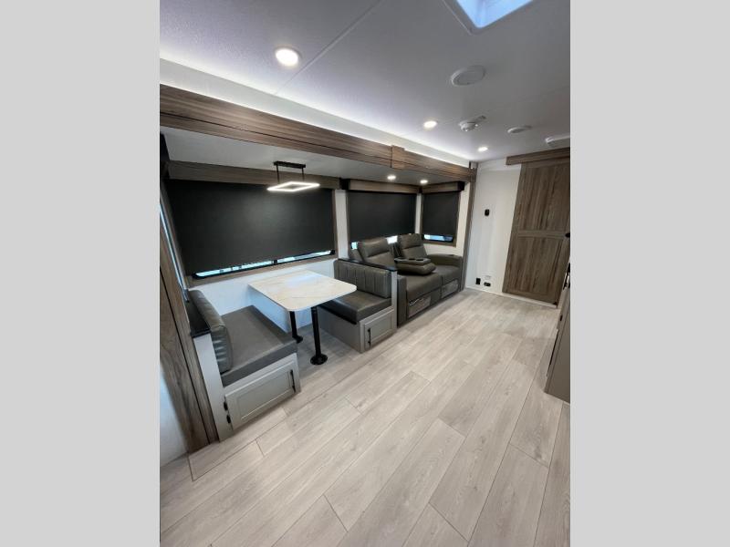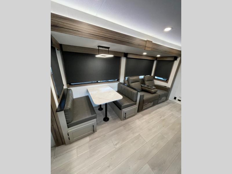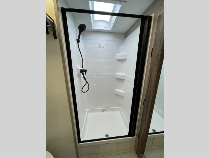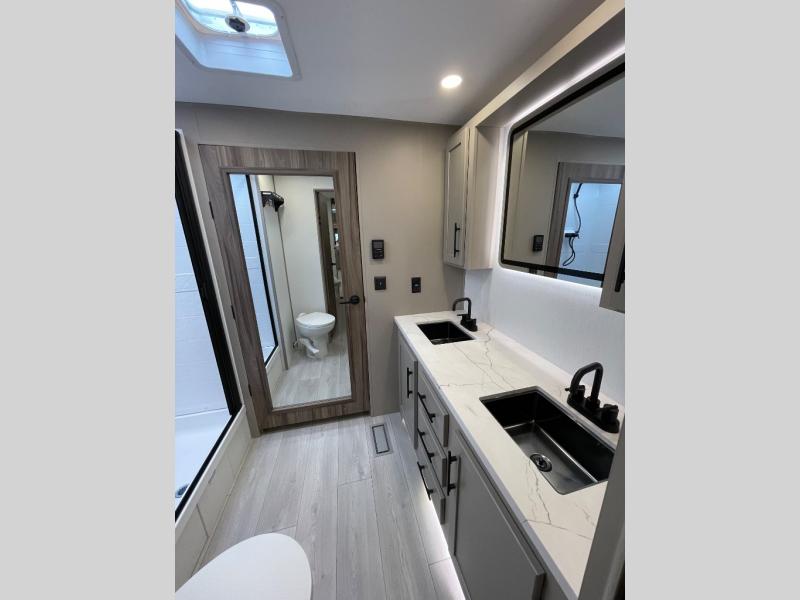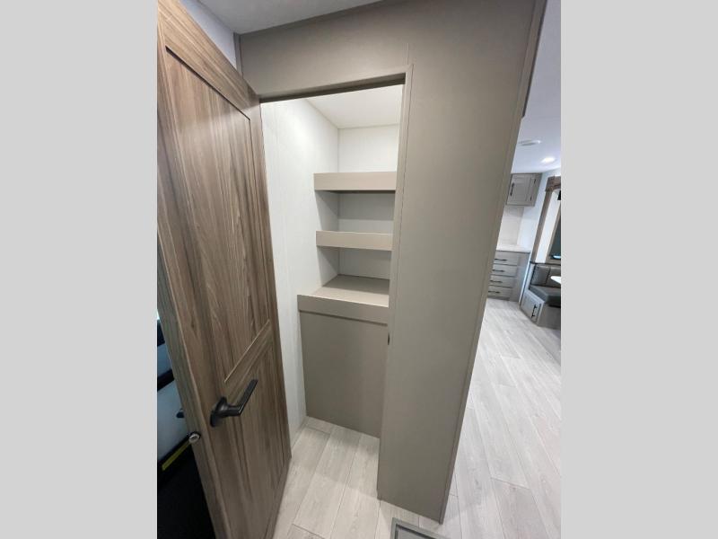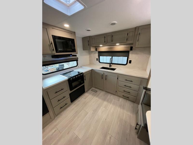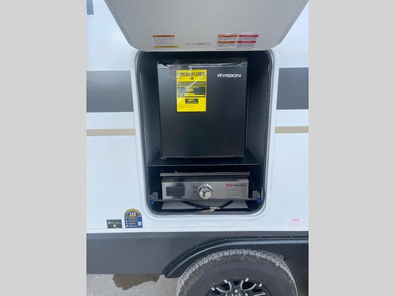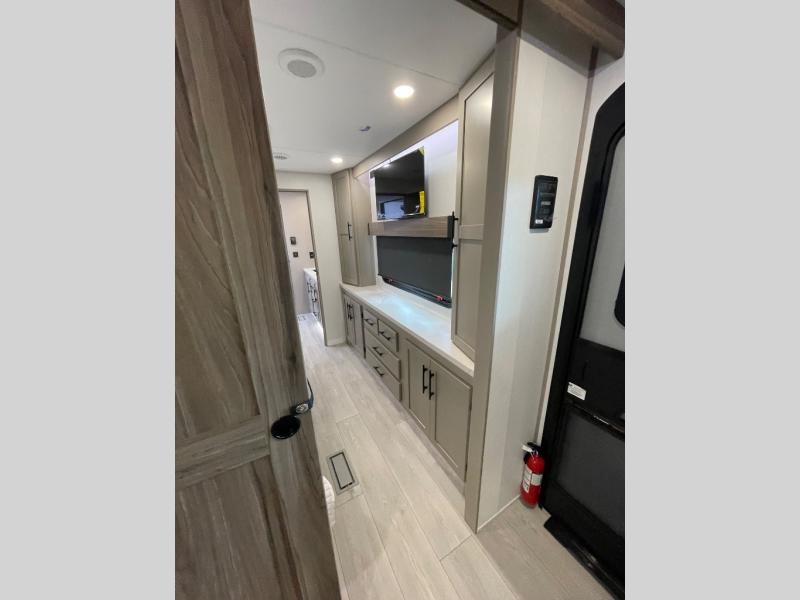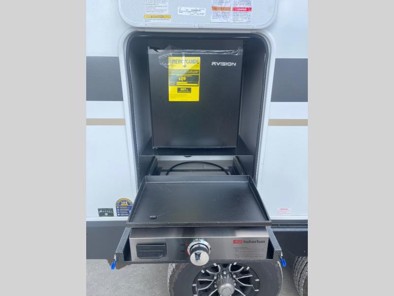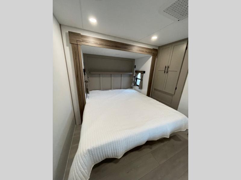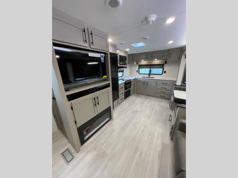 Pack your bags and head to the lake in this cozy travel trailer for five. Once you unload your gear from the pass-through storage, prepare a quick lunch on the mini outside kitchen with a griddle and relax under the patio awning. If the weather is raining on your parade, just head indoors to cook on the three burner cooktop, and you'll find ample counter space in this rear kitchen to set out drinks and sides. Your crew can relax on the hide-a-bed sofa and booth dinette within the large slide out, and there is an LED TV and a 34" fireplace for a more at-home atmosphere. One of your favorite features of this trailer will probably be the master suite with a king bed slide out, a dresser and an entertainment center, plus easy access to the front full bath. Here, you'll find dual bath sinks, a spacious shower, plus a walk-in closet with a closet rod to keep your outfits wrinkle free. There is even a wardrobe in the bedroom with washer and dryer prep so you can keep all those clothes fresh and clean!