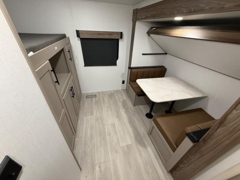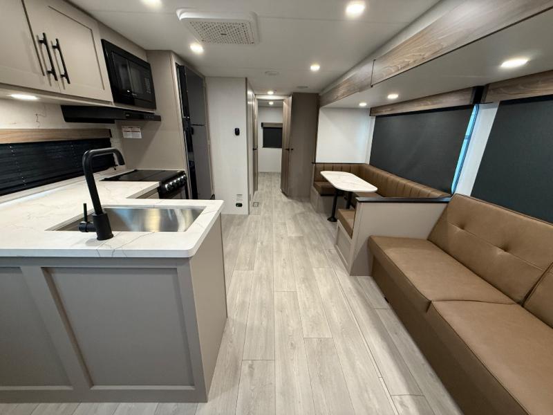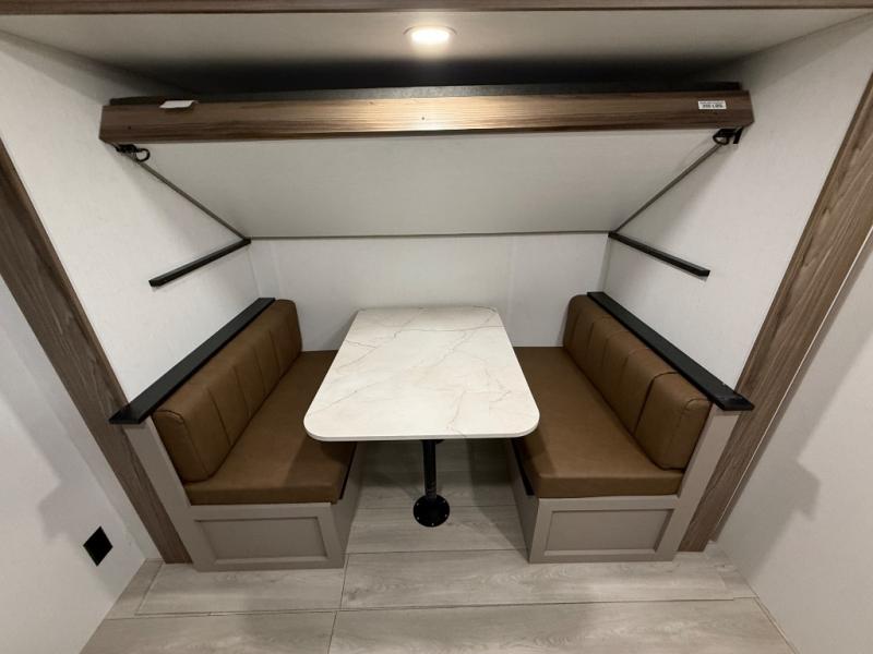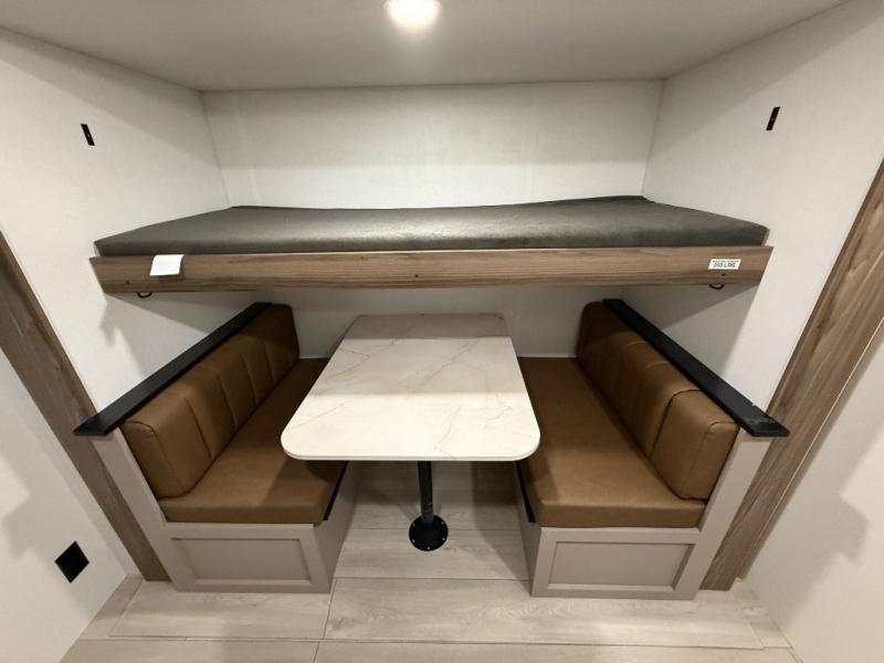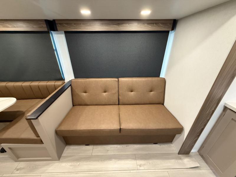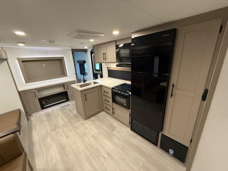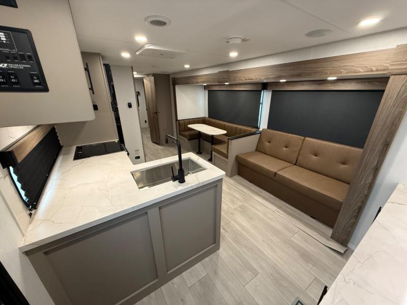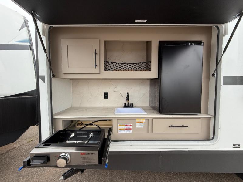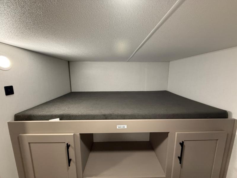 Your kids or your friends will love having their own privacy in the rear bunkhouse which offers two bunks and a dinette to play games or dine at, plus there is a closet for their storage. The full bathroom is conveniently located and includes the second exterior entry for quick and easy access to the fun happening outside. You will have your own private bedroom on the opposite side of the trailer, and it includes a walk-around queen bed, dual wardrobes and a sliding entry door. The main living and kitchen area is spacious with a large slide out, and you can relax on the 64" sofa or the 80" U-shaped dinette while the cook makes meals with full amenities including a 10 cu. ft. 12V refrigerator and a pantry for food storage.