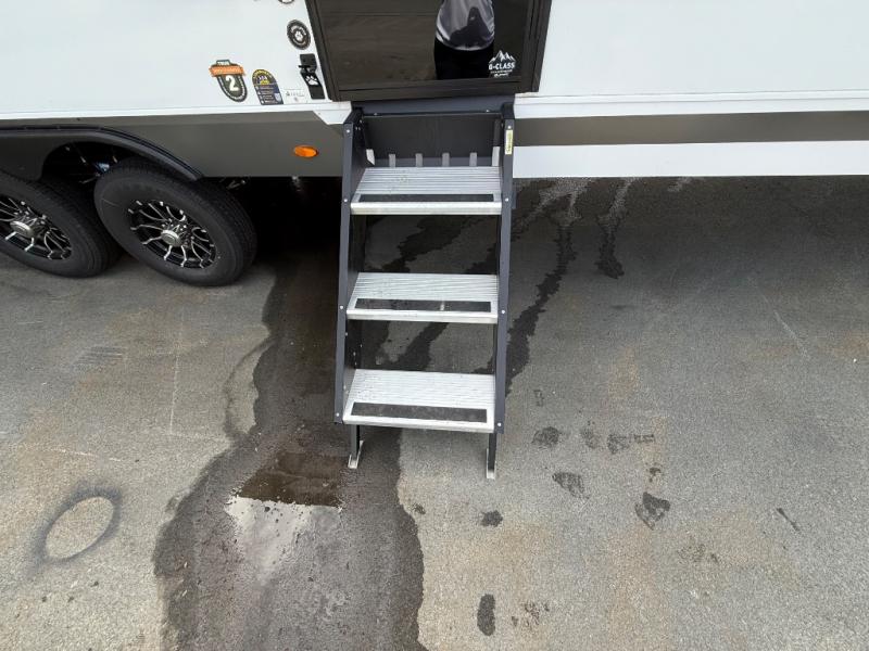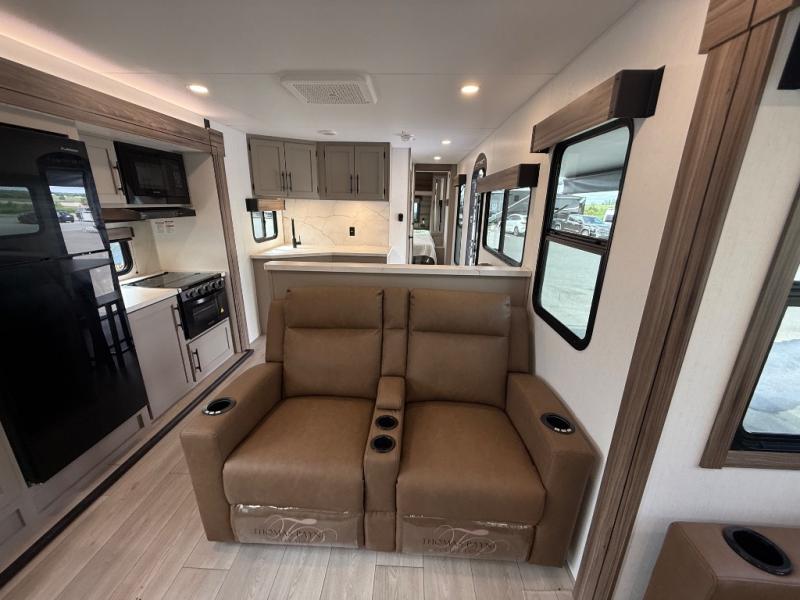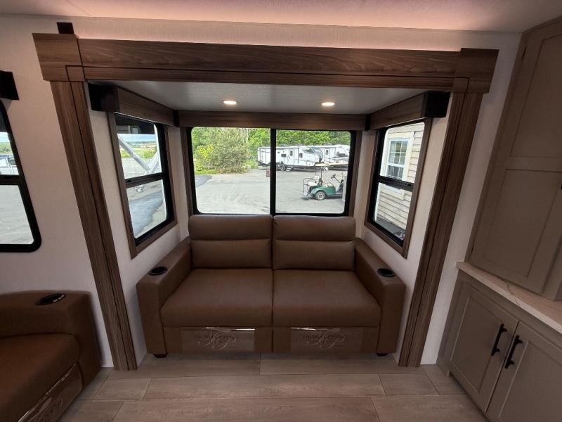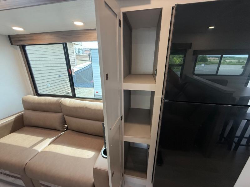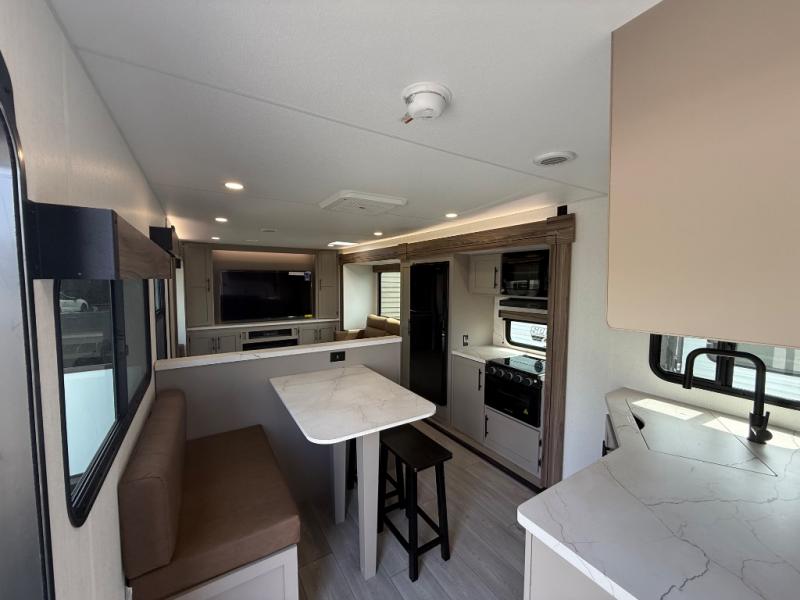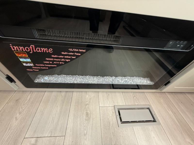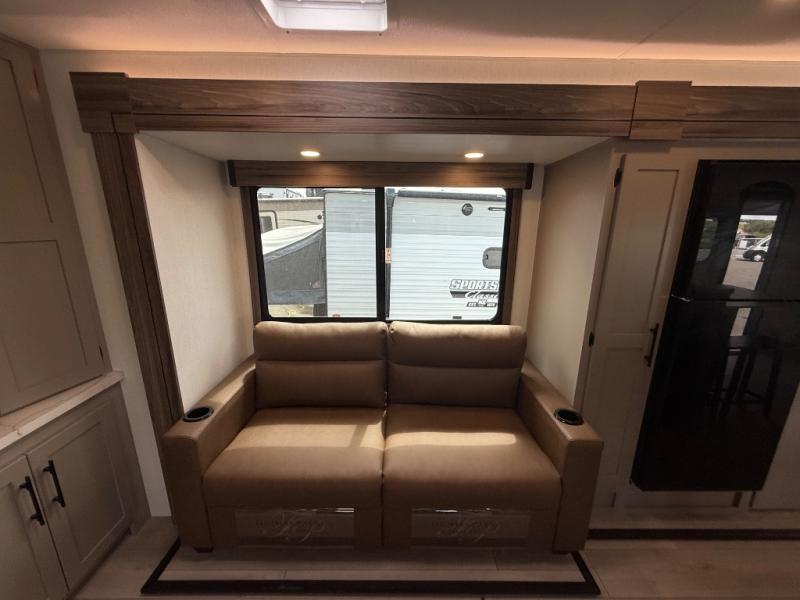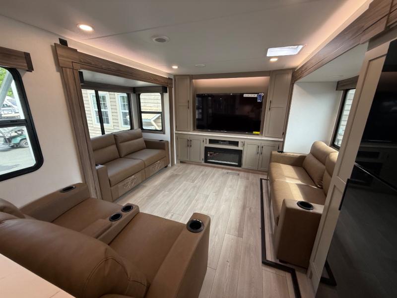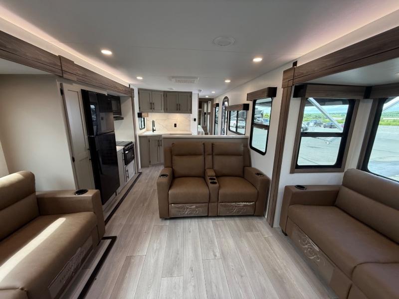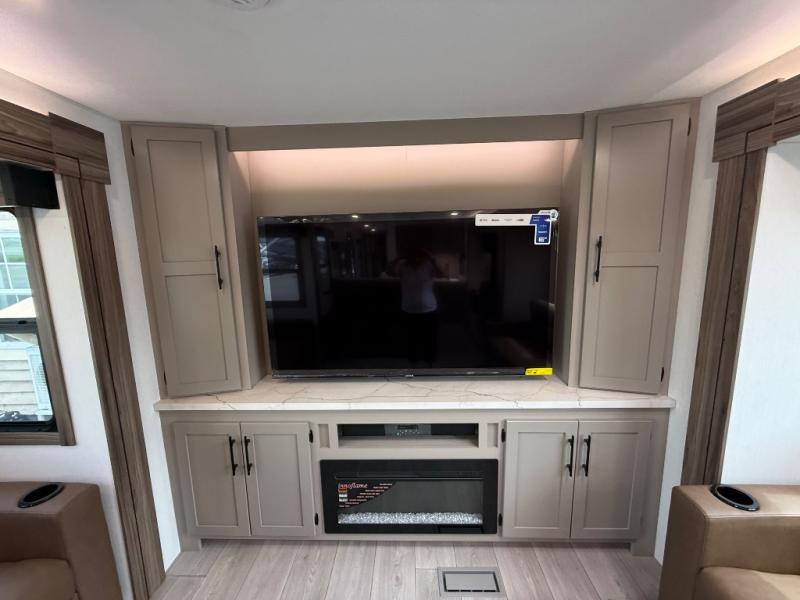 Head for the hills, lake, or woods in this spacious travel trailer. Once your gear is unloaded from the pass-through storage, set up the 19' power awning with LED lights and relax with a cold drink. Once you head inside you can make lunch on the three burner range and dine at the dinette that includes two chairs and bench seating. The rear living area includes a rear entertainment center with an LED TV and a 34" fireplace for a cozy atmosphere. There is also theater seating here and two 70" sofas within the dual opposing slides where your guests can sleep. And you will enjoy the front private bedroom with a king bed all to yourselves!