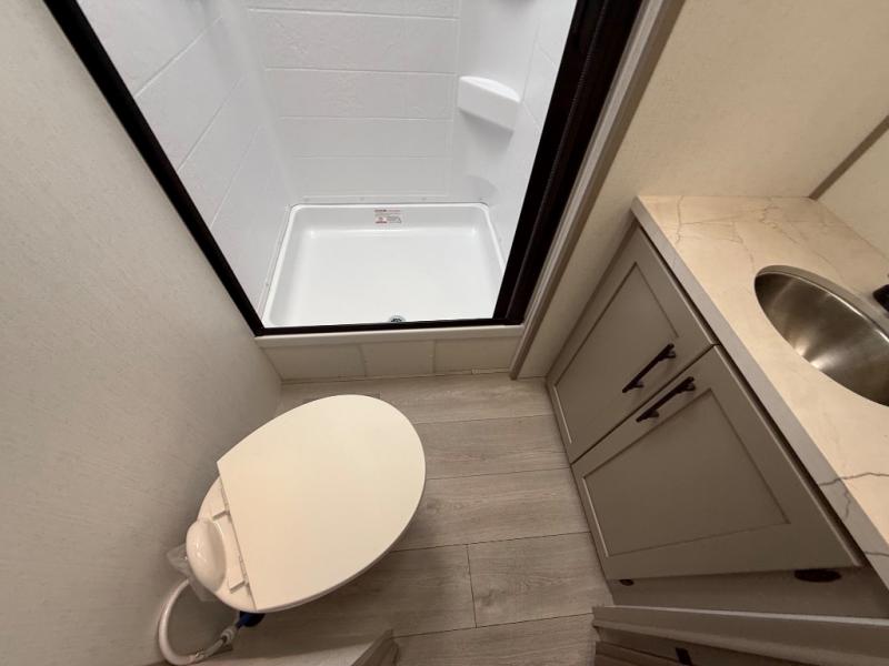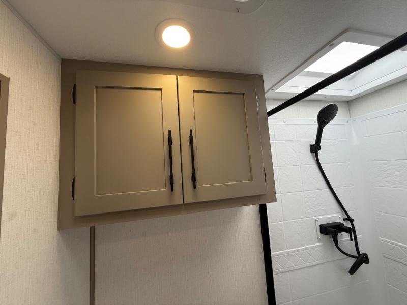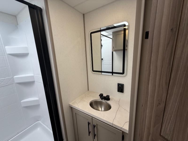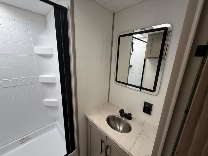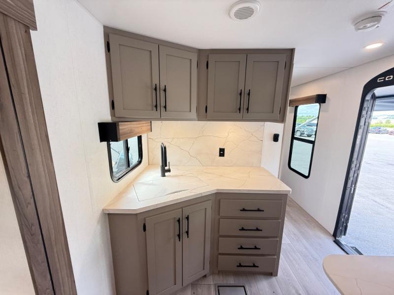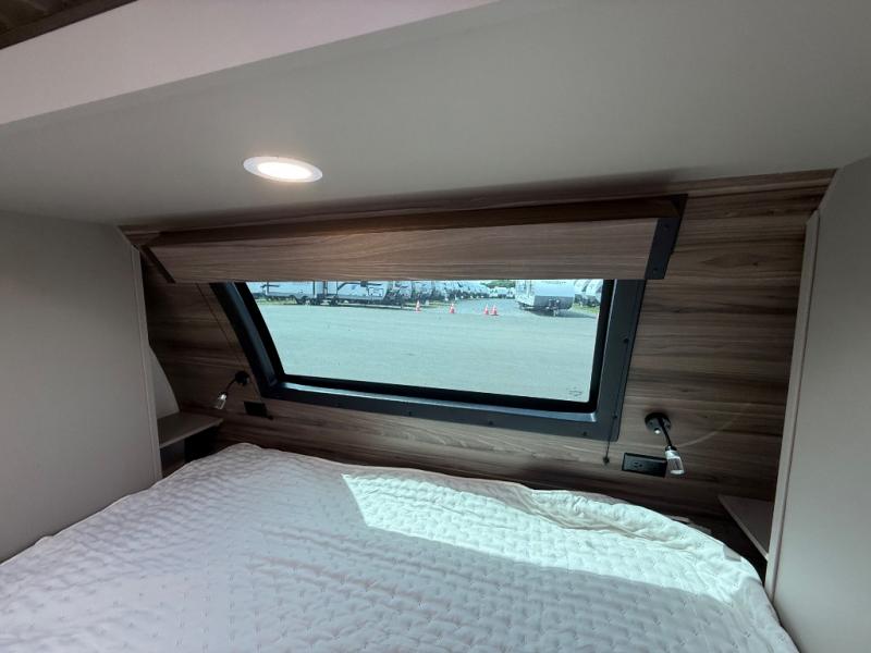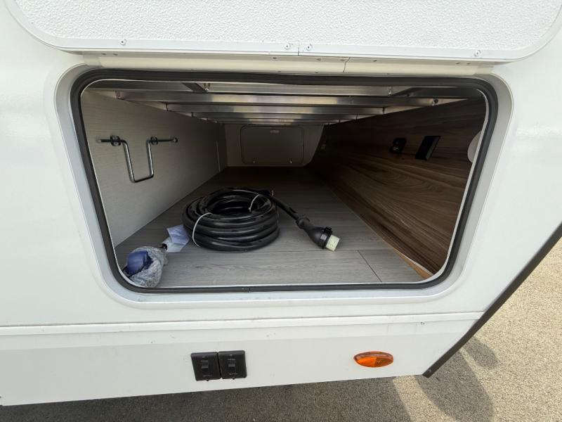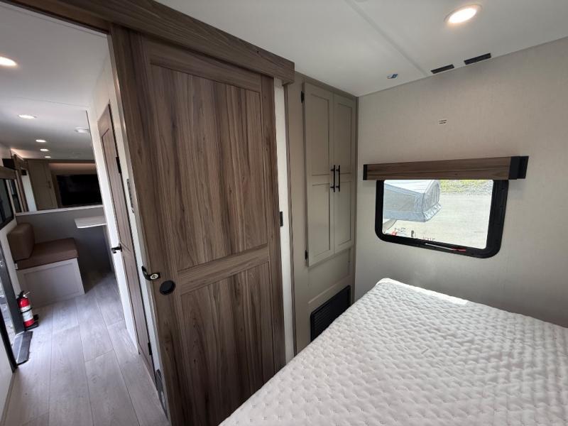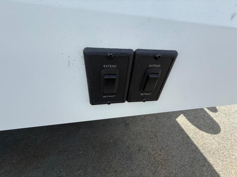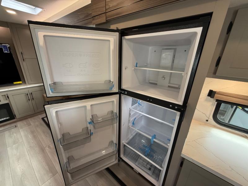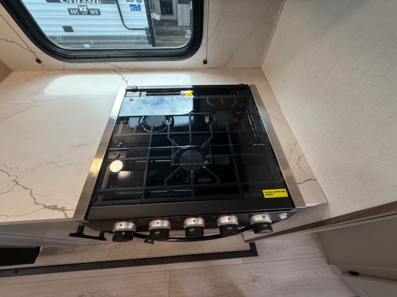 Head for the hills, lake, or woods in this spacious travel trailer. Once your gear is unloaded from the pass-through storage, set up the 19' power awning with LED lights and relax with a cold drink. Once you head inside you can make lunch on the three burner range and dine at the dinette that includes two chairs and bench seating. The rear living area includes a rear entertainment center with an LED TV and a 34" fireplace for a cozy atmosphere. There is also theater seating here and two 70" sofas within the dual opposing slides where your guests can sleep. And you will enjoy the front private bedroom with a king bed all to yourselves!