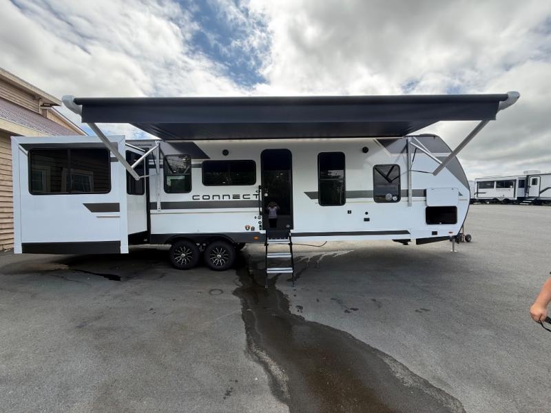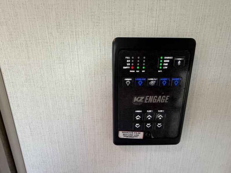 The KZ Connect travel trailer comes with an RV Airflow System which optimizes the airflow for your air conditioner by increasing the airflow by an average of 40%. This improves performance, speeds up cooling times, and reduces noise in your trailer. Some of the other helpful features found on the Connect are the heated, insulated, and enclosed underbelly, the exterior docking station, the fiberglass front cap with front windshield, the 82" interior ceiling height, and the protective front diamond plate. There are some useful technological features, like the two LED motion-sensor lights, the HDMI and USB charge, and the multi-media entertainment system with a DVD player. The KZ Engage is powered by OneControl, and it monitors battery levels and controls slide rooms, the leveling system, the awning, inside/outside lighting, and the TPMS prep.