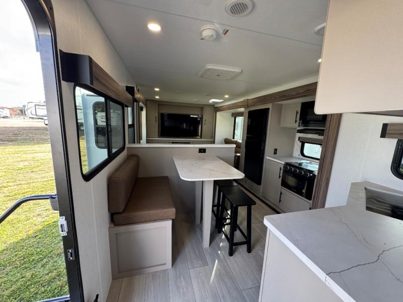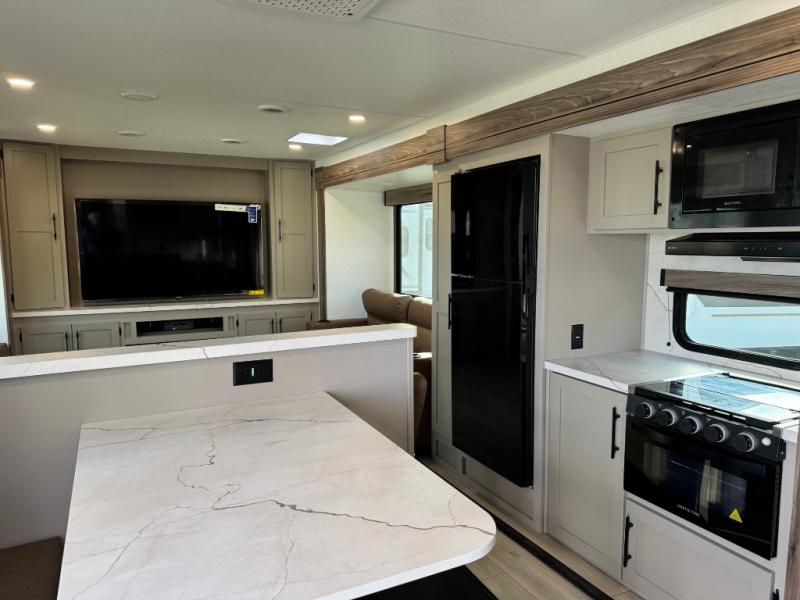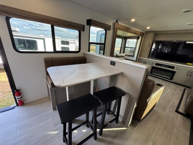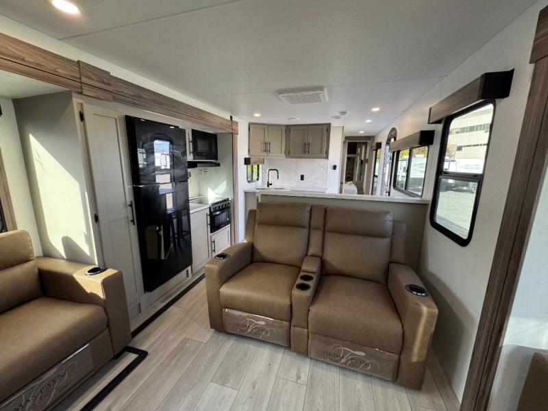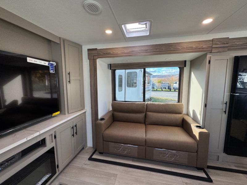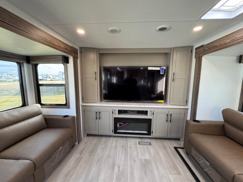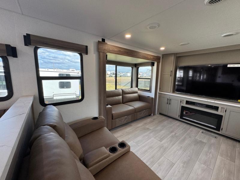 Head for the hills, lake, or woods in this spacious travel trailer. Once your gear is unloaded from the pass-through storage, set up the 19' power awning with LED lights and relax with a cold drink. Once you head inside you can make lunch on the three burner range and dine at the dinette that includes two chairs and bench seating. The rear living area includes a rear entertainment center with an LED TV and a 34" fireplace for a cozy atmosphere. There is also theater seating here and two 70" sofas within the dual opposing slides where your guests can sleep. And you will enjoy the front private bedroom with a king bed all to yourselves!