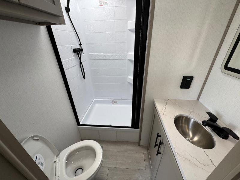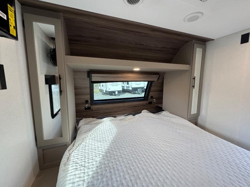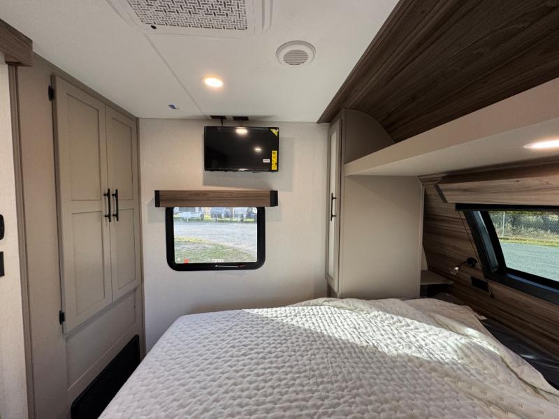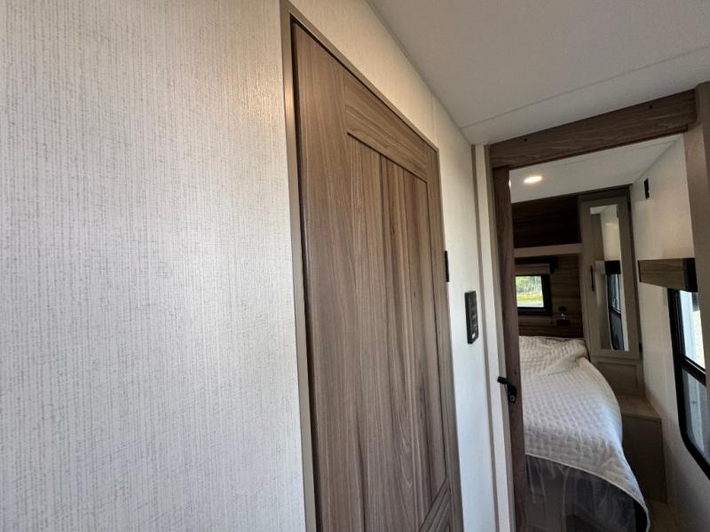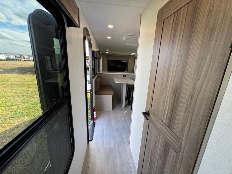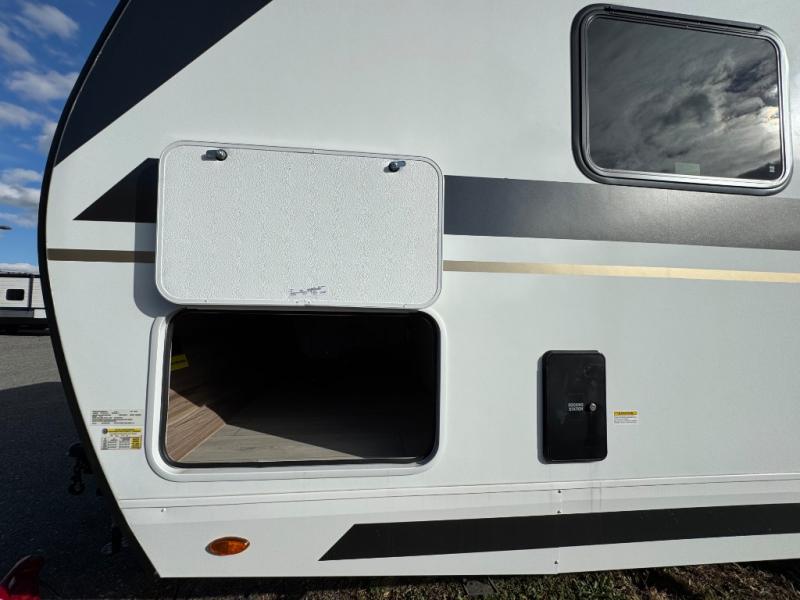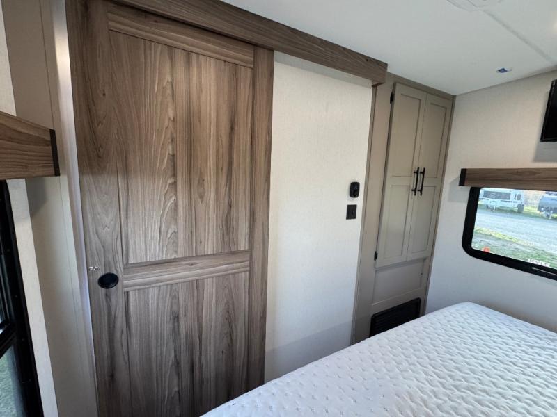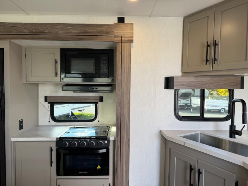 Head for the hills, lake, or woods in this spacious travel trailer. Once your gear is unloaded from the pass-through storage, set up the 19' power awning with LED lights and relax with a cold drink. Once you head inside you can make lunch on the three burner range and dine at the dinette that includes two chairs and bench seating. The rear living area includes a rear entertainment center with an LED TV and a 34" fireplace for a cozy atmosphere. There is also theater seating here and two 70" sofas within the dual opposing slides where your guests can sleep. And you will enjoy the front private bedroom with a king bed all to yourselves!