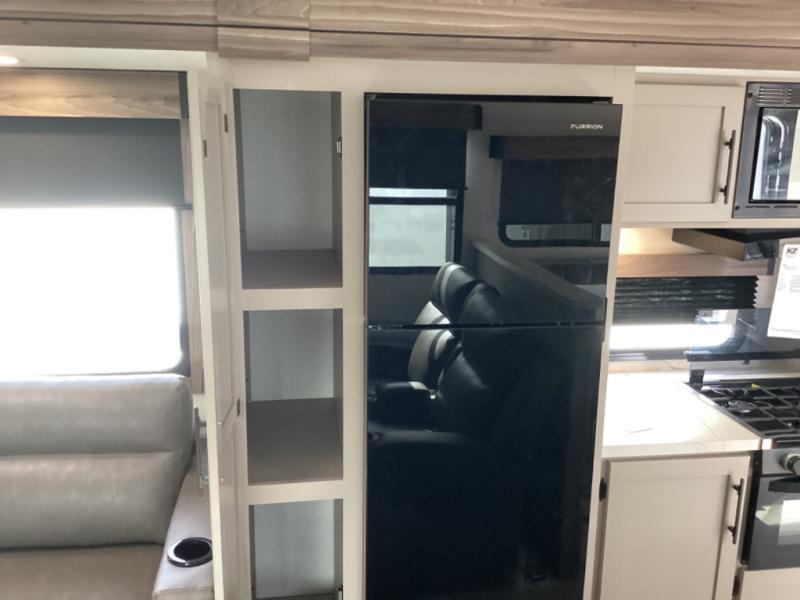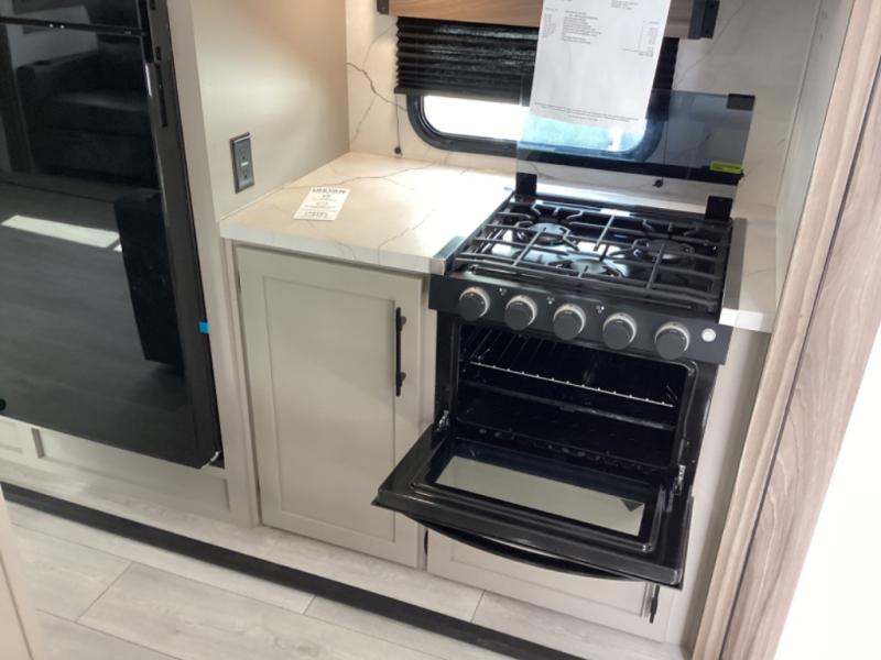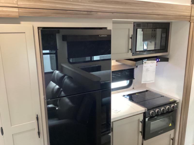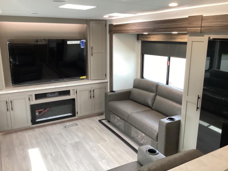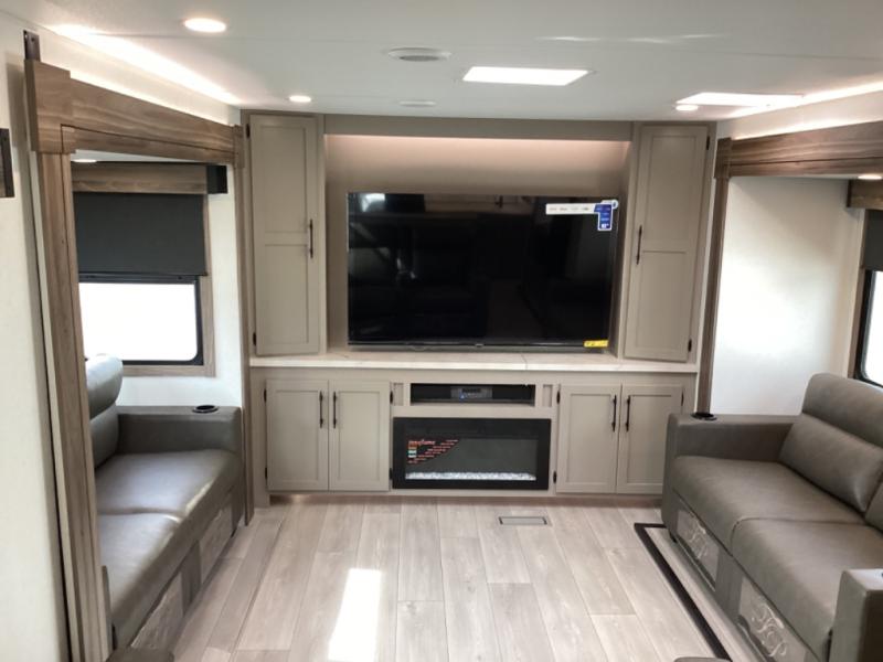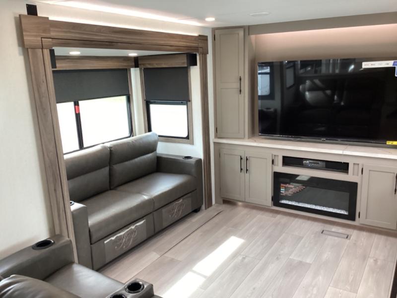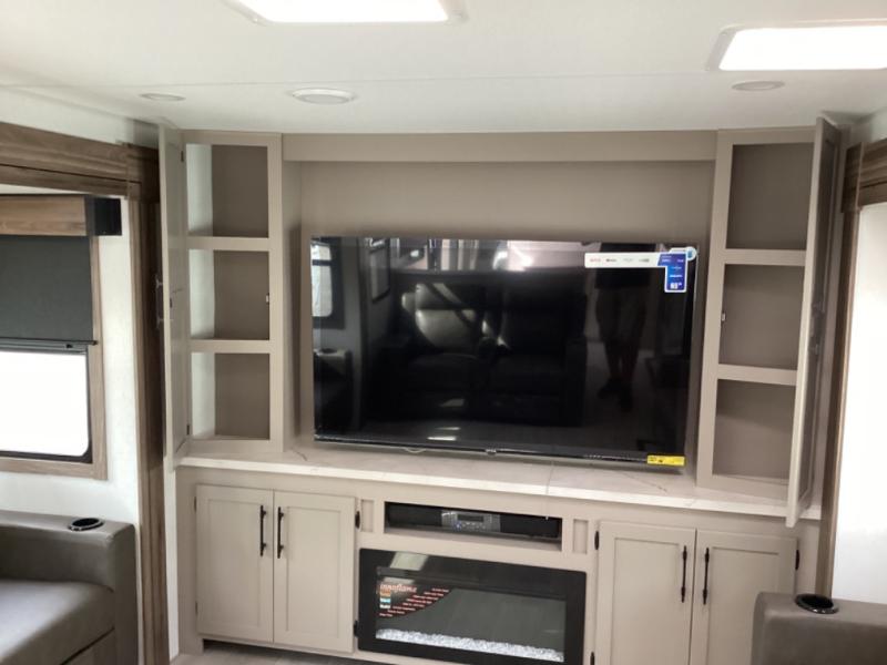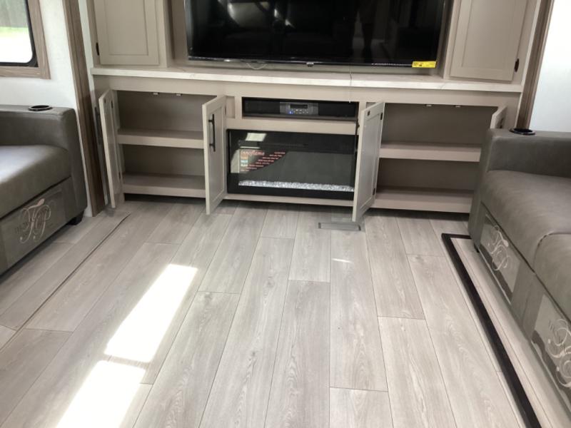 Head for the hills, lake, or woods in this spacious travel trailer. Once your gear is unloaded from the pass-through storage, set up the 19' power awning with LED lights and relax with a cold drink. Once you head inside you can make lunch on the three burner range and dine at the dinette that includes two chairs and bench seating. The rear living area includes a rear entertainment center with an LED TV and a 34" fireplace for a cozy atmosphere. There is also theater seating here and two 70" sofas within the dual opposing slides where your guests can sleep. And you will enjoy the front private bedroom with a king bed all to yourselves!
