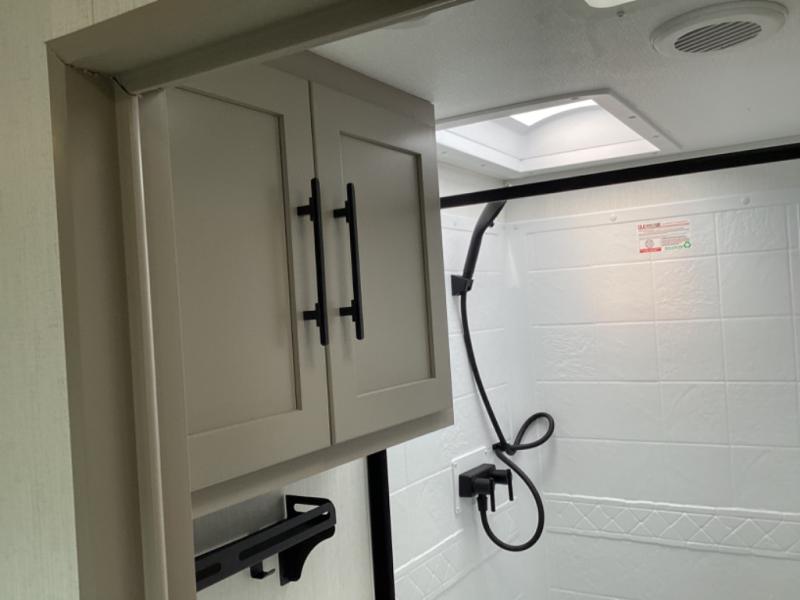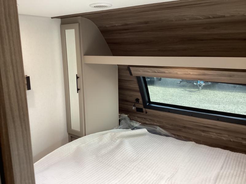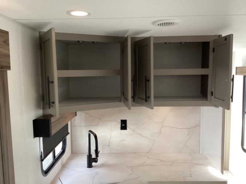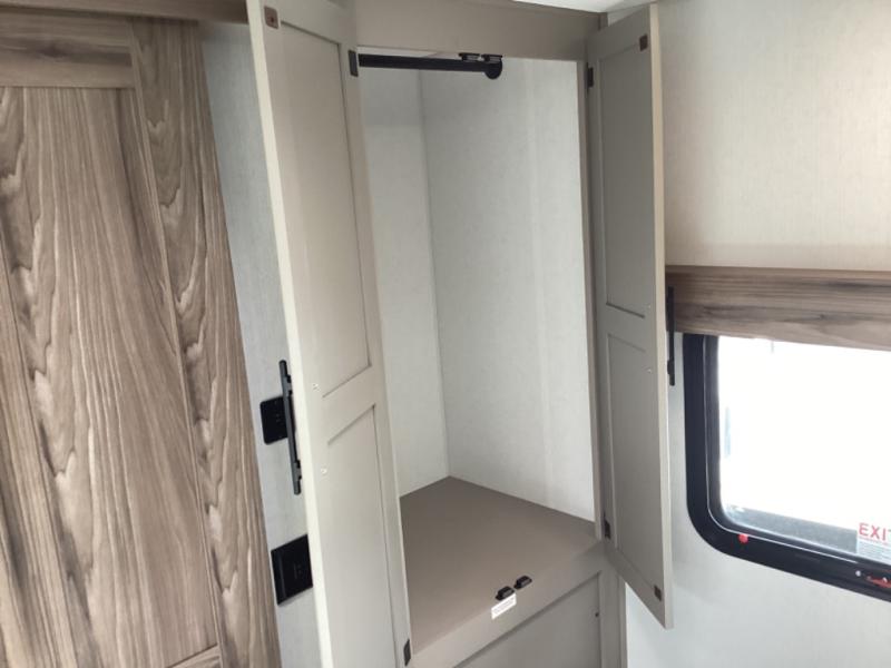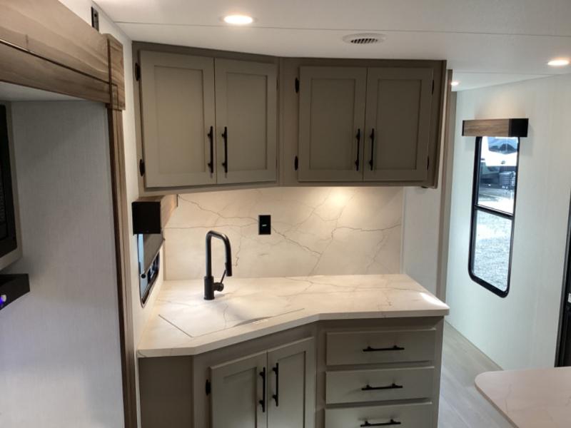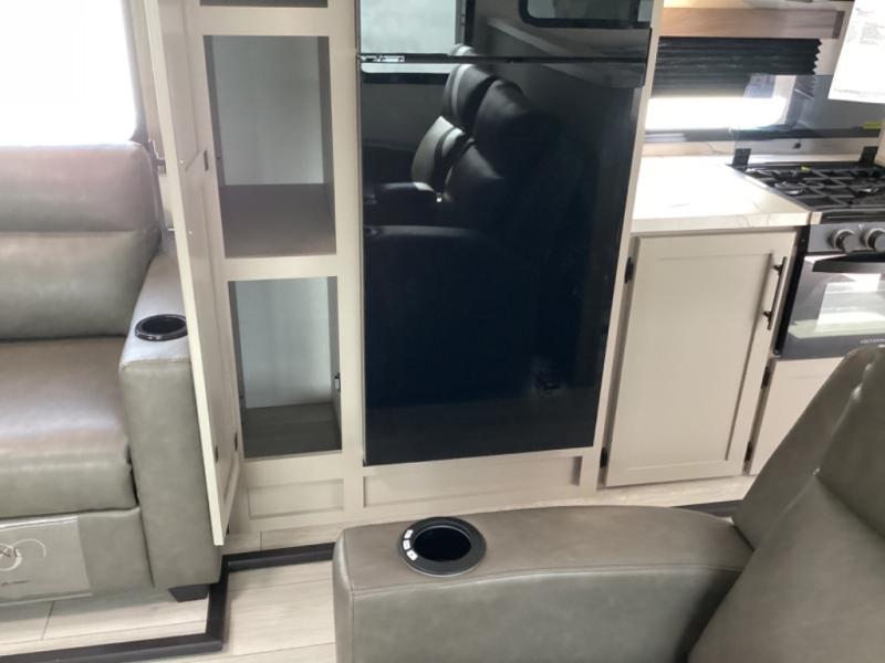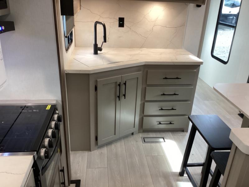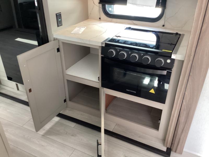 Head for the hills, lake, or woods in this spacious travel trailer. Once your gear is unloaded from the pass-through storage, set up the 19' power awning with LED lights and relax with a cold drink. Once you head inside you can make lunch on the three burner range and dine at the dinette that includes two chairs and bench seating. The rear living area includes a rear entertainment center with an LED TV and a 34" fireplace for a cozy atmosphere. There is also theater seating here and two 70" sofas within the dual opposing slides where your guests can sleep. And you will enjoy the front private bedroom with a king bed all to yourselves!