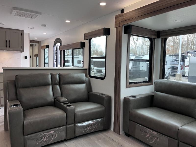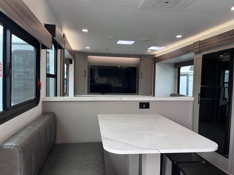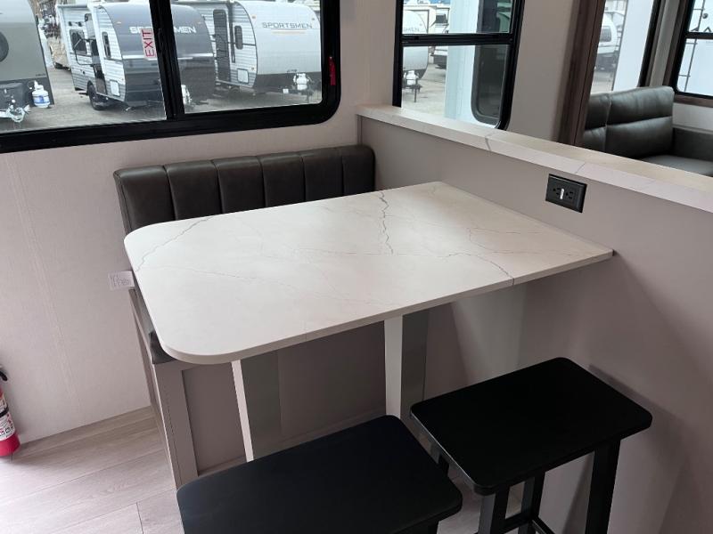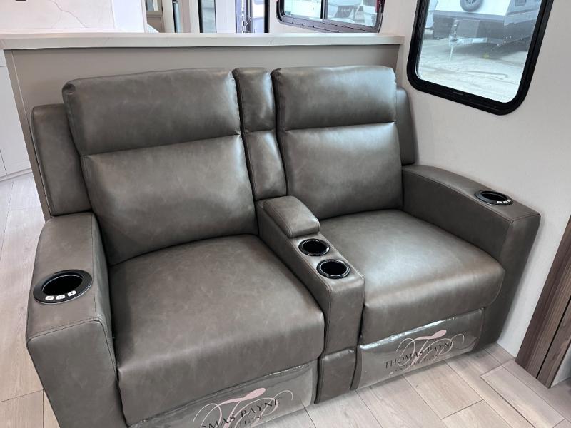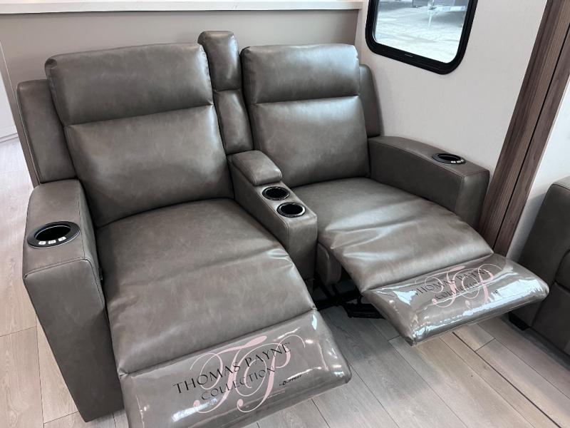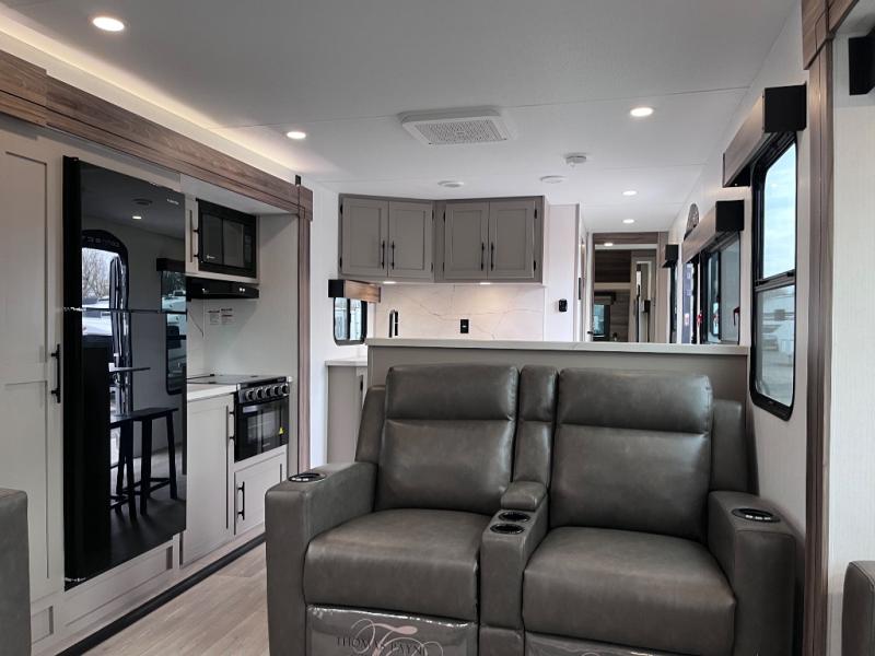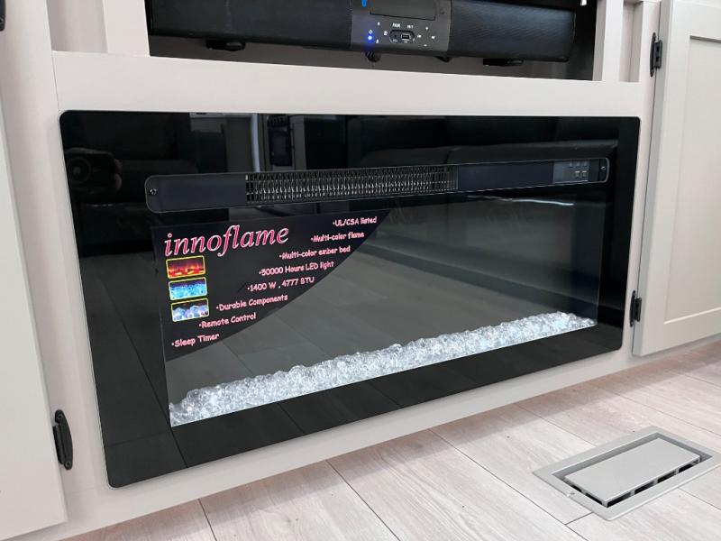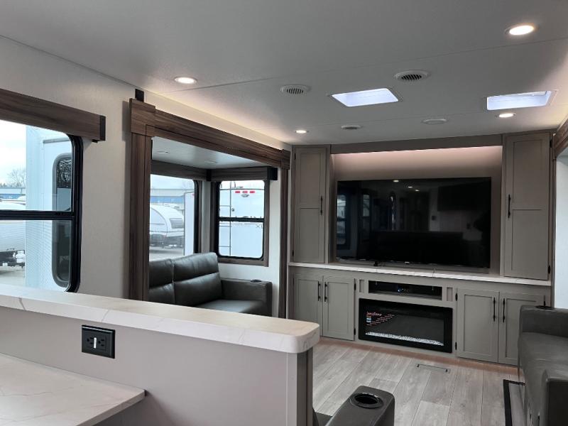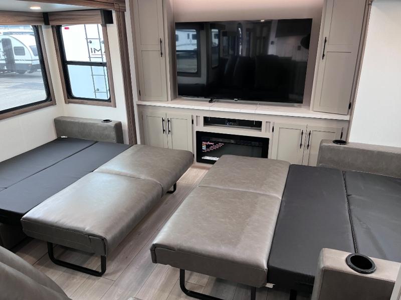 Head for the hills, lake, or woods in this spacious travel trailer. Once your gear is unloaded from the pass-through storage, set up the 19' power awning with LED lights and relax with a cold drink. Once you head inside you can make lunch on the three burner range and dine at the dinette that includes two chairs and bench seating. The rear living area includes a rear entertainment center with an LED TV and a 34" fireplace for a cozy atmosphere. There is also theater seating here and two 70" sofas within the dual opposing slides where your guests can sleep. And you will enjoy the front private bedroom with a king bed all to yourselves!