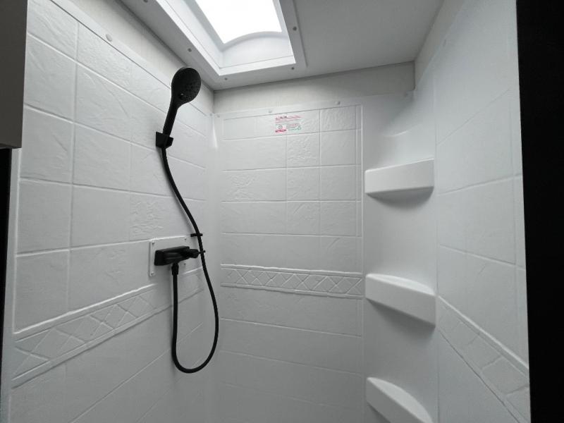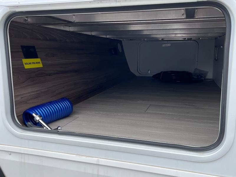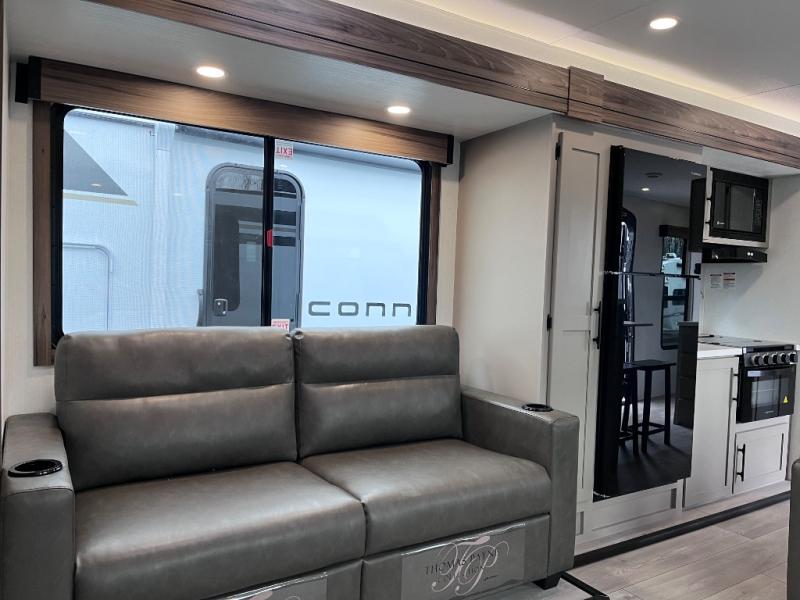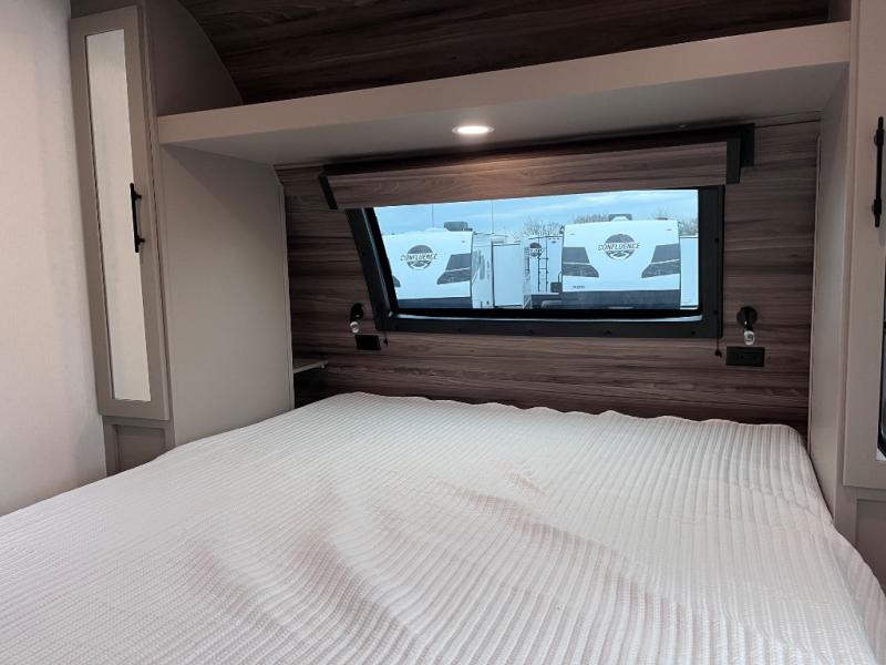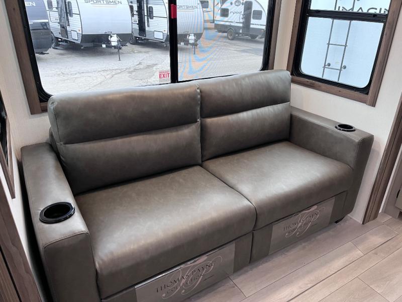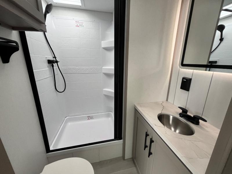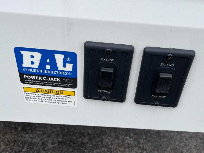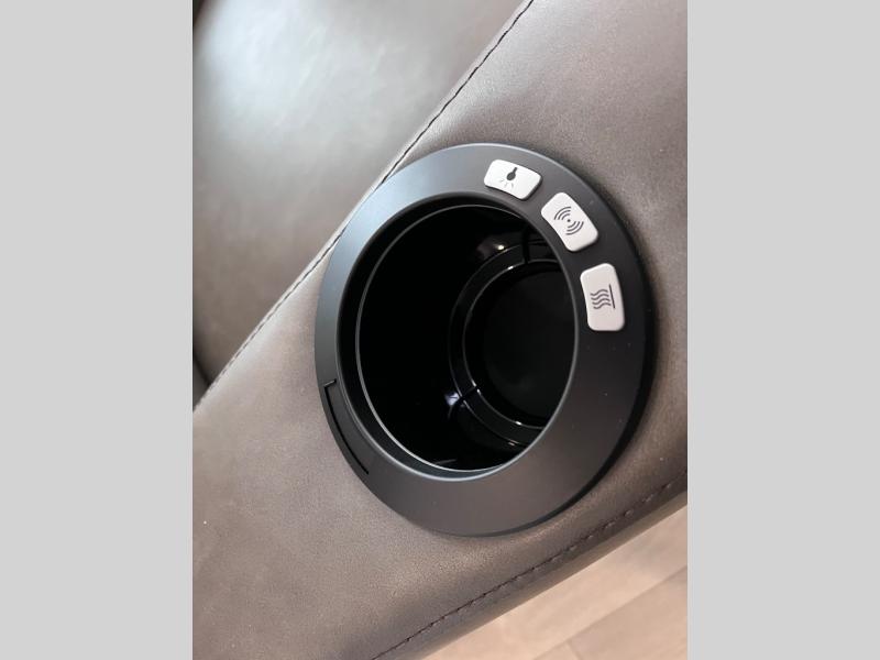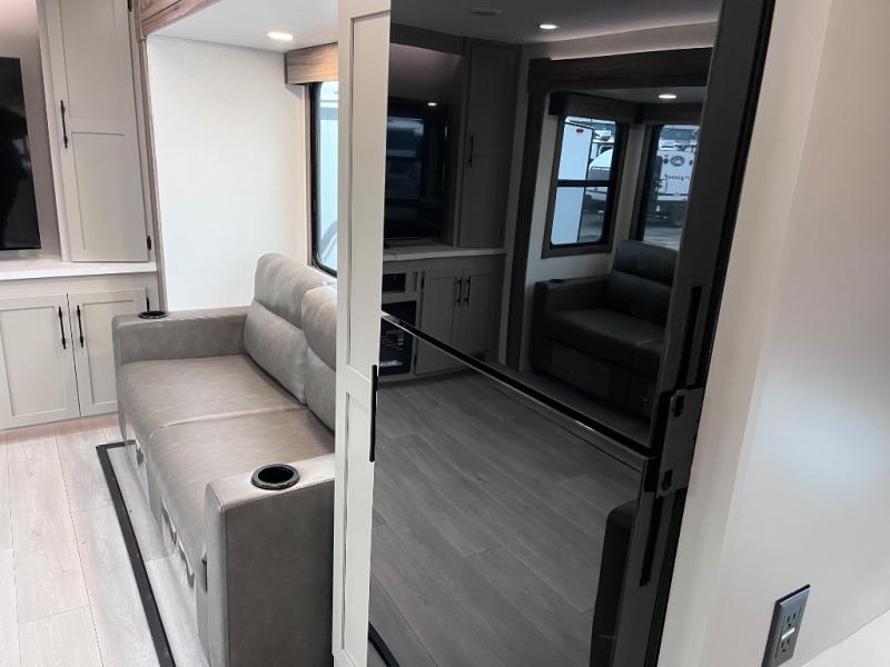 Head for the hills, lake, or woods in this spacious travel trailer. Once your gear is unloaded from the pass-through storage, set up the 19' power awning with LED lights and relax with a cold drink. Once you head inside you can make lunch on the three burner range and dine at the dinette that includes two chairs and bench seating. The rear living area includes a rear entertainment center with an LED TV and a 34" fireplace for a cozy atmosphere. There is also theater seating here and two 70" sofas within the dual opposing slides where your guests can sleep. And you will enjoy the front private bedroom with a king bed all to yourselves!