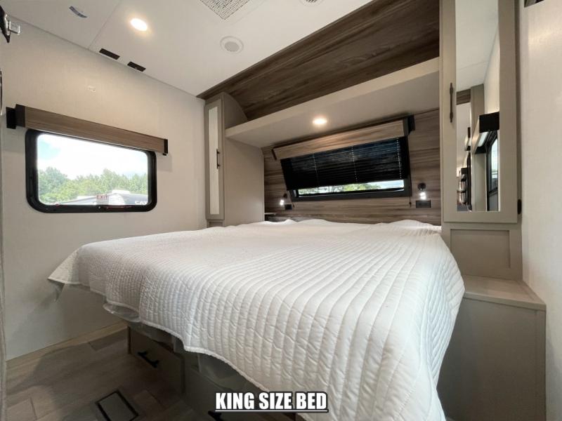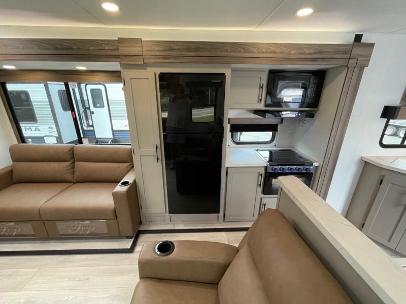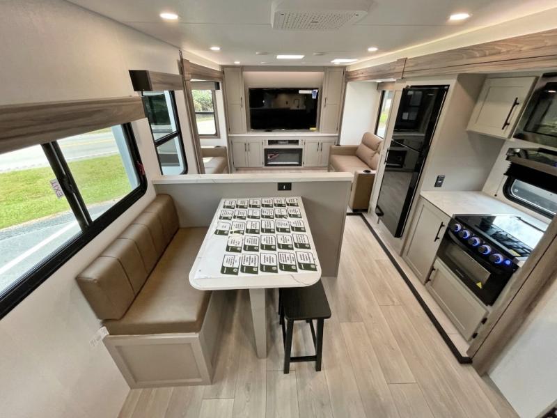 Head for the hills, lake, or woods in this spacious travel trailer. Once your gear is unloaded from the pass-through storage, set up the 19' power awning with LED lights and relax with a cold drink. Once you head inside you can make lunch on the three burner range and dine at the dinette that includes two chairs and bench seating. The rear living area includes a rear entertainment center with an LED TV and a 34" fireplace for a cozy atmosphere. There is also theater seating here and two 70" sofas within the dual opposing slides where your guests can sleep. And you will enjoy the front private bedroom with a king bed all to yourselves!