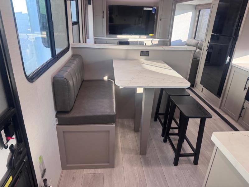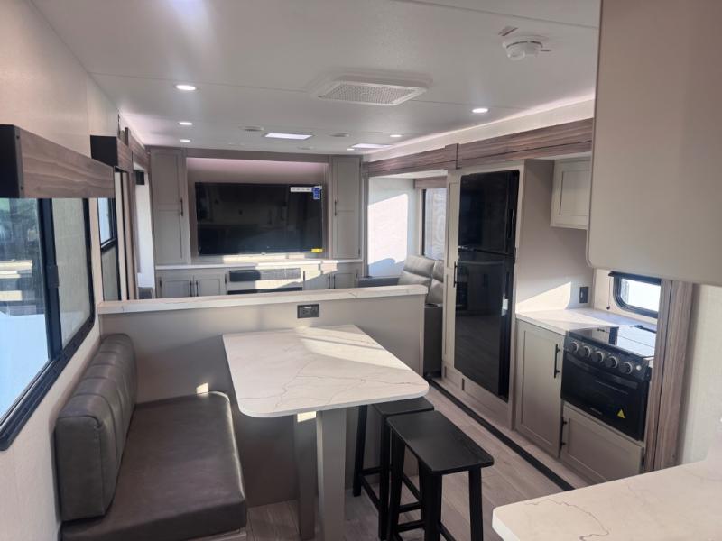 Head for the hills, lake, or woods in this spacious travel trailer. Once your gear is unloaded from the pass-through storage, set up the 19' power awning with LED lights and relax with a cold drink. Once you head inside you can make lunch on the three burner range and dine at the dinette that includes two chairs and bench seating. The rear living area includes a rear entertainment center with an LED TV and a 34" fireplace for a cozy atmosphere. There is also theater seating here and two 70" sofas within the dual opposing slides where your guests can sleep. And you will enjoy the front private bedroom with a king bed all to yourselves!