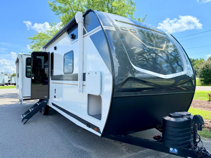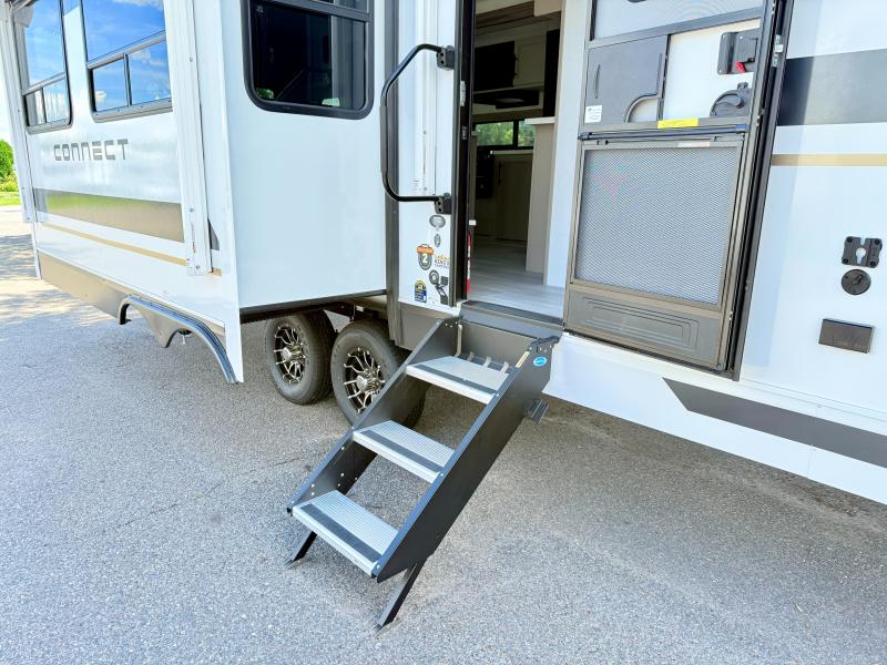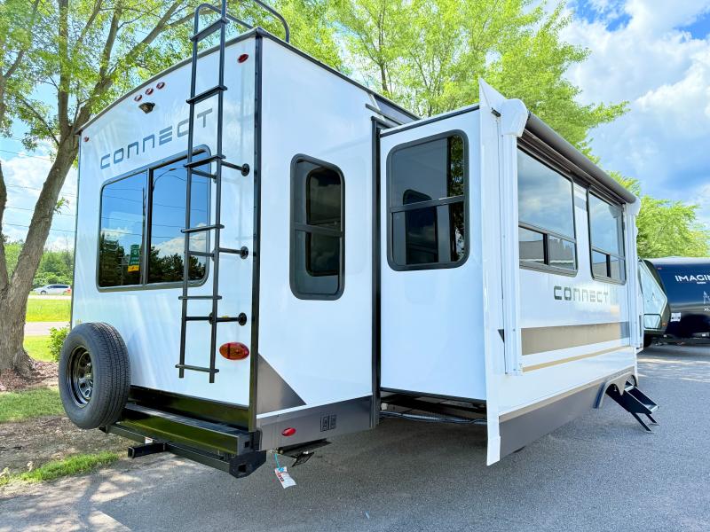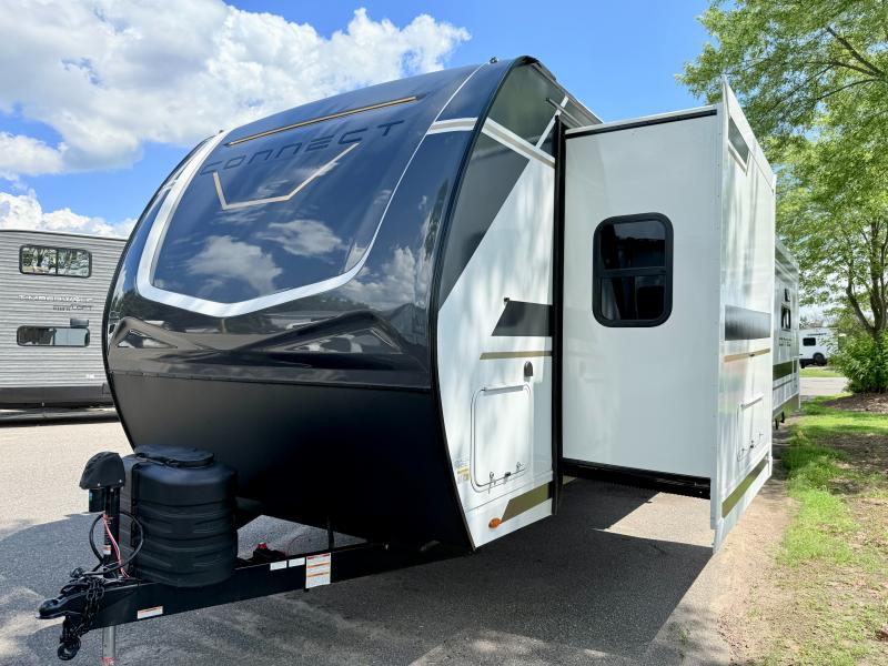 How about a nice afternoon of relaxing on the lake and then rinsing off in the 30" x 36" shower on this Connect travel trailer? After you get clean, you can grab a fresh change of clothes from the front walk-in closet and dresser in the private bedroom. The bedroom also has an area prepped for a washer and dryer and a king bed slide. Out in the main living area, you'll be able to prepare a meal without much effort at all since this trailer has a three-burner range, a microwave, a 10 cu. ft. 12V refrigerator, and a kitchen island for more prep space. You can even have your friends sit on the 70" sofa, theater seating, and booth dinette to chat with you while you finish the meal. You all will also benefit from the two electric awnings with LED lights on the exterior.