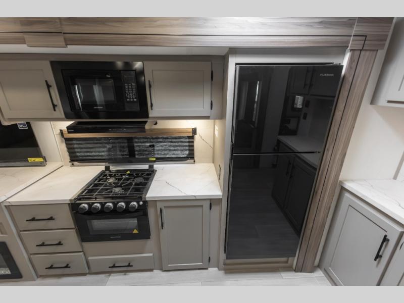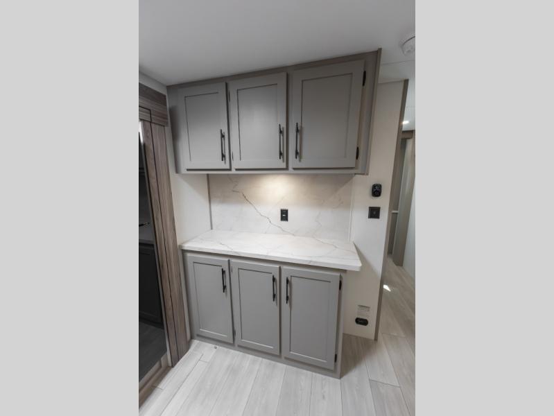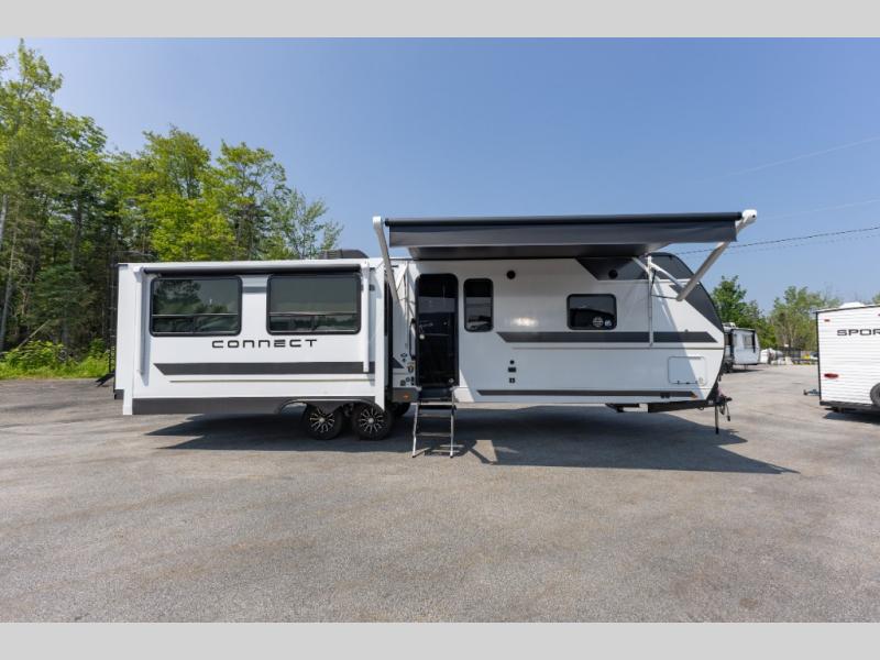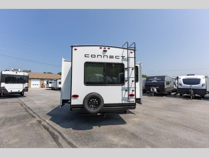 How about a nice afternoon of relaxing on the lake and then rinsing off in the 30" x 36" shower on this Connect travel trailer? After you get clean, you can grab a fresh change of clothes from the front walk-in closet and dresser in the private bedroom. The bedroom also has an area prepped for a washer and dryer and a king bed slide. Out in the main living area, you'll be able to prepare a meal without much effort at all since this trailer has a three-burner range, a microwave, a 10 cu. ft. 12V refrigerator, and a kitchen island for more prep space. You can even have your friends sit on the 70" sofa, theater seating, and booth dinette to chat with you while you finish the meal. You all will also benefit from the two electric awnings with LED lights on the exterior.