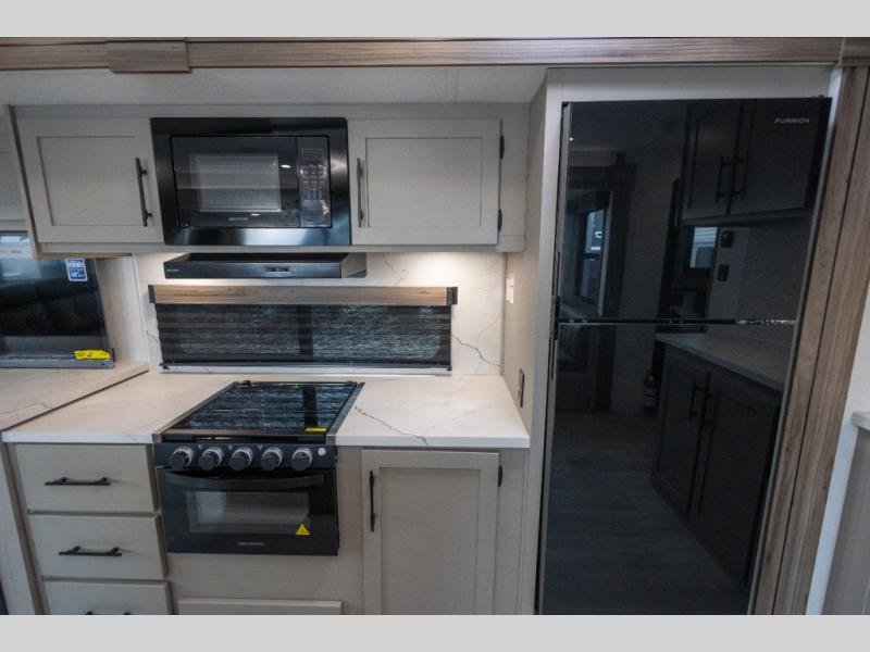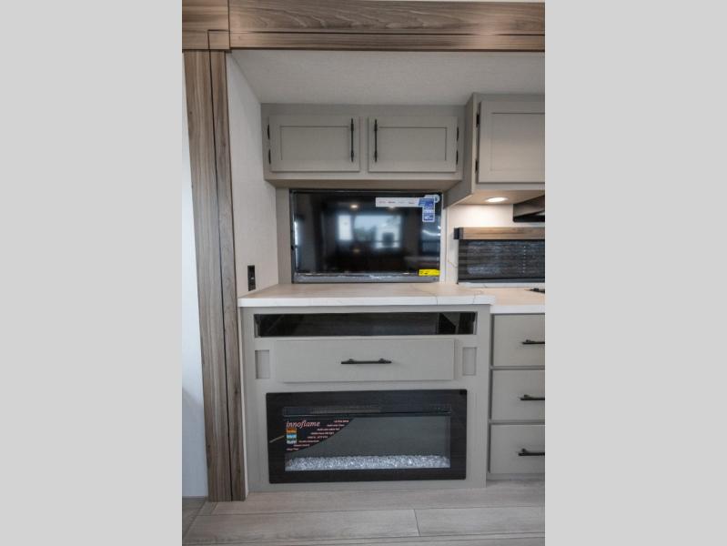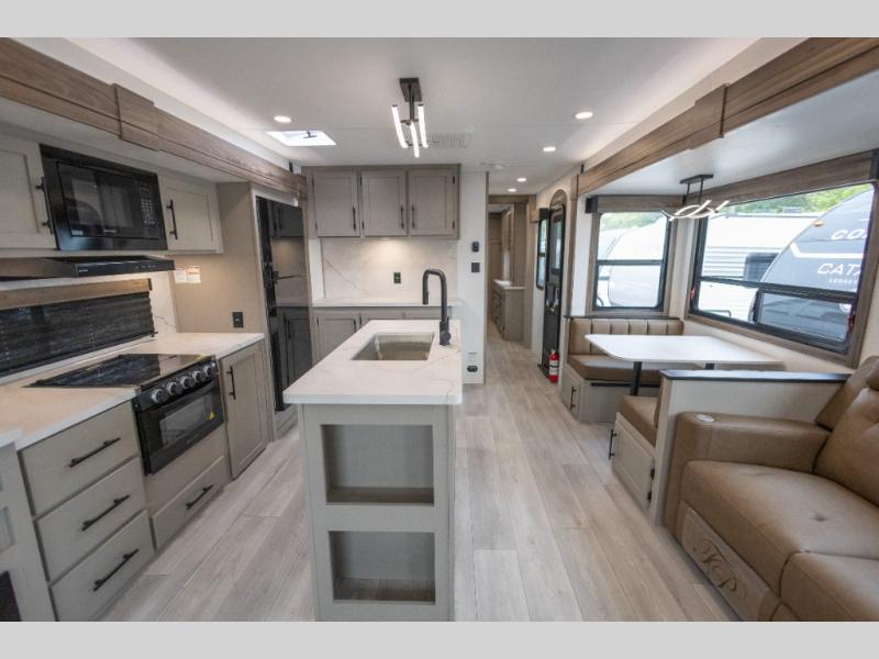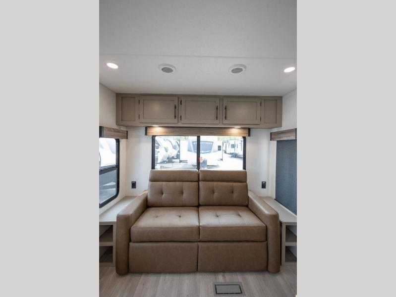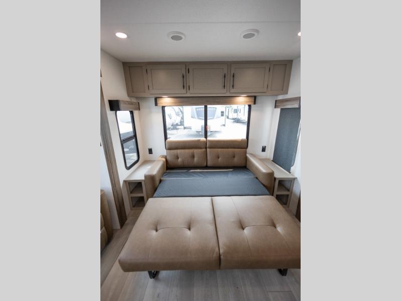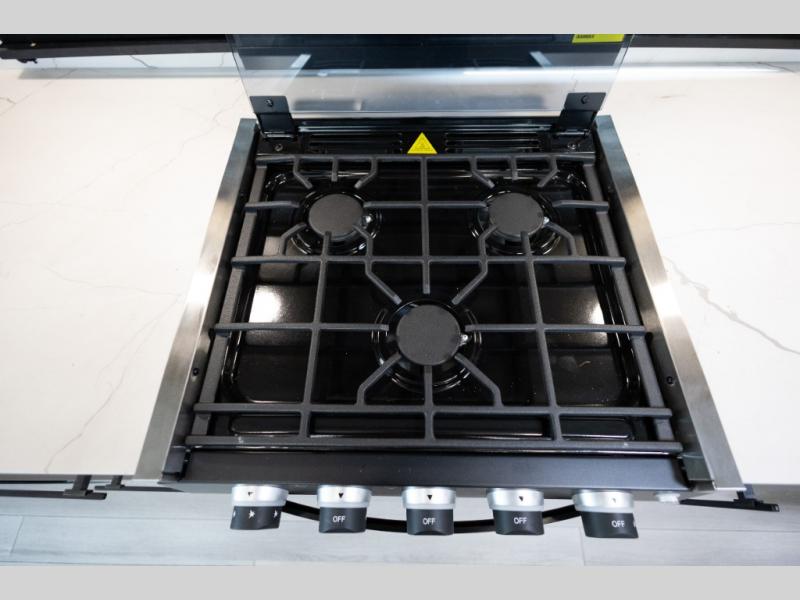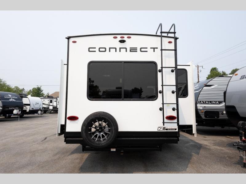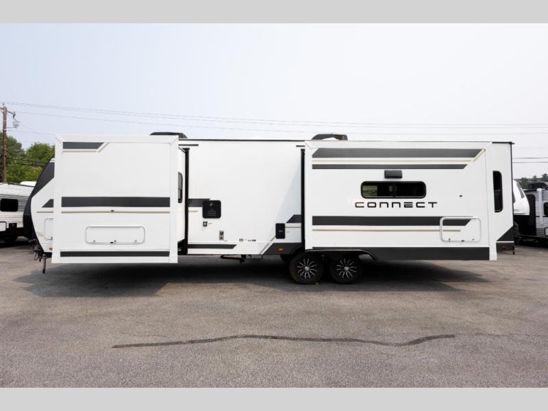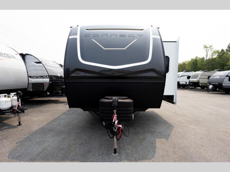 How about a nice afternoon of relaxing on the lake and then rinsing off in the 30" x 36" shower on this Connect travel trailer? After you get clean, you can grab a fresh change of clothes from the front walk-in closet and dresser in the private bedroom. The bedroom also has an area prepped for a washer and dryer and a king bed slide. Out in the main living area, you'll be able to prepare a meal without much effort at all since this trailer has a three-burner range, a microwave, a 10 cu. ft. 12V refrigerator, and a kitchen island for more prep space. You can even have your friends sit on the 70" sofa, theater seating, and booth dinette to chat with you while you finish the meal. You all will also benefit from the two electric awnings with LED lights on the exterior.