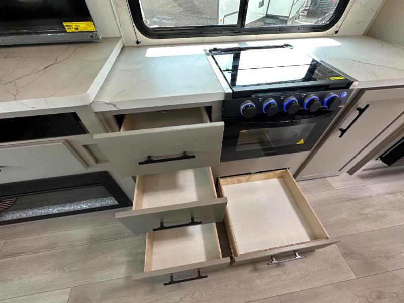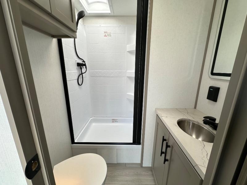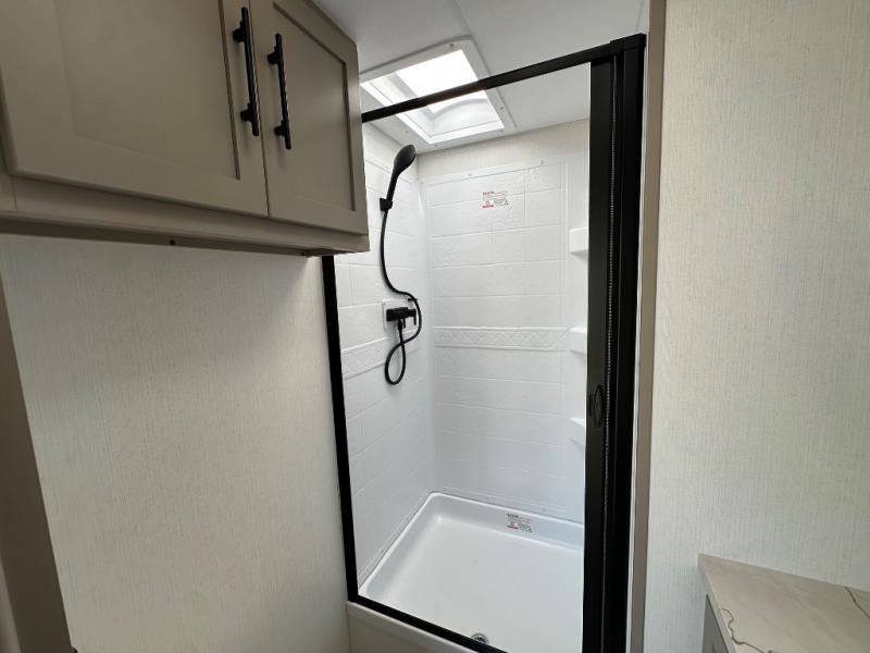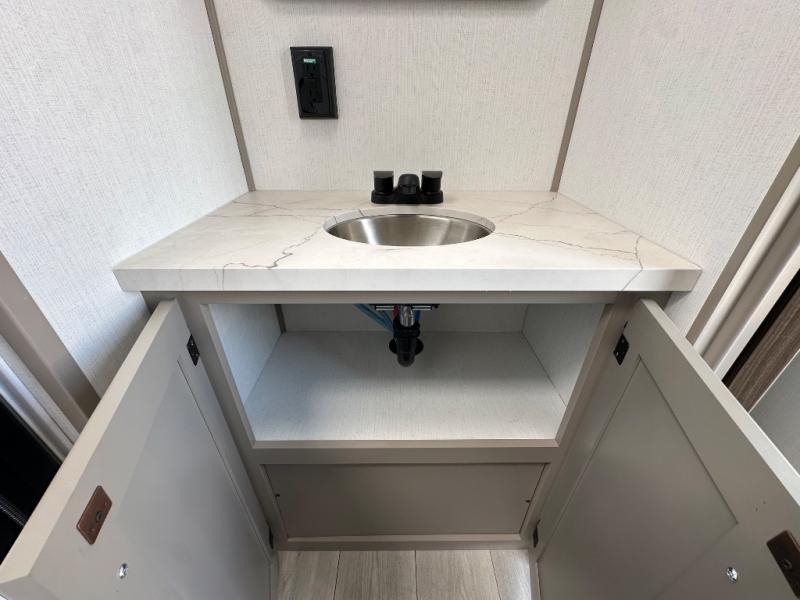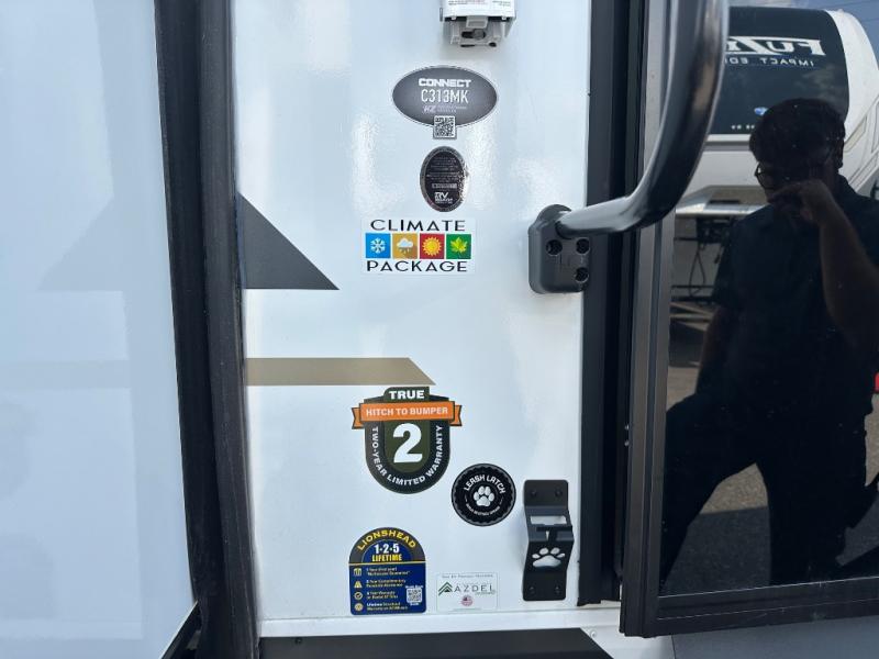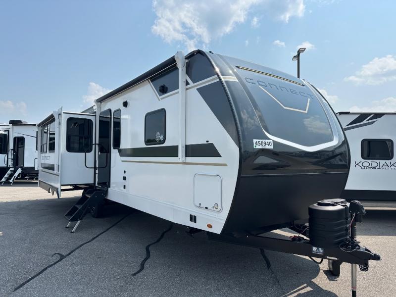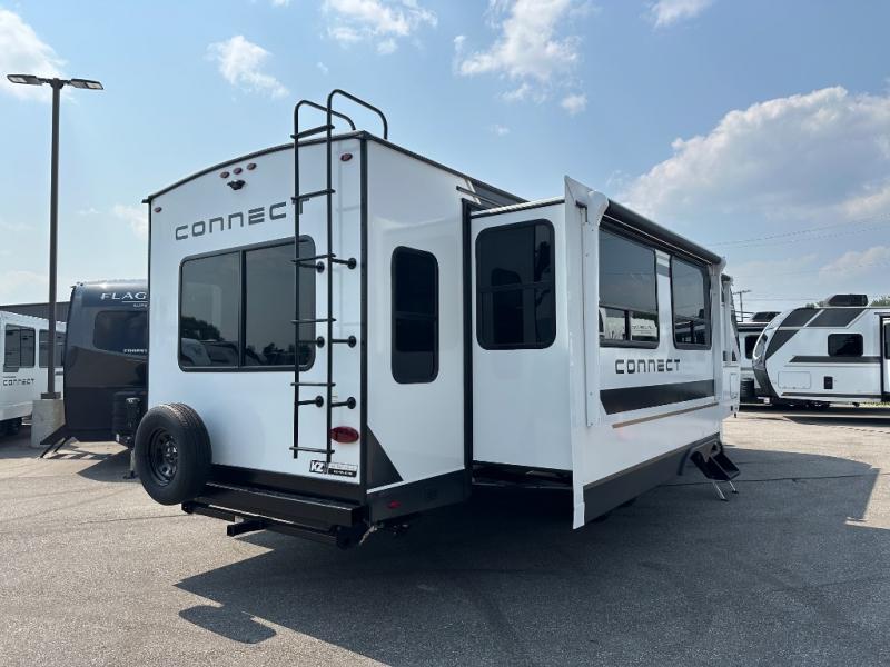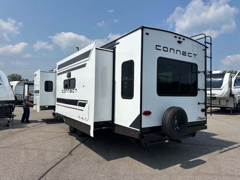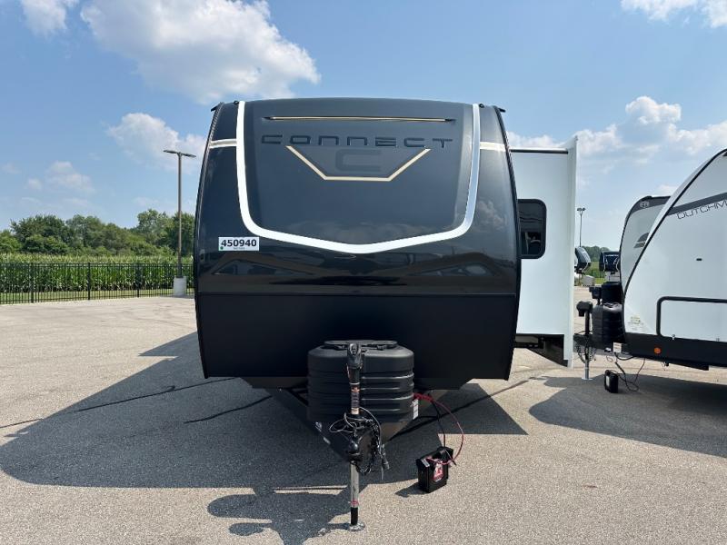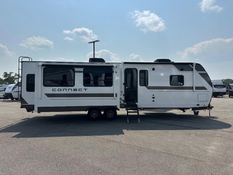 How about a nice afternoon of relaxing on the lake and then rinsing off in the 30" x 36" shower on this Connect travel trailer? After you get clean, you can grab a fresh change of clothes from the front walk-in closet and dresser in the private bedroom. The bedroom also has an area prepped for a washer and dryer and a king bed slide. Out in the main living area, you'll be able to prepare a meal without much effort at all since this trailer has a three-burner range, a microwave, a 10 cu. ft. 12V refrigerator, and a kitchen island for more prep space. You can even have your friends sit on the 70" sofa, theater seating, and booth dinette to chat with you while you finish the meal. You all will also benefit from the two electric awnings with LED lights on the exterior.